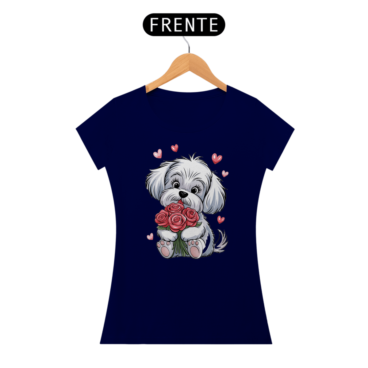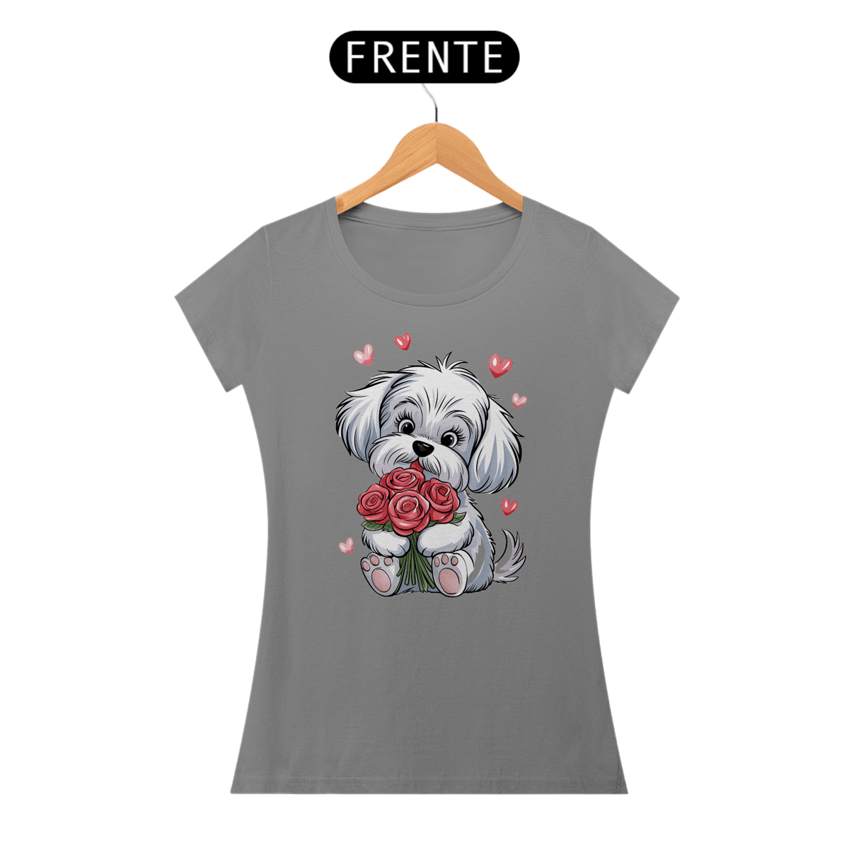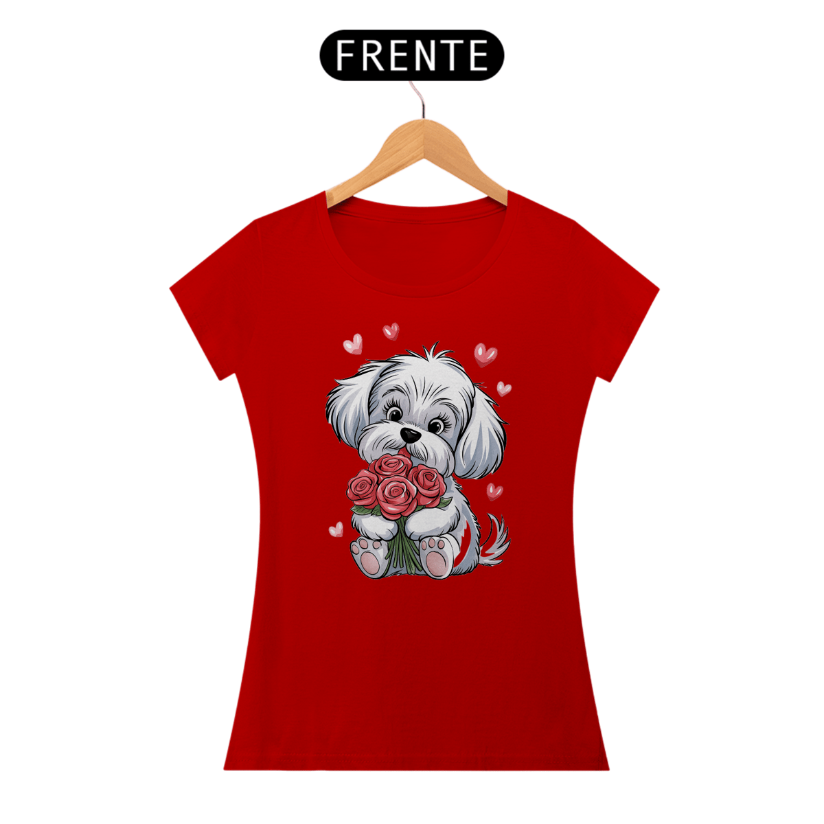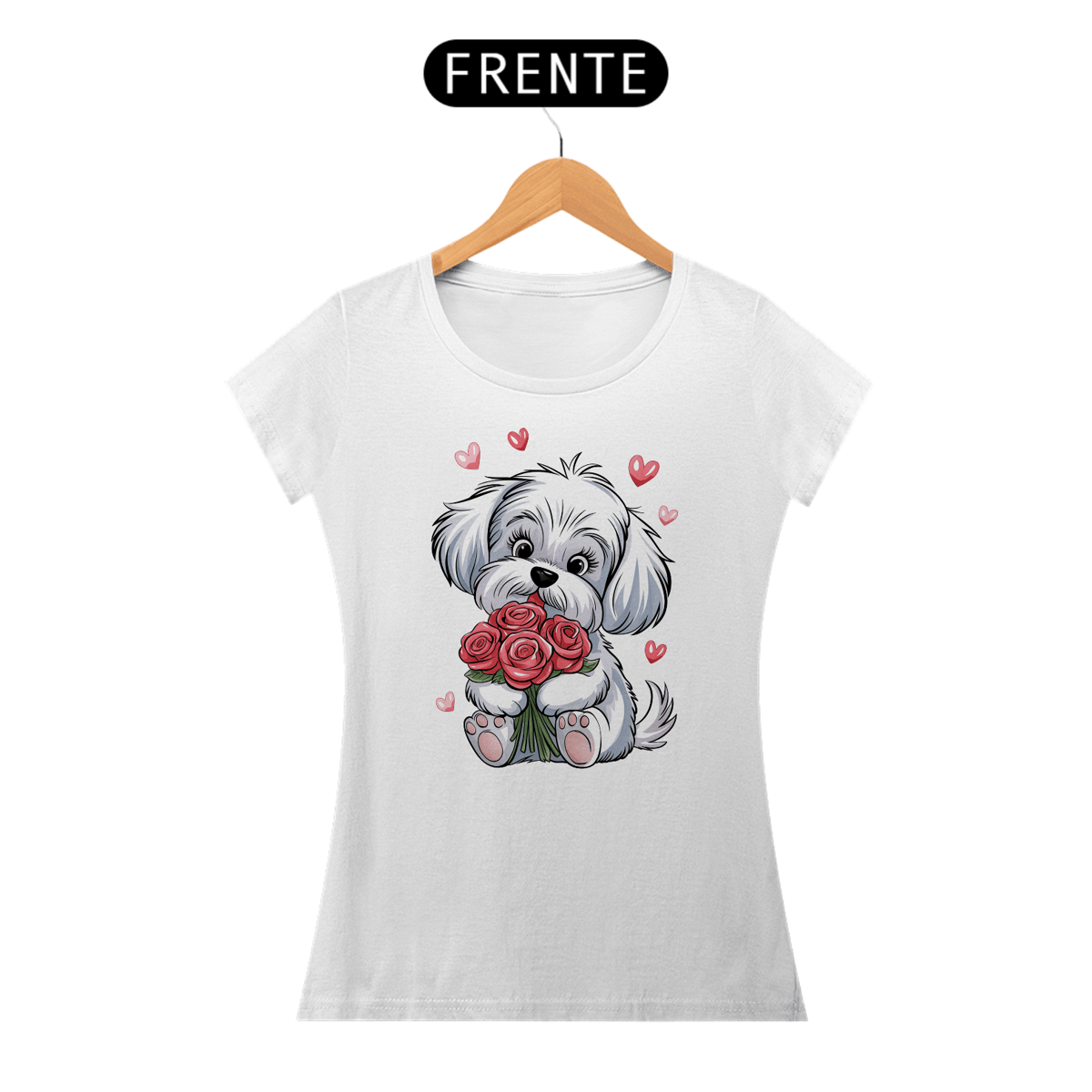 Uma estampa de alta qualidade de um cão branco maltês bonito desenhado à mão no estilo dos desenhos animados do Dia dos Namorados segurando um buquê de rosas vermelhas. Há pequenos corações vermelhos e rosas ao redor.
