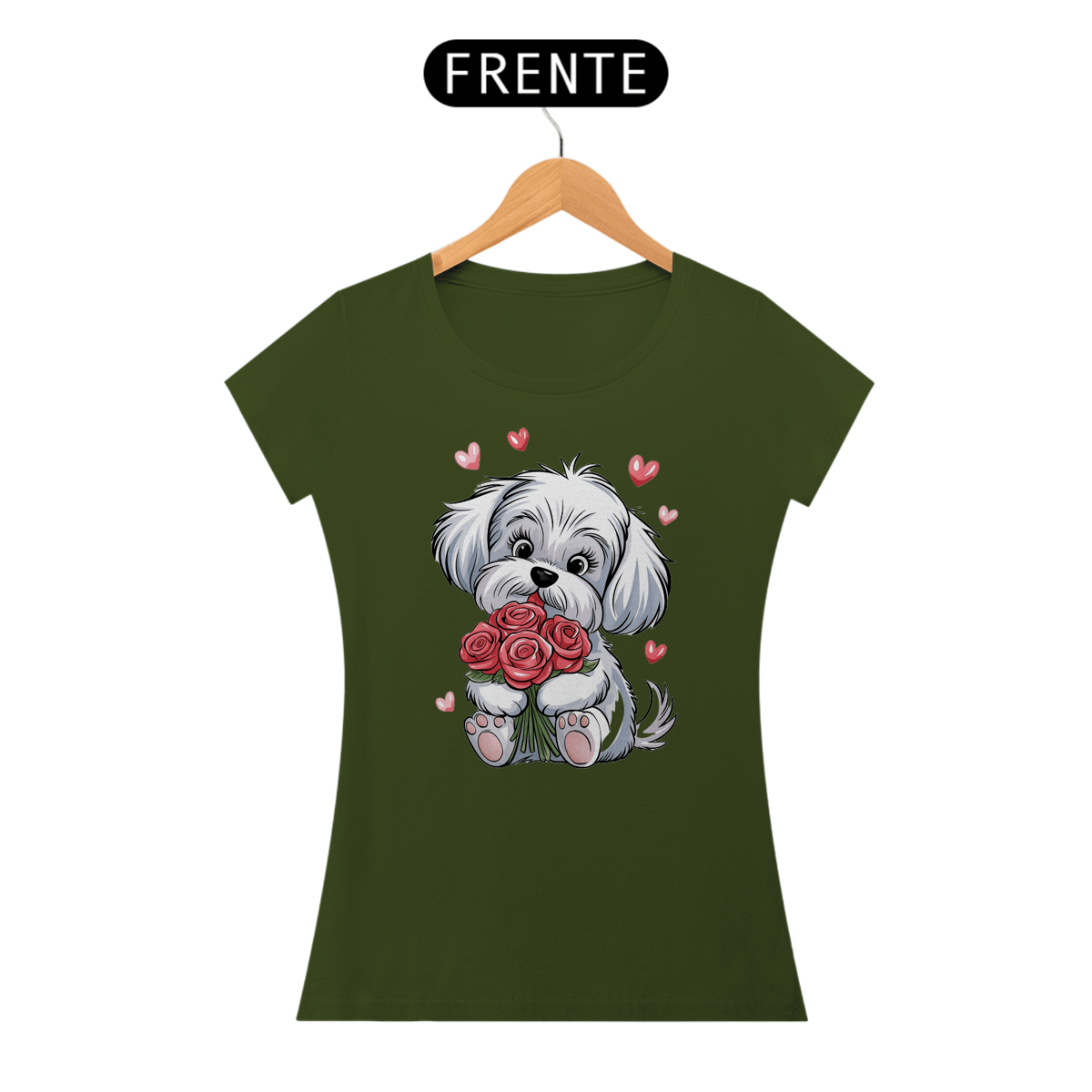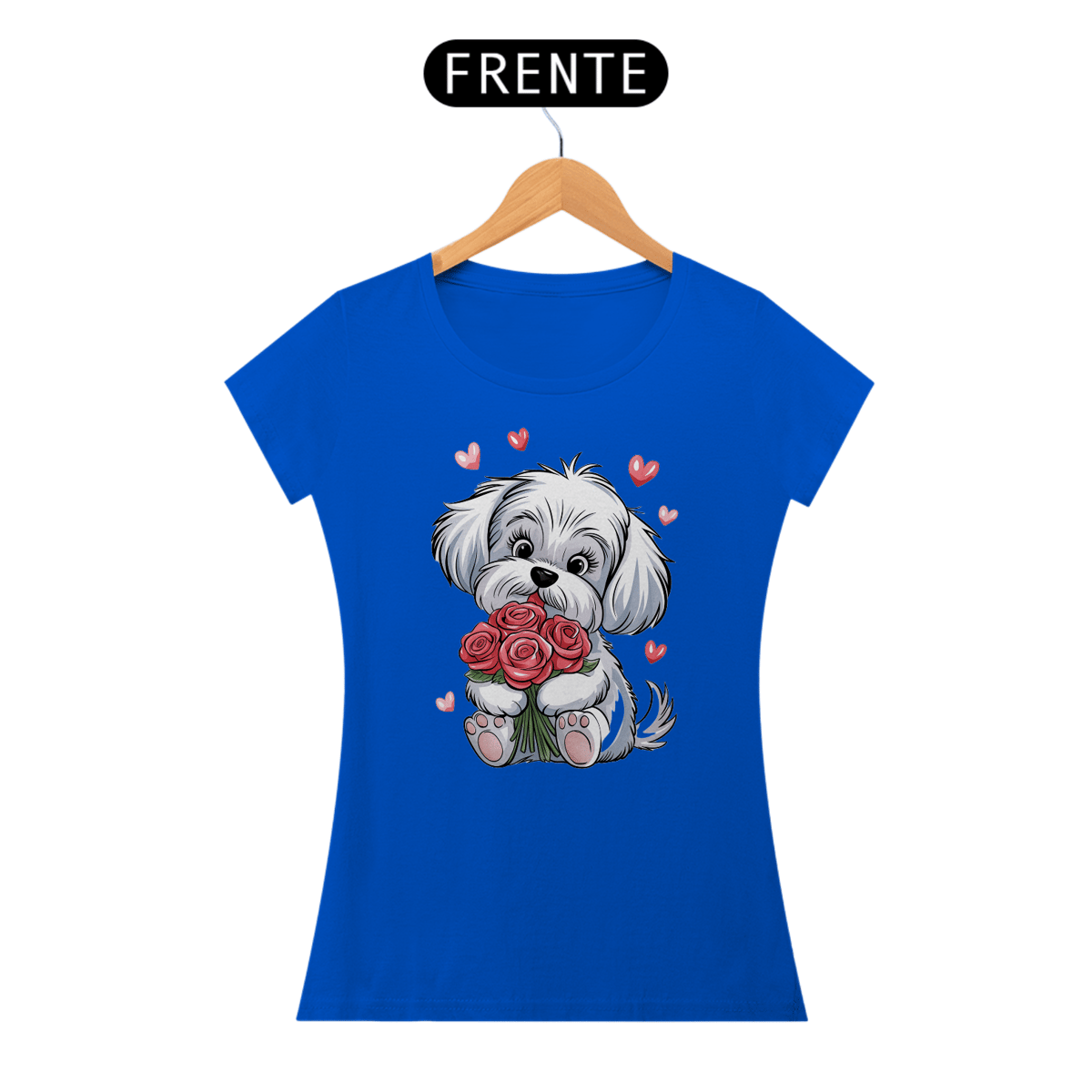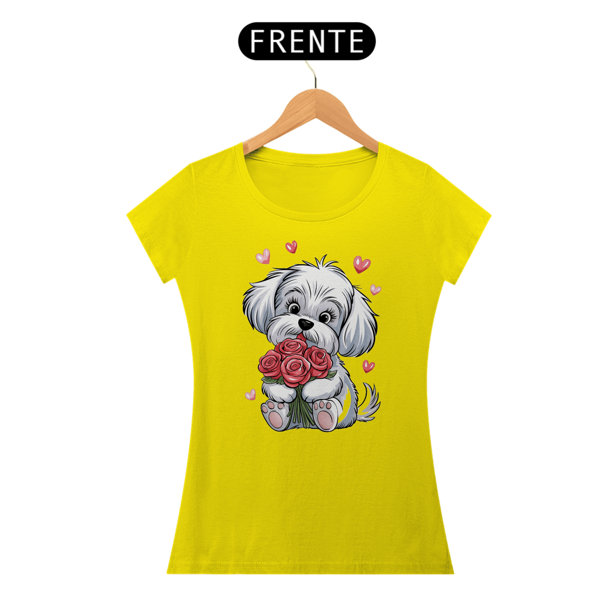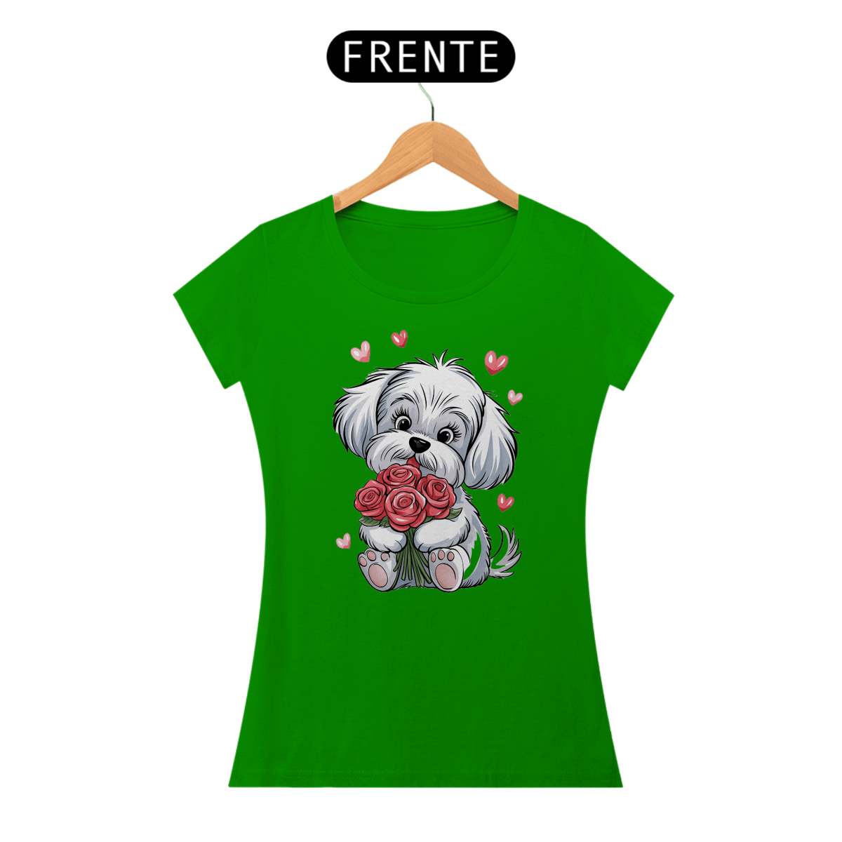 Uma estampa de alta qualidade de um cão branco maltês bonito desenhado à mão no estilo dos desenhos animados do Dia dos Namorados segurando um buquê de rosas vermelhas. Há pequenos corações vermelhos e rosas ao redor.