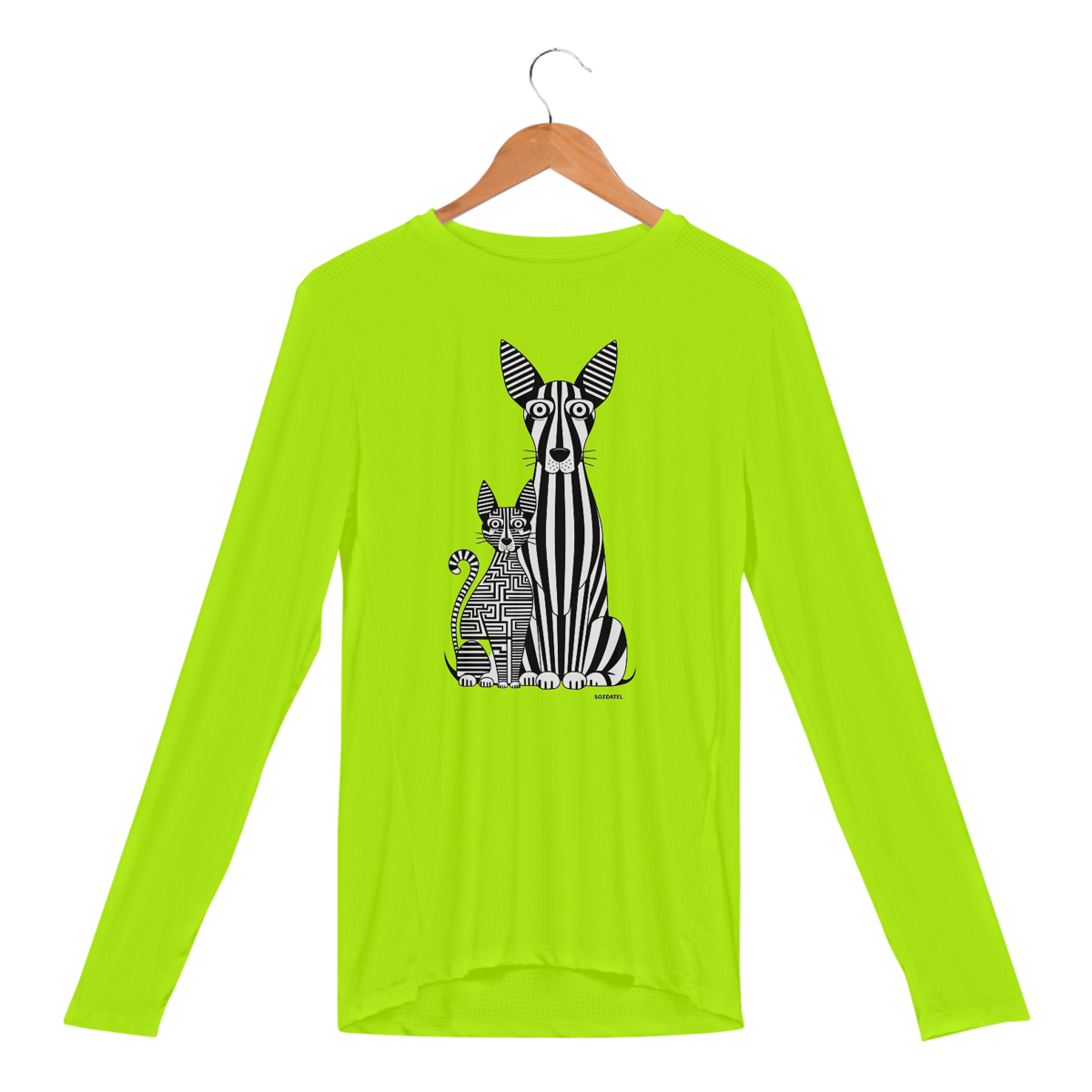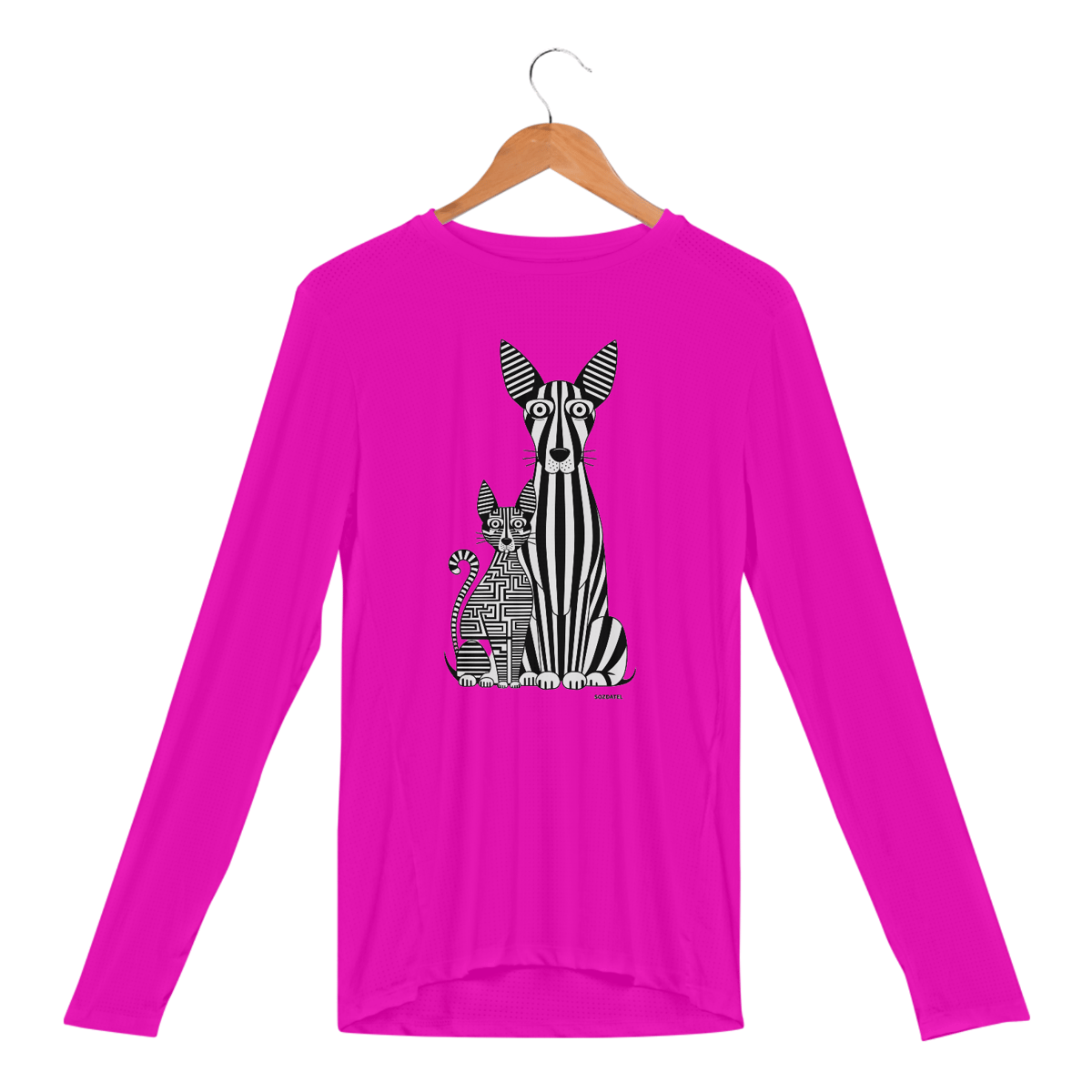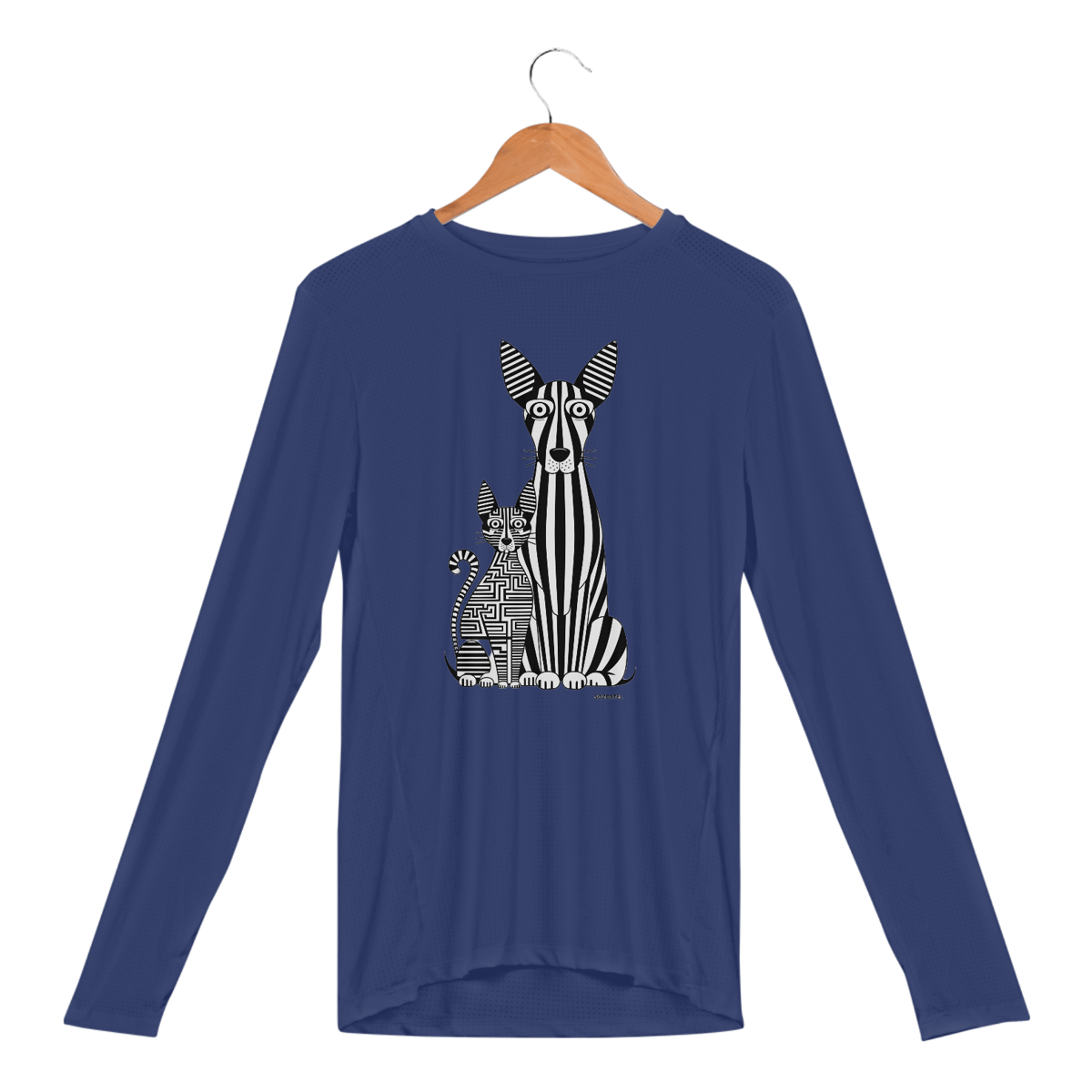 Uma estampa de  um cão e um gato alongados. O cão, com listras verticais que lembram um código de barras, tem olhos grandes e orelhas triangulares, enquanto o gato é formado por um labirinto complexo de linhas horizontais e verticais. Ambos os animais exibem seus olhos grandes e orelhas triangulares característicos, criando um design visualmente estimulante e único. O esquema de cores monocromático acrescenta simplicidade e sofisticação à arte.