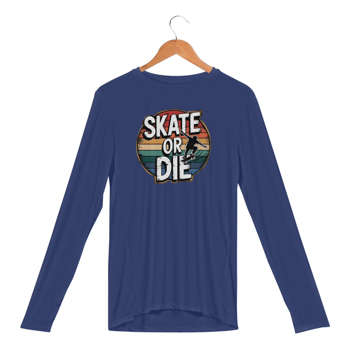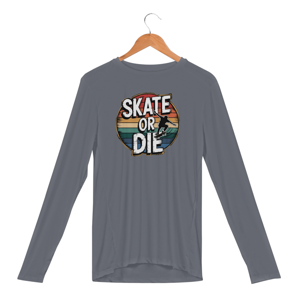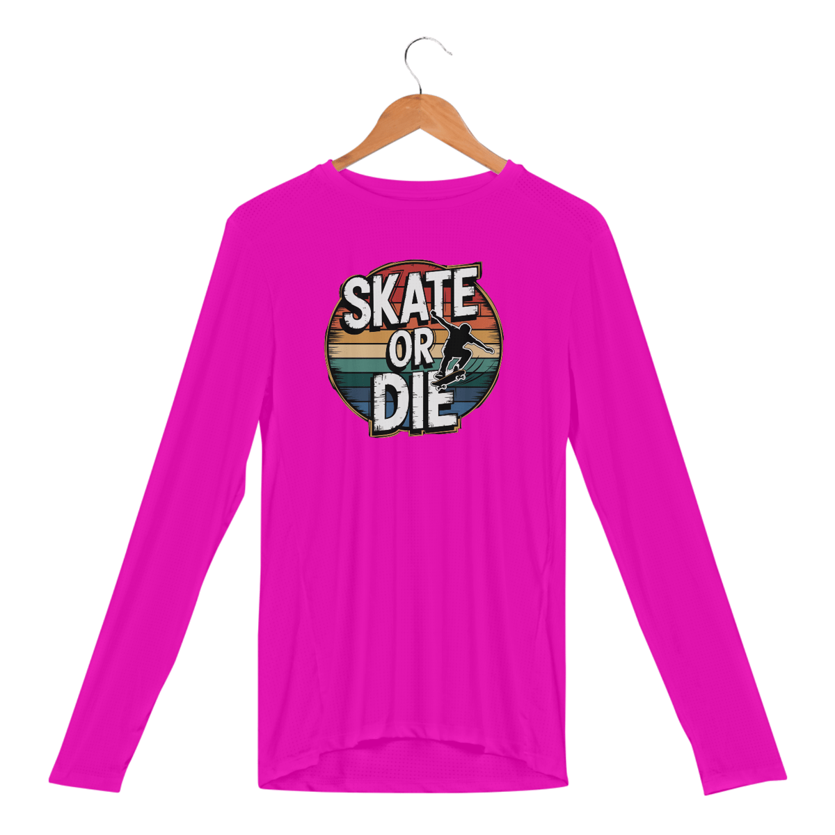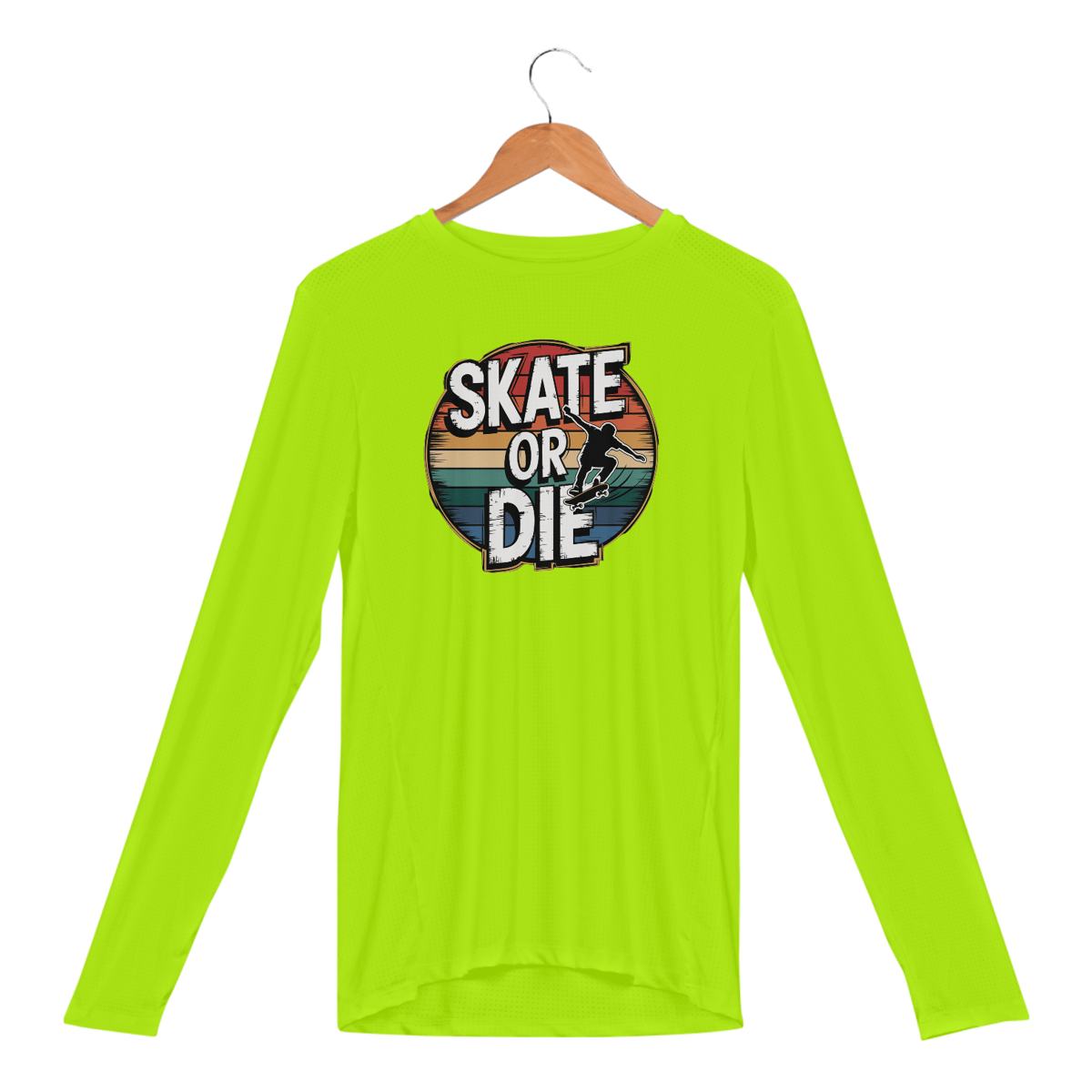 Uma estampa ousada e circular com um skatista no ar, executando um kickflip com estilo sem esforço. A silhueta é dinâmica, com rastros de movimento enfatizando velocidade e habilidade. Ao redor do skatista há um texto circular que diz "SKATE OR DIE" em letras brancas em negrito, dispostos em um estilo vintage e retrô com um visual levemente desgastado. Uma borda fina e dourada contorna o texto, com sombras adicionando profundidade. A composição circular é ainda mais realçada por listras horizontais em tons vibrantes de vermelho, laranja, amarelo, verde e azul, criando uma estética nostálgica e retrô contra um fundo preto.