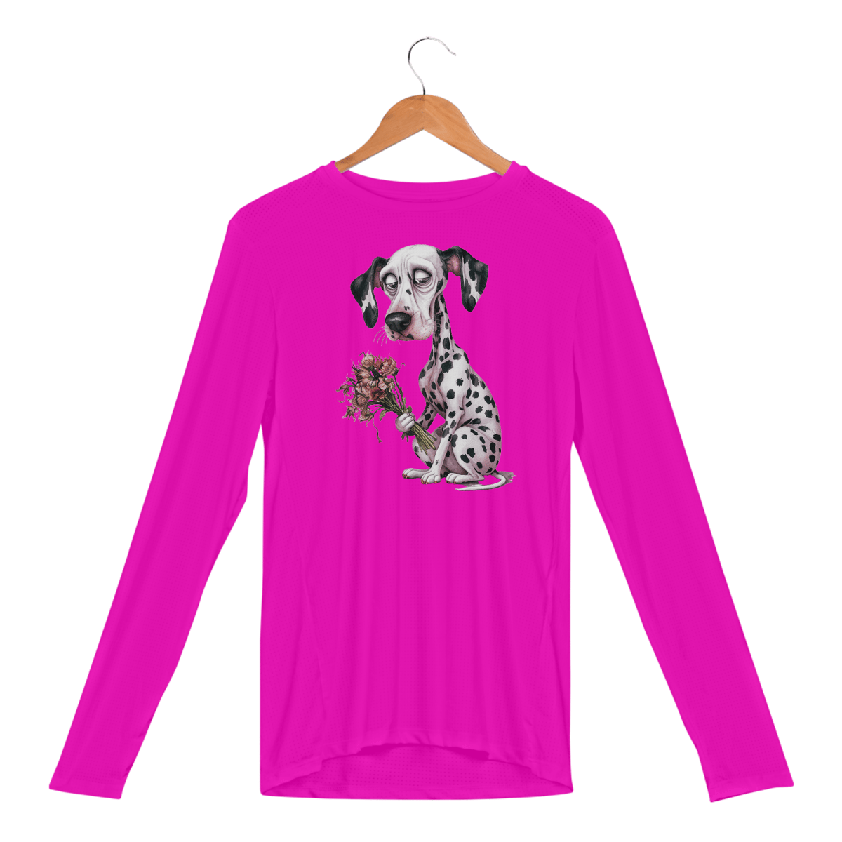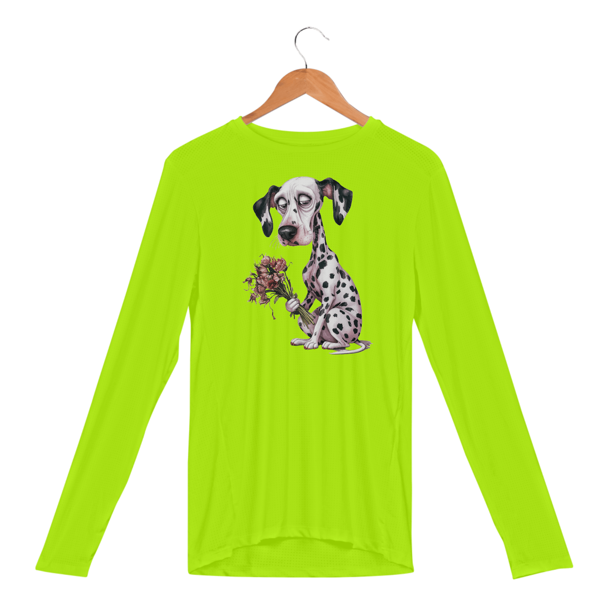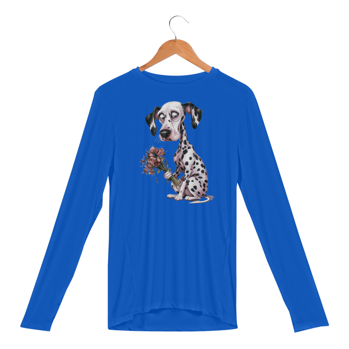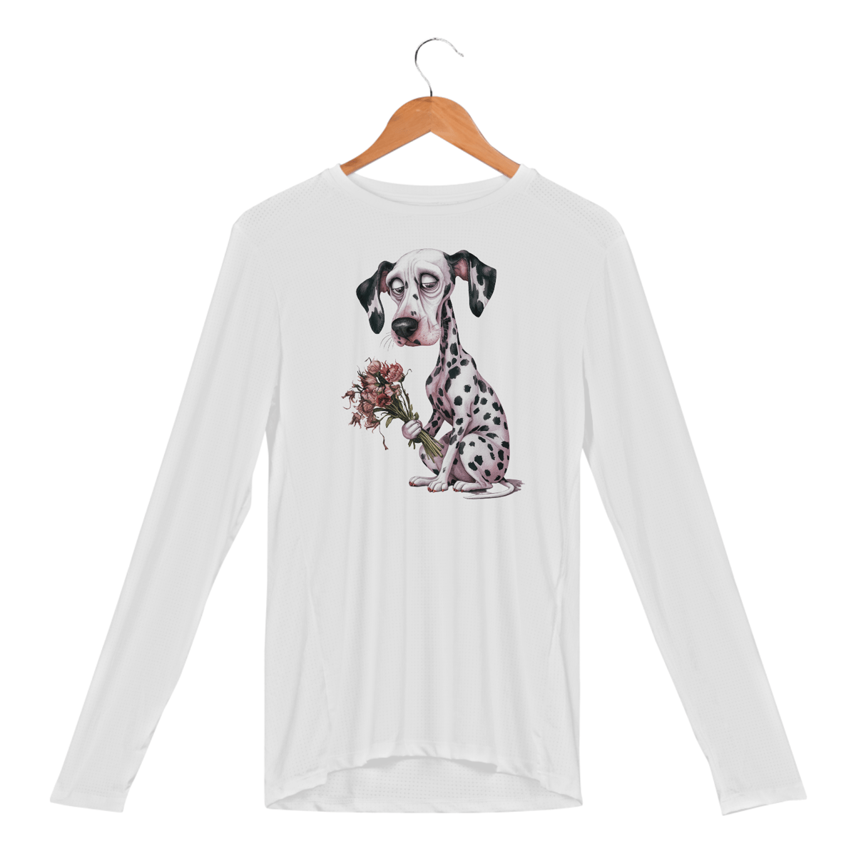 Uma estampa encantadora apresentando um cão dálmata caprichoso e charmoso com um pescoço alongado, cabeça enorme e orelhas grandes, exibindo uma pitada de melancolia através de seus olhos expressivos. O cão exausto e sonolento segura um buquê de flores. O fundo branco puro destaca as cores vibrantes do cão, criando um contraste marcante com o ambiente e enfatizando suas características únicas e cativantes.