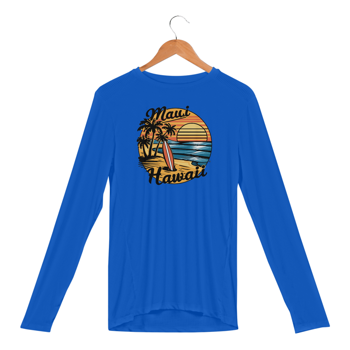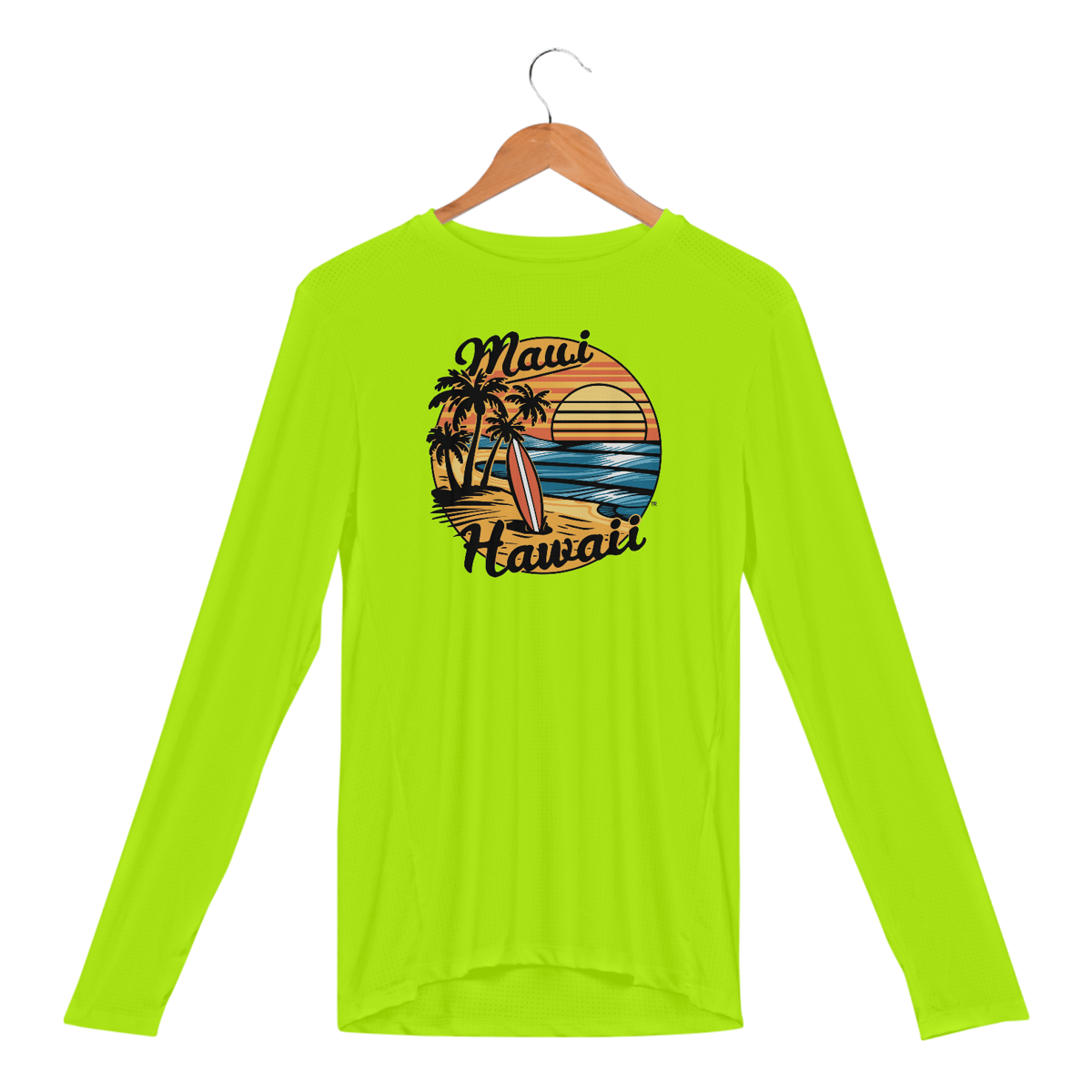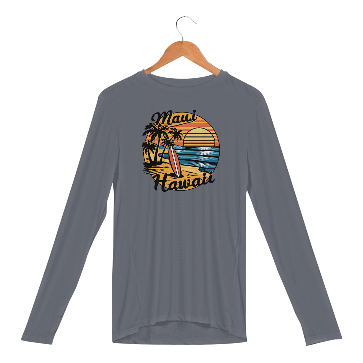 Uma estampa de surfe retrô-vintage com uma cena ensolarada de Maui, Havaí. Palmeiras pontilham a costa dourada, e uma prancha de surf estilosa está plantada na vertical nas areias quentes. O sol se põe em uma paleta de laranjas e amarelos quentes, refletindo seus raios nas ondas azuis cintilantes. O texto "Maui Hawaii" é artisticamente colocado ao redor da composição em uma fonte vintage e retrô.