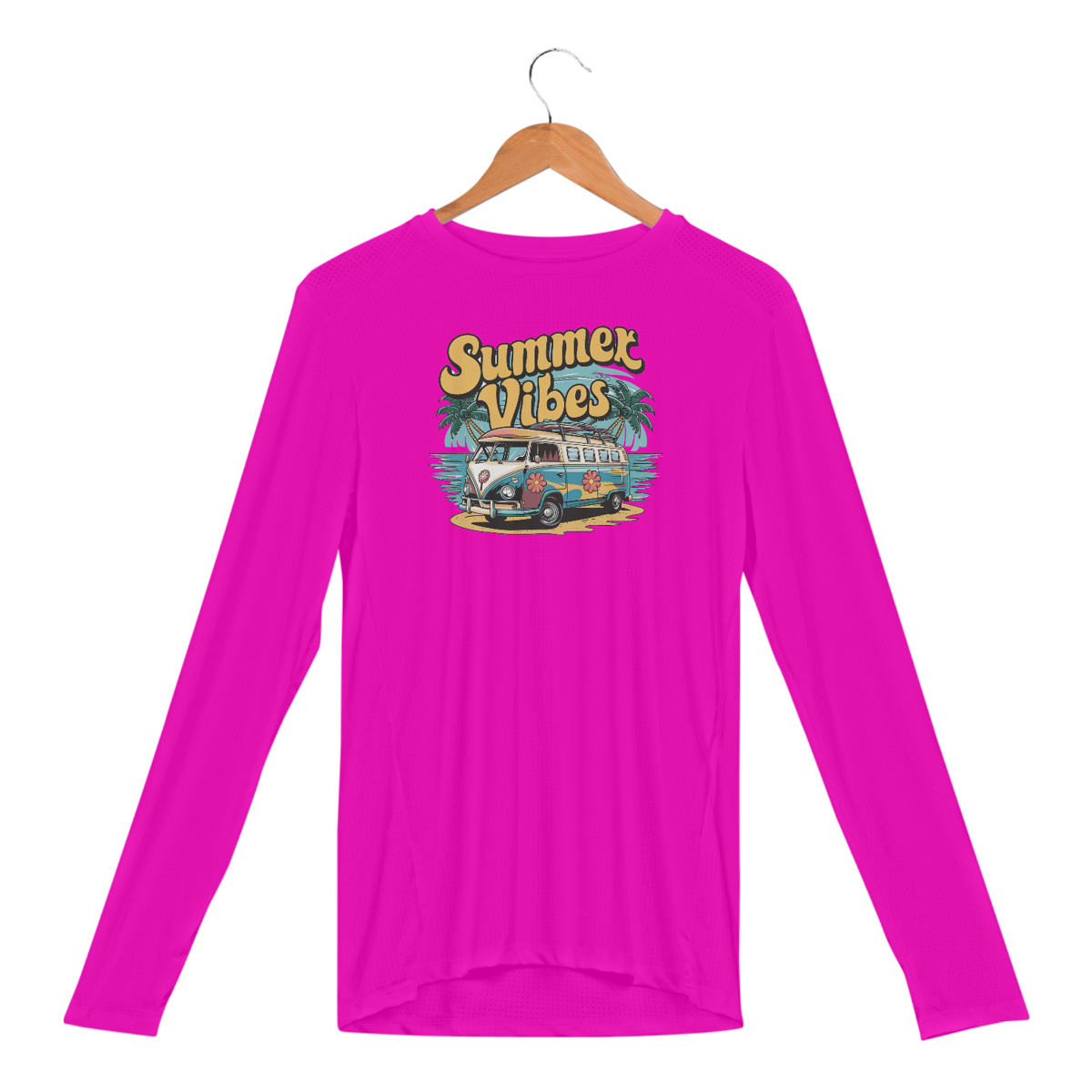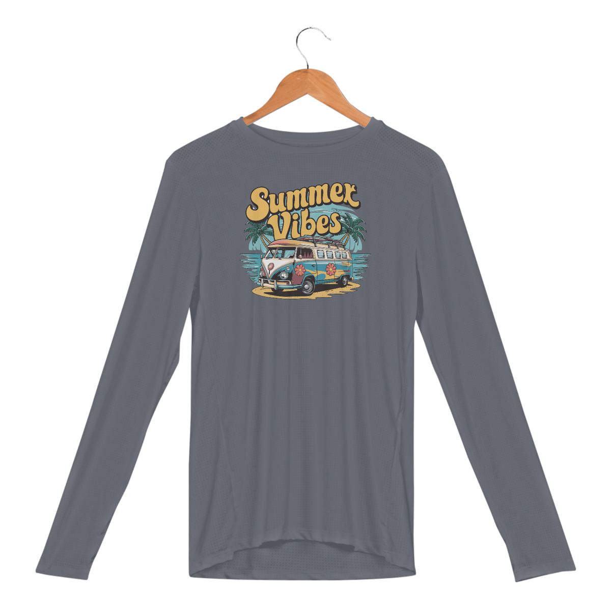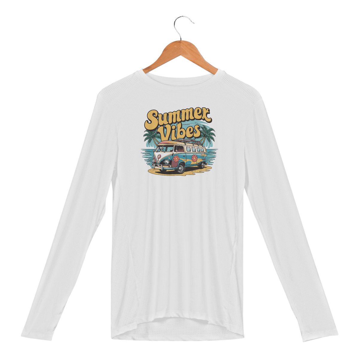 Uma estampa impressionante de uma van de surf estacionada em uma praia ensolarada, com as palavras "Summer Vibes" escritas em uma fonte retrô e descolada. A van tem uma paleta de cores vibrantes e é adornada com suportes para pranchas de surfe e um design florido. O meio termo apresenta palmeiras balançando na brisa e um oceano azul claro com ondas suaves. O design geral é perfeito para uma estampa de camiseta e exala uma atmosfera relaxada.