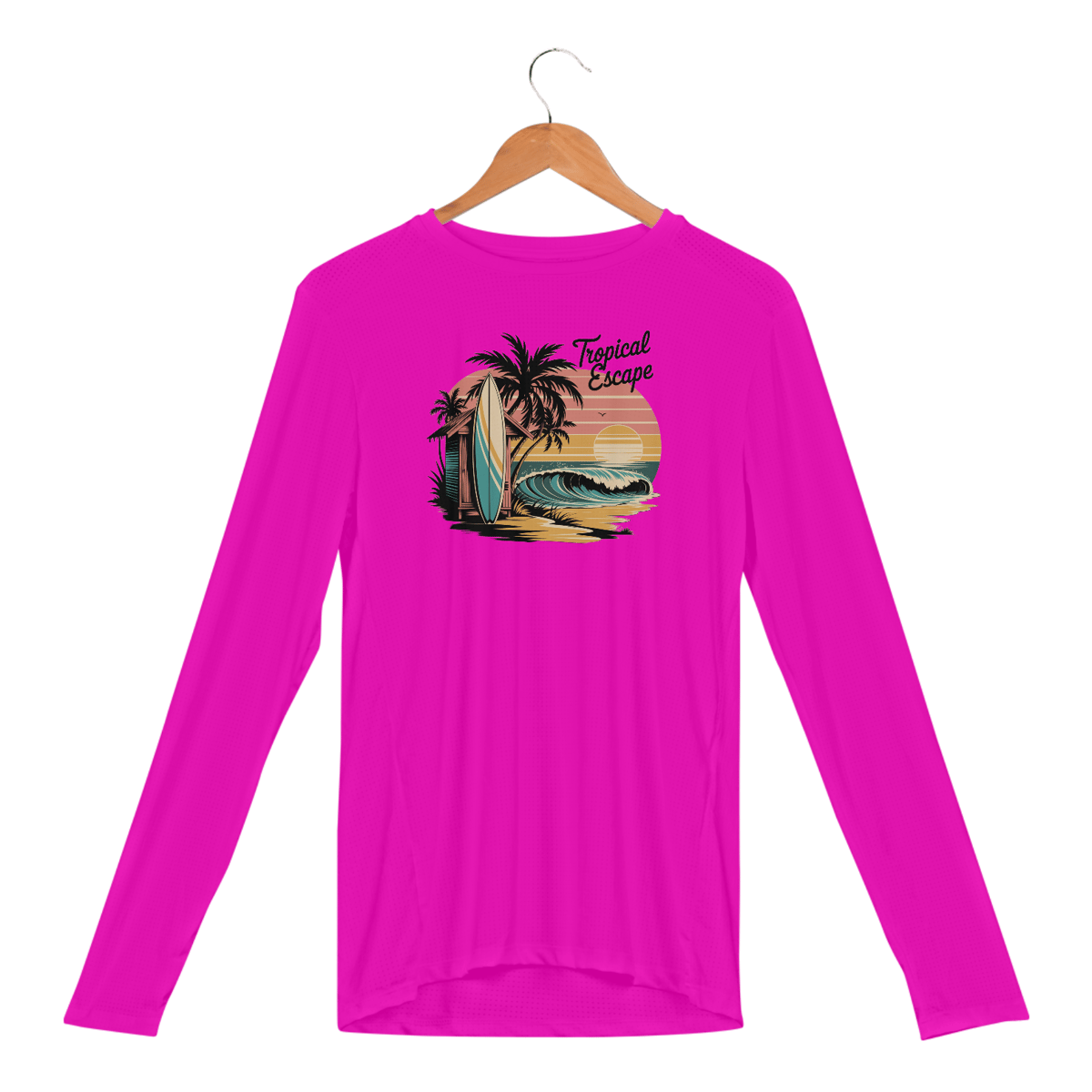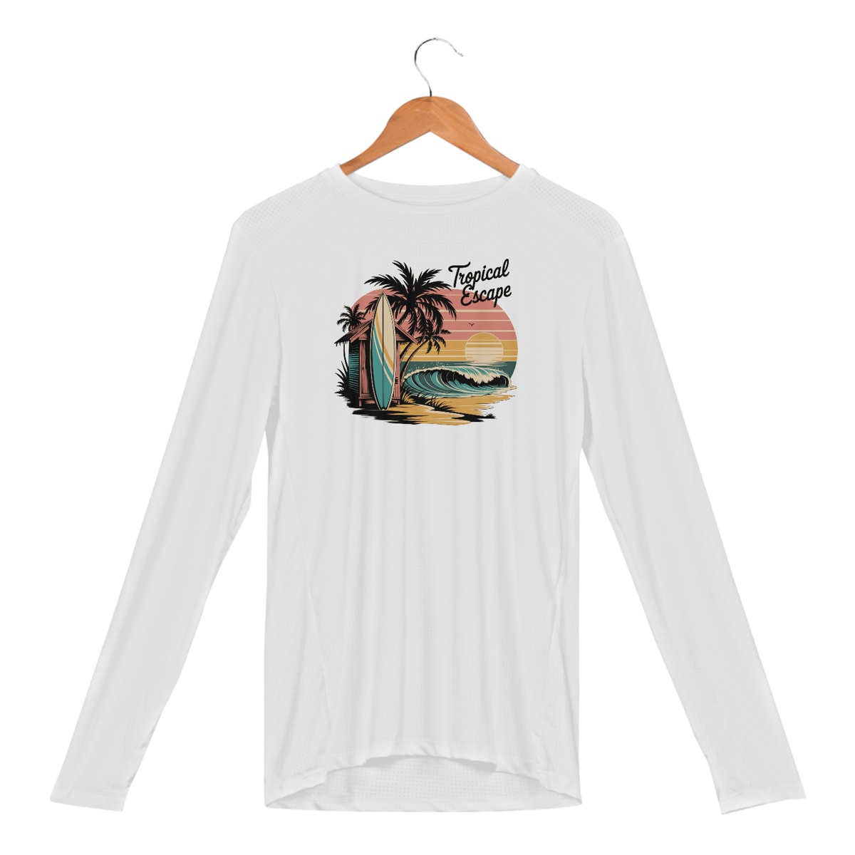 Uma estampa no estilo dos anos 70 de uma fuga de surf tropical. Uma prancha de surf se apoia em uma cabana na praia, com palmeiras balançando e ondas do oceano ao fundo. As cores são pastéis suaves, incluindo rosa claro, turquesa e amarelo areia. Um sol vintage está se pondo ao fundo. A frase "Tropical Escape" está escrita em uma fonte no estilo dos anos 70.