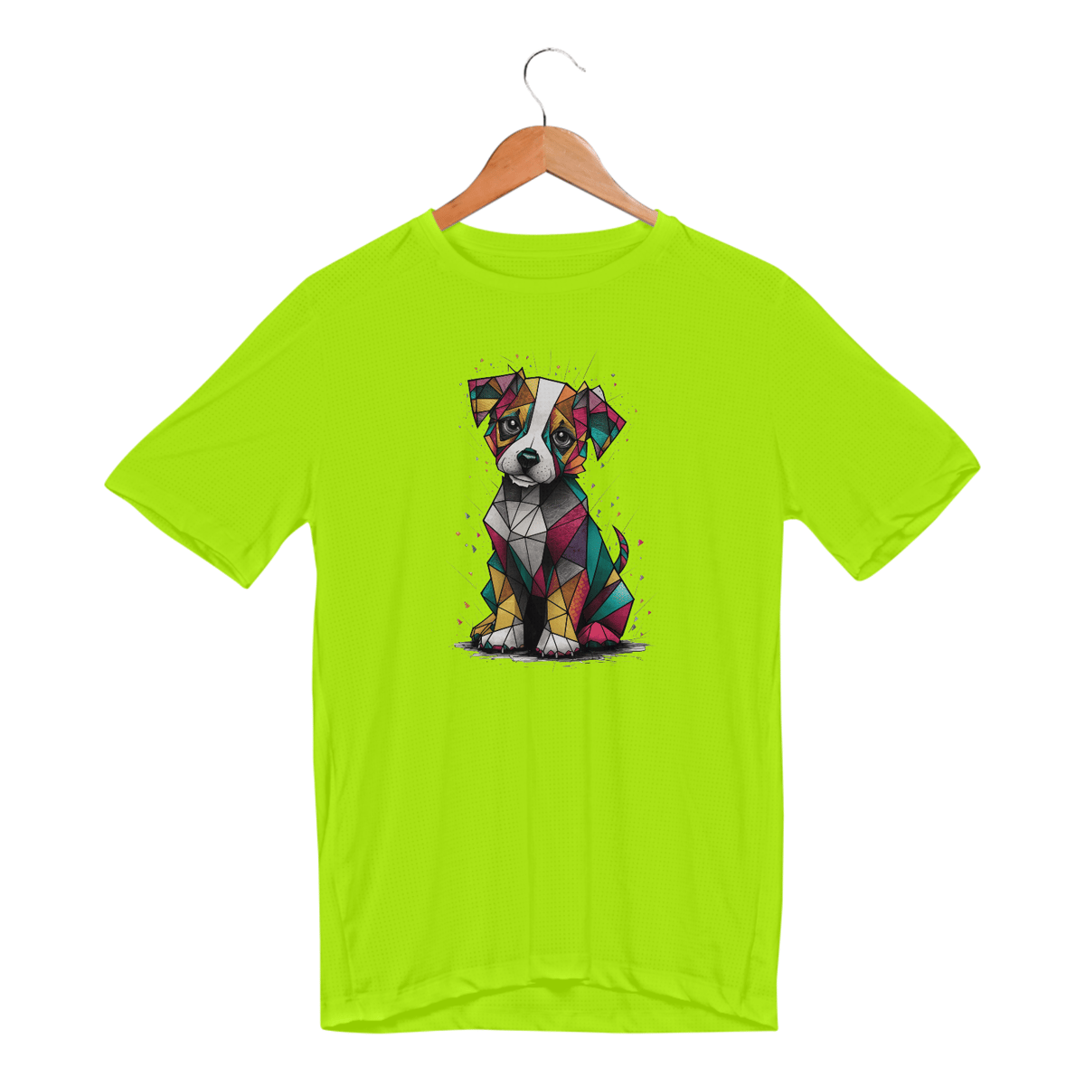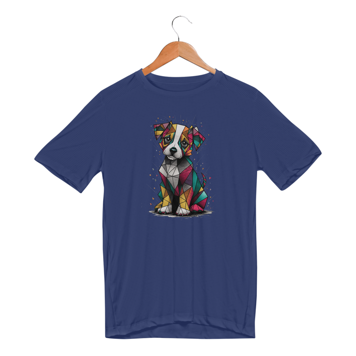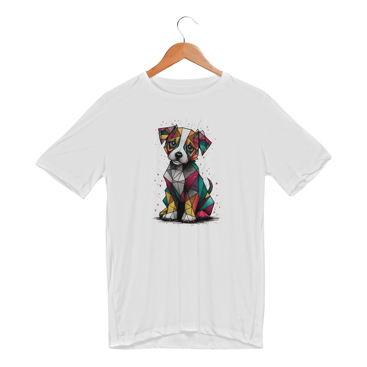 Camiseta Camaleon visualmente deslumbrante e conceitual de um cachorrinho cubista, desenhado com precisão excepcional. O cachorrinho, feito de formas geométricas, é uma mistura vibrante de cores e padrões, criando um design lúdico e atraente. Seus olhos expressivos são detalhados echeios de vida.