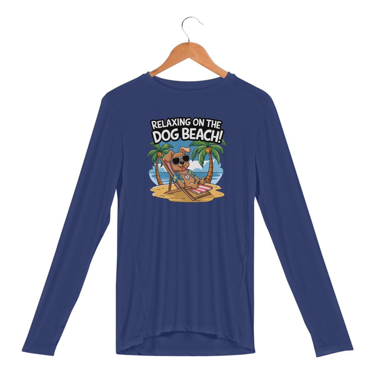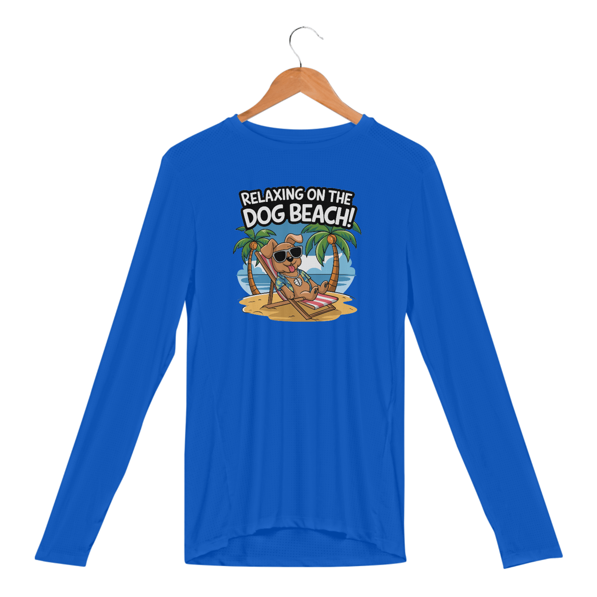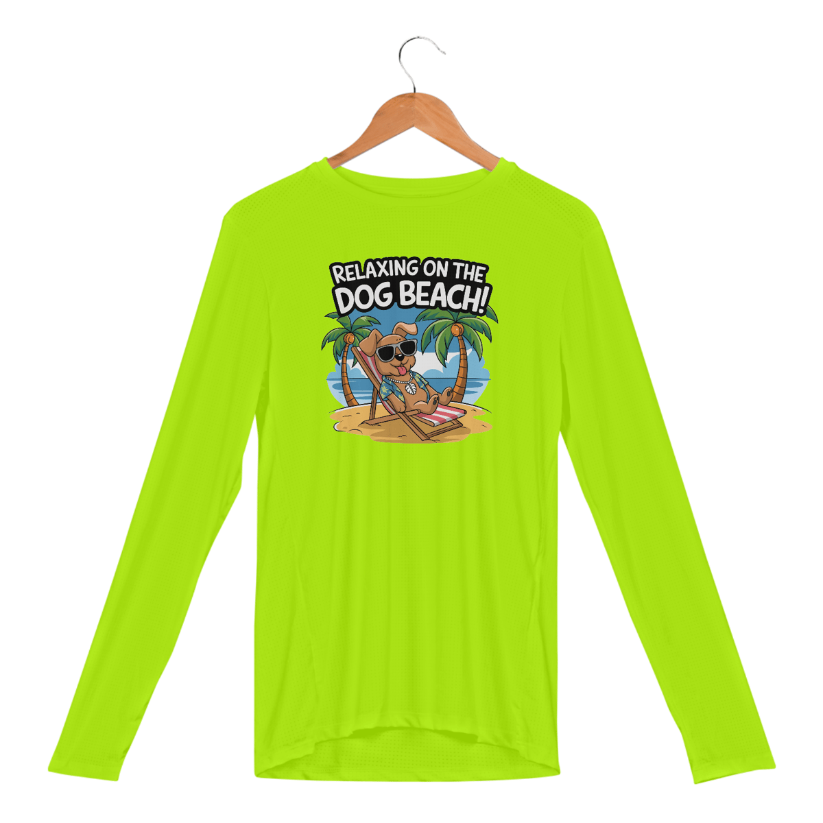 Uma estampa de um cachorro com óculos escuros descansando em uma cadeira de praia em uma praia arenosa. O cachorro está usando uma camisa havaiana e um colar com uma concha puka. O fundo contém palmeiras e um céu azul. O texto "Relaxando na Praia dos Cachorros!" está escrito em uma fonte divertida acima do cachorr