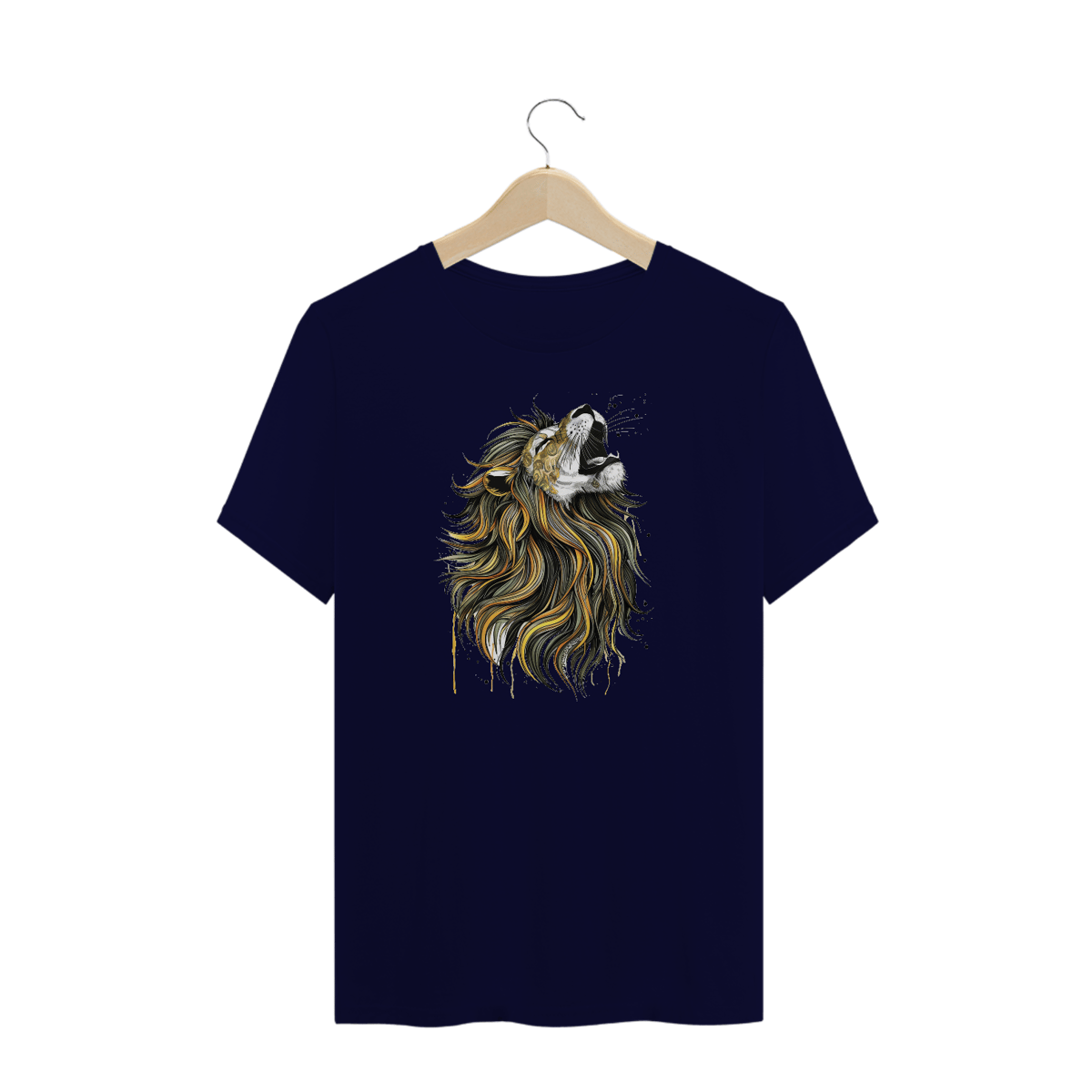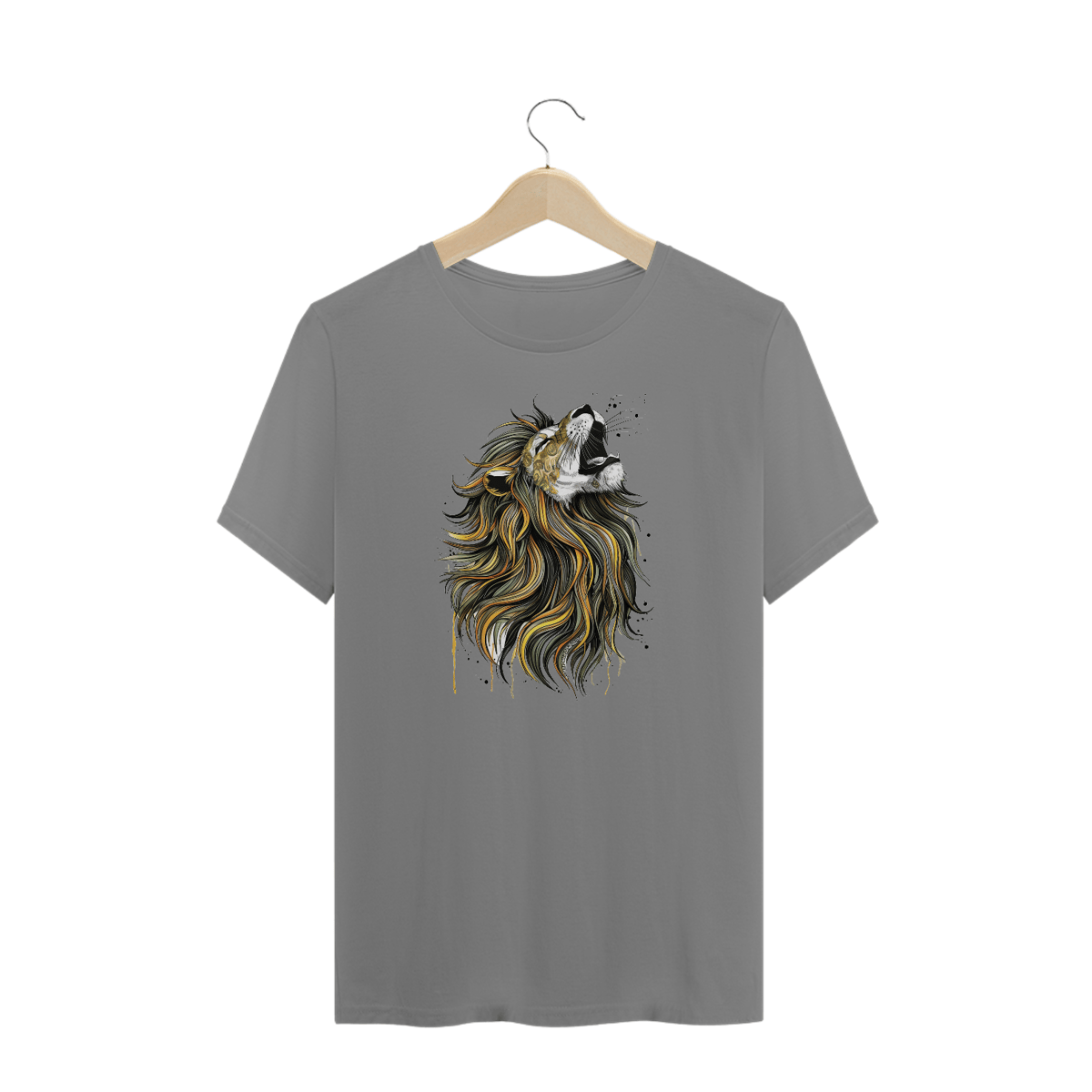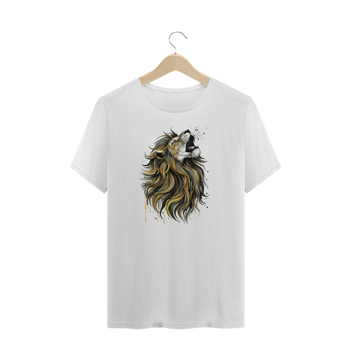 Uma estampa cativante e intrincada de um leão majestoso com uma longa e colorida juba que flui graciosamente. A juba do leão é adornada com padrões hipnóticos e cores vibrantes, incluindo amarelos, verdes sálvia e pretos. Os olhos do leão estão fechados, e sua boca aberta evoca uma sensação de uivo ou canto.