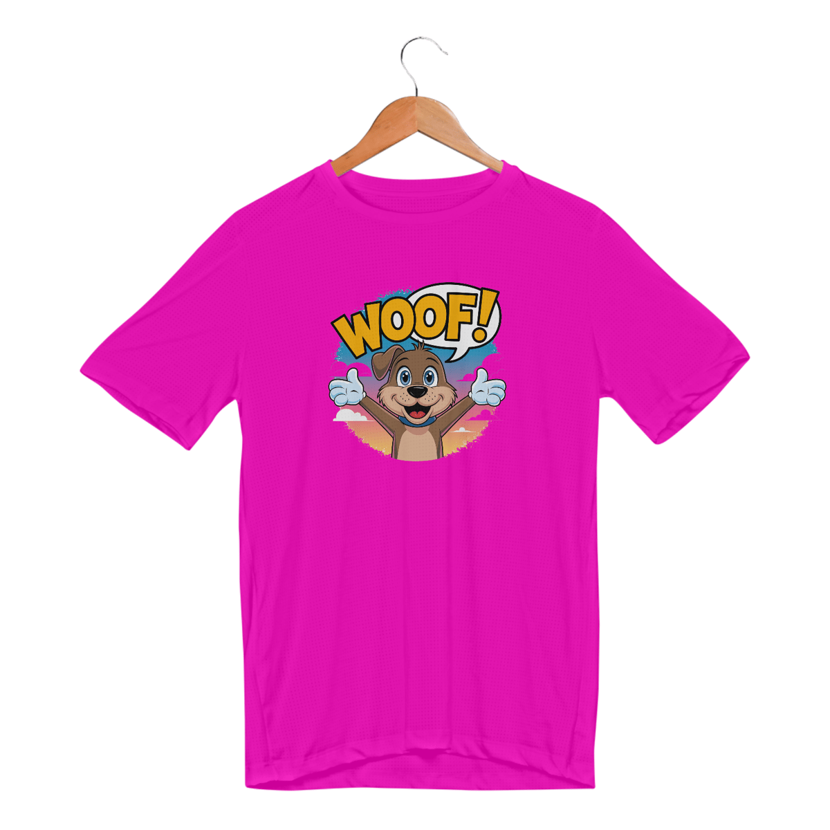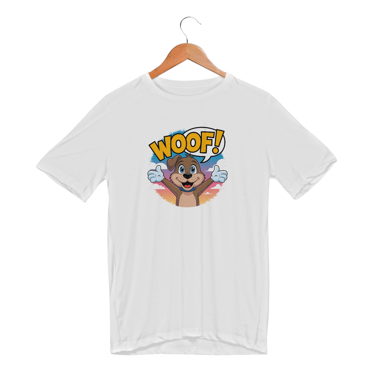 O cão está dizendo "Woof!" em um balão de fala acima de sua cabeça. O fundo é um céu vibrante com nuvens. O design geral é em um fundo branco e tem um design de camiseta Camaleon Store
