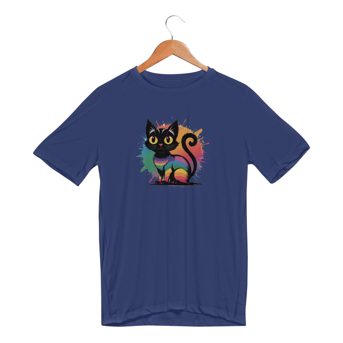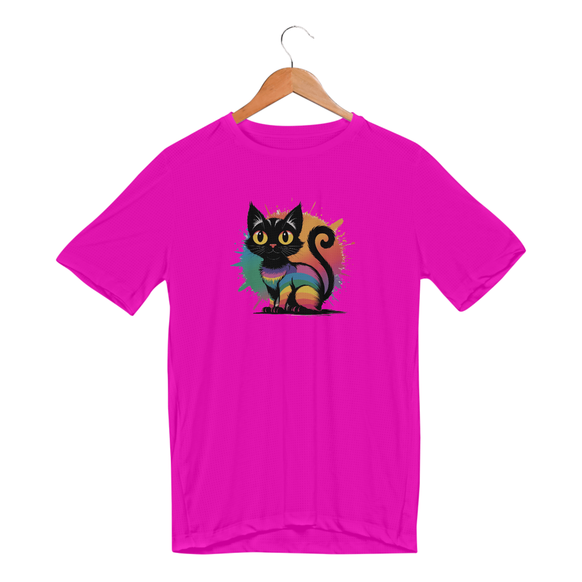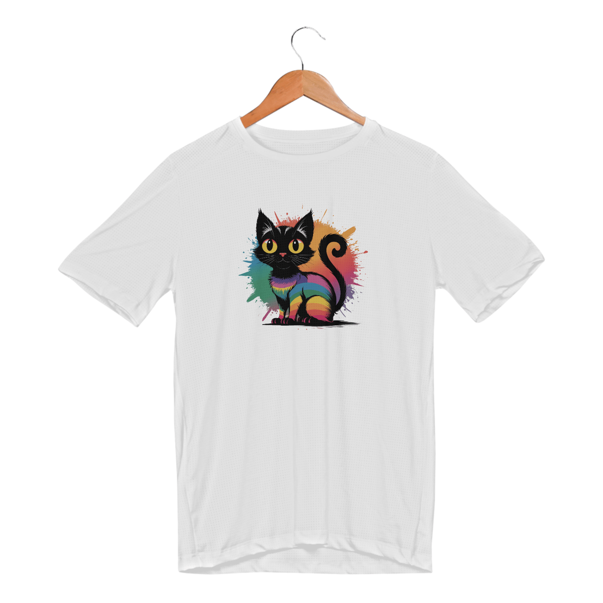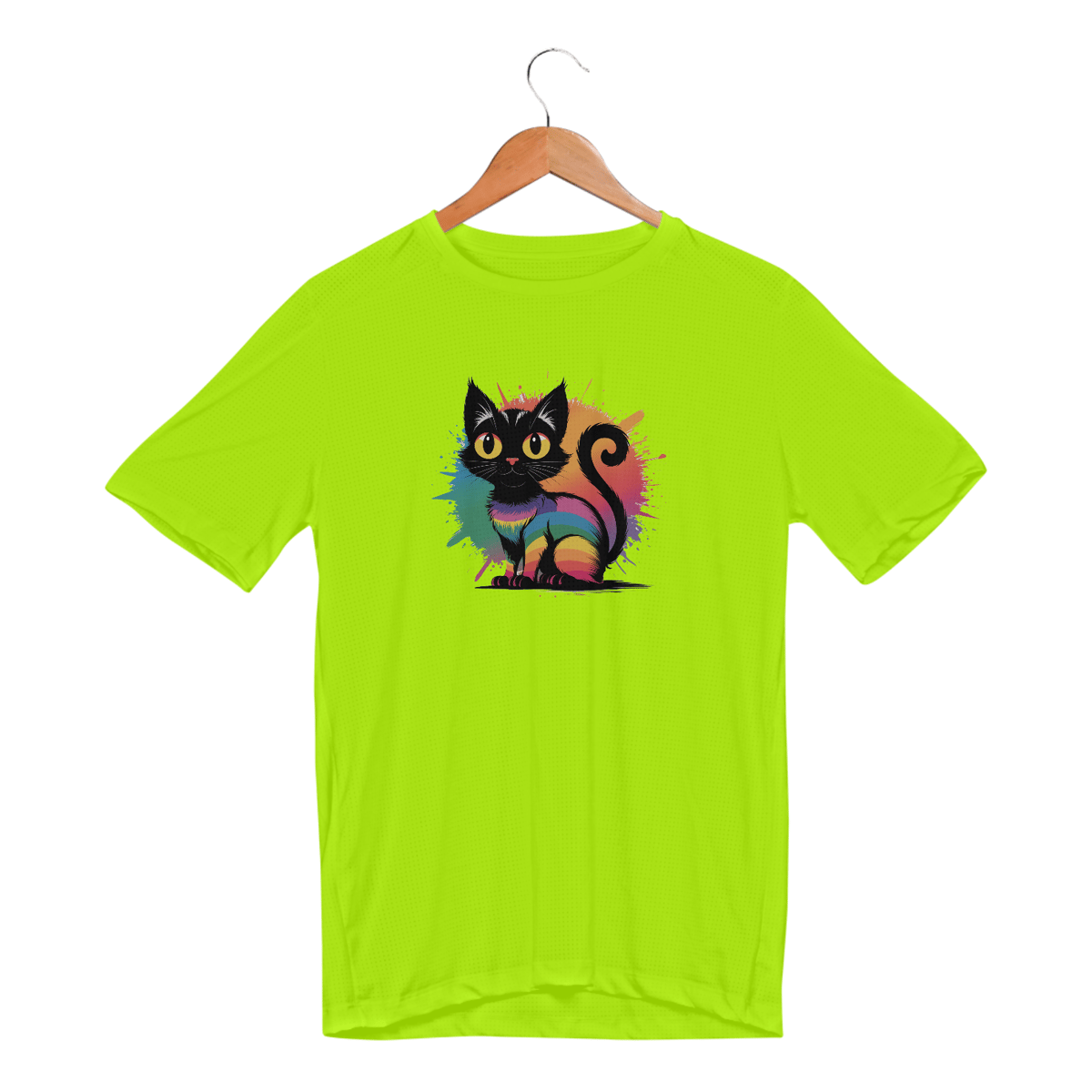 Uma regata UV com estampa psicodélica de uma silhueta de gato preto com pelo de arco-íris.