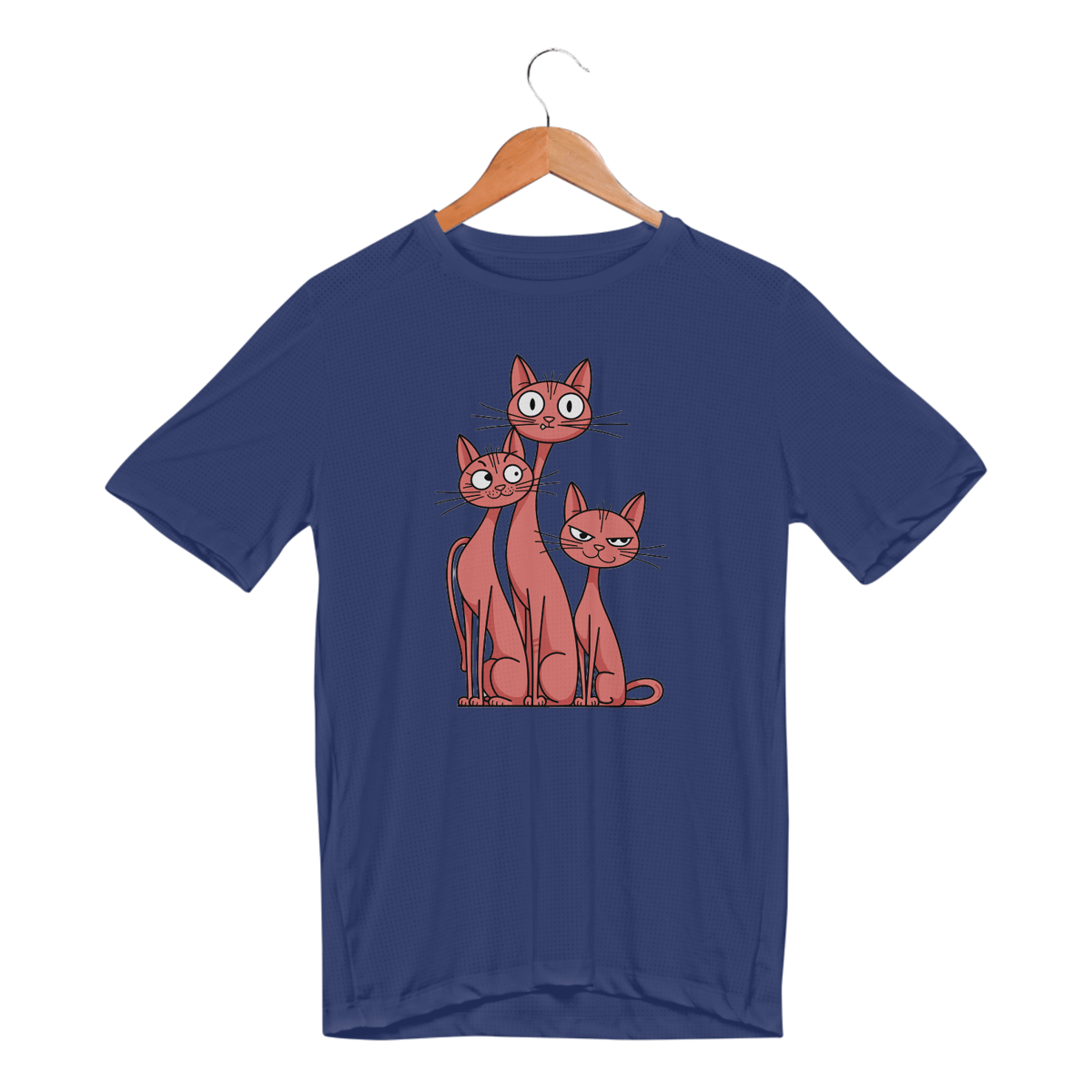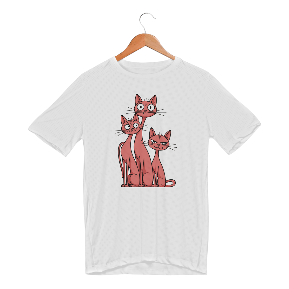 Uma estampa de camiseta divertida e simples de três gatos esbeltos com diferentes expressões e ângulos. O primeiro gato está surpreso e tem os olhos bem abertos. O segundo gato está alerta e tem as orelhas em pé. O terceiro gato está sorrindo e tem os olhos semicerrados. Todos os gatos são de uma cor vermelho-claro que é suave e romântica.