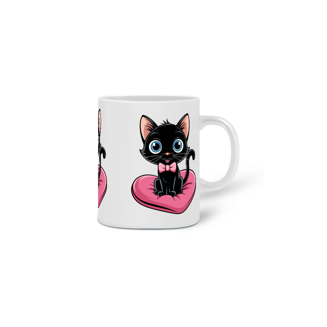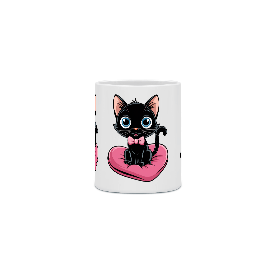 Um plano médio estilo desenho animado de um gato preto fofo com olhos azuis brilhantes. O gato está sentado em uma almofada rosa em forma de coração. O gato está usando uma gravata borboleta rosa.