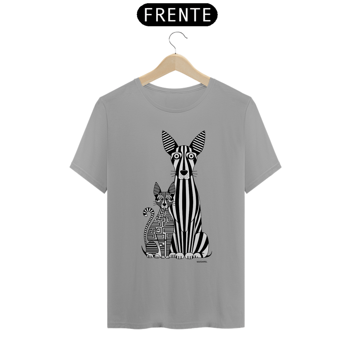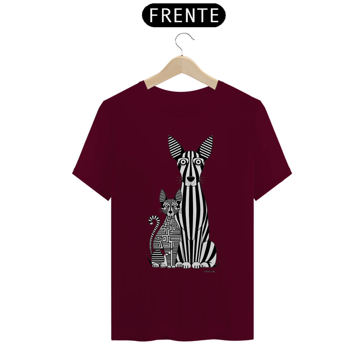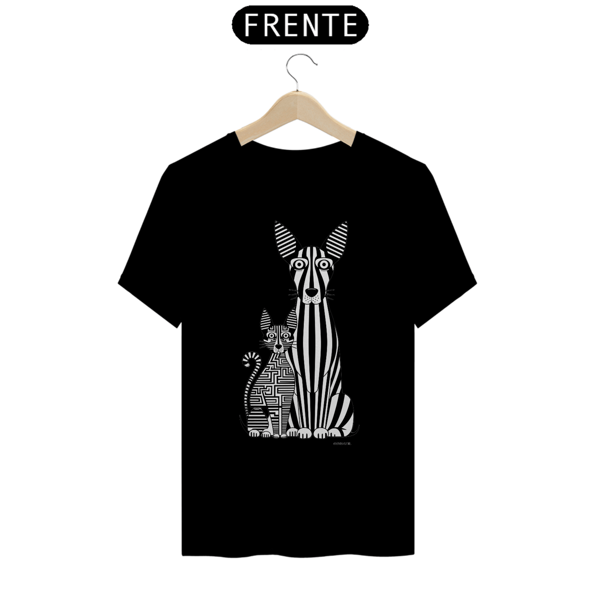 Uma estampa de  um cão e um gato alongados. O cão, com listras verticais que lembram um código de barras, tem olhos grandes e orelhas triangulares, enquanto o gato é formado por um labirinto complexo de linhas horizontais e verticais. Ambos os animais exibem seus olhos grandes e orelhas triangulares característicos, criando um design visualmente estimulante e único. O esquema de cores monocromático acrescenta simplicidade e sofisticação à arte.