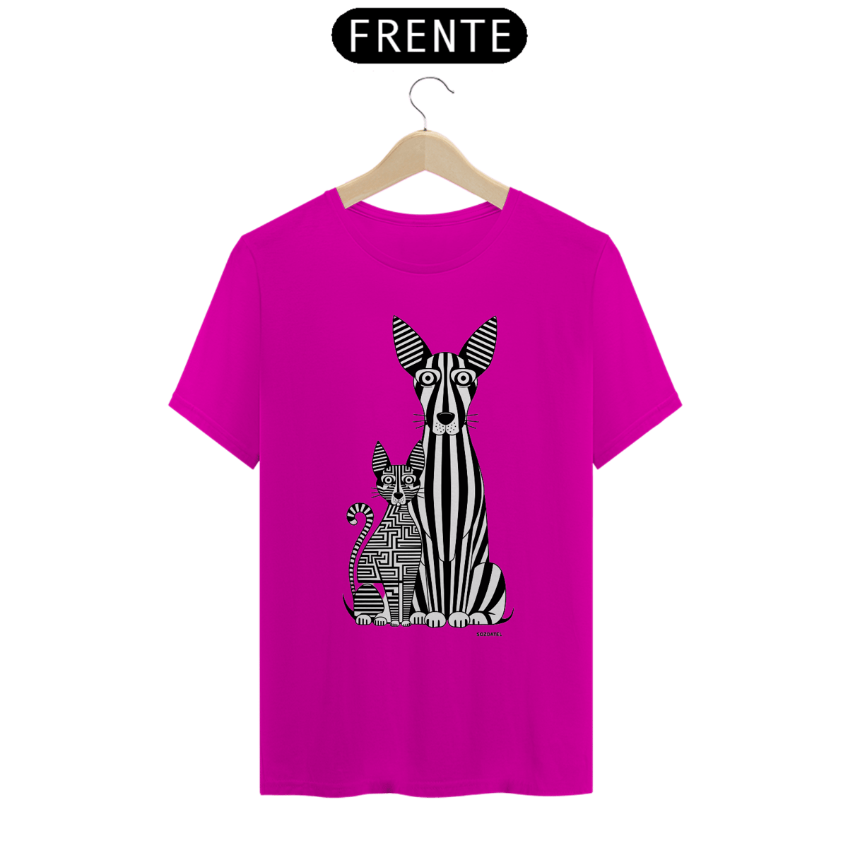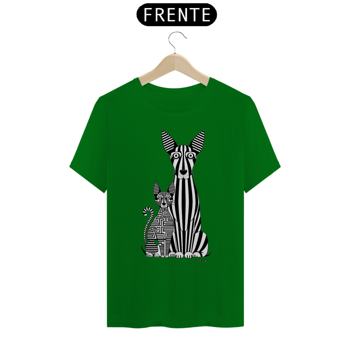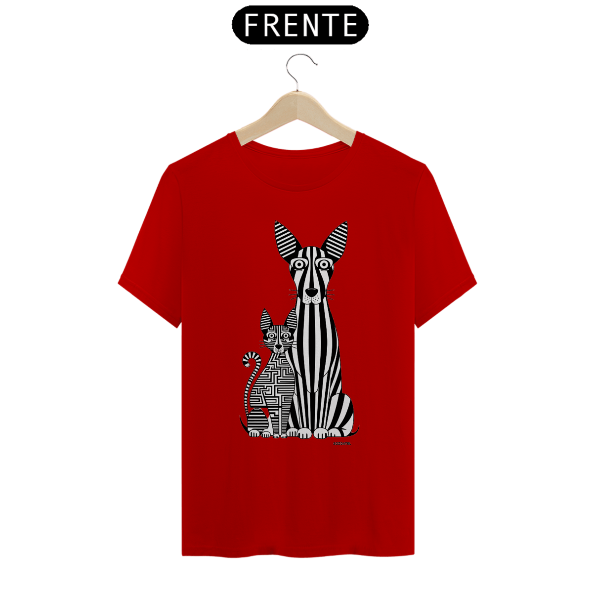 Uma estampa de  um cão e um gato alongados. O cão, com listras verticais que lembram um código de barras, tem olhos grandes e orelhas triangulares, enquanto o gato é formado por um labirinto complexo de linhas horizontais e verticais. Ambos os animais exibem seus olhos grandes e orelhas triangulares característicos, criando um design visualmente estimulante e único. O esquema de cores monocromático acrescenta simplicidade e sofisticação à arte.