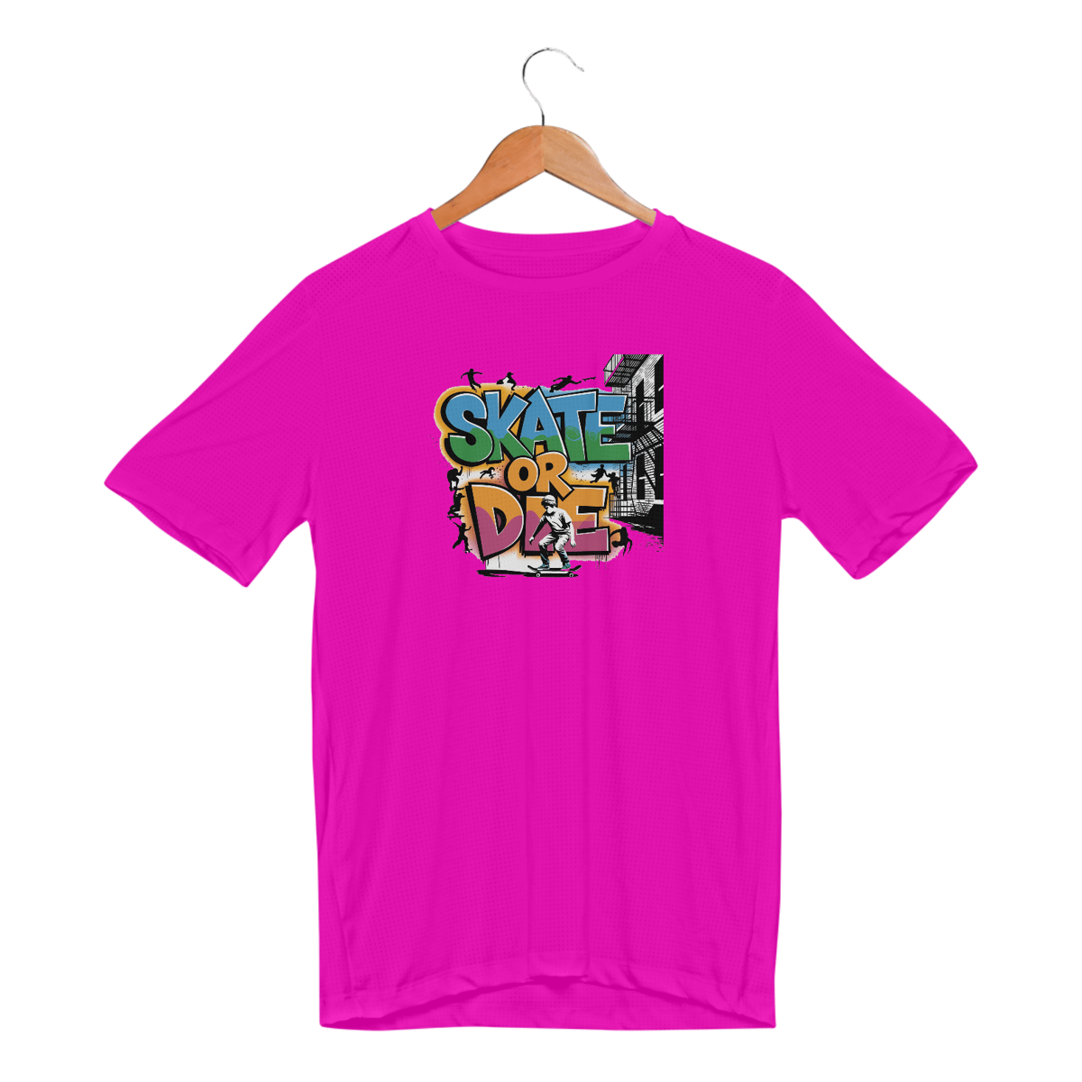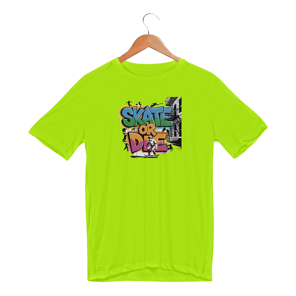 Uma estampa de um garoto andando de skate e ao  redor do garoto há grafite e arte em spray. O grafite inclui o texto "Skate or Die" e várias silhuetas de skate. O fundo é um cenário urbano com paredes de tijolos e uma escada de incêndio. Há uma sombra do garoto e do skate na parede atrás dele.
