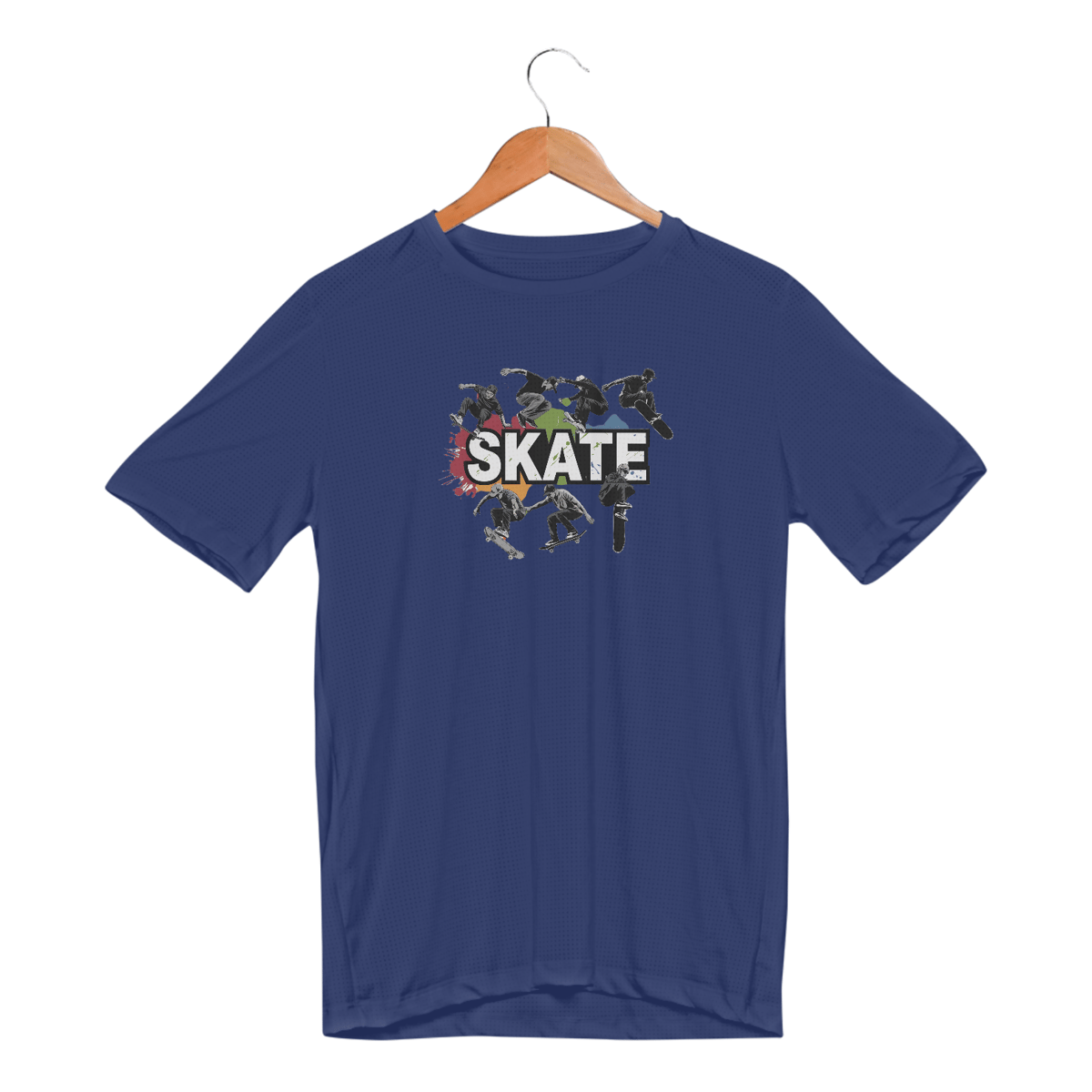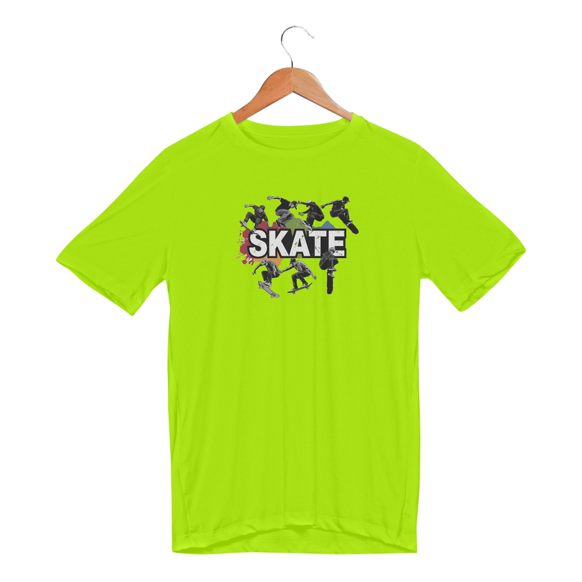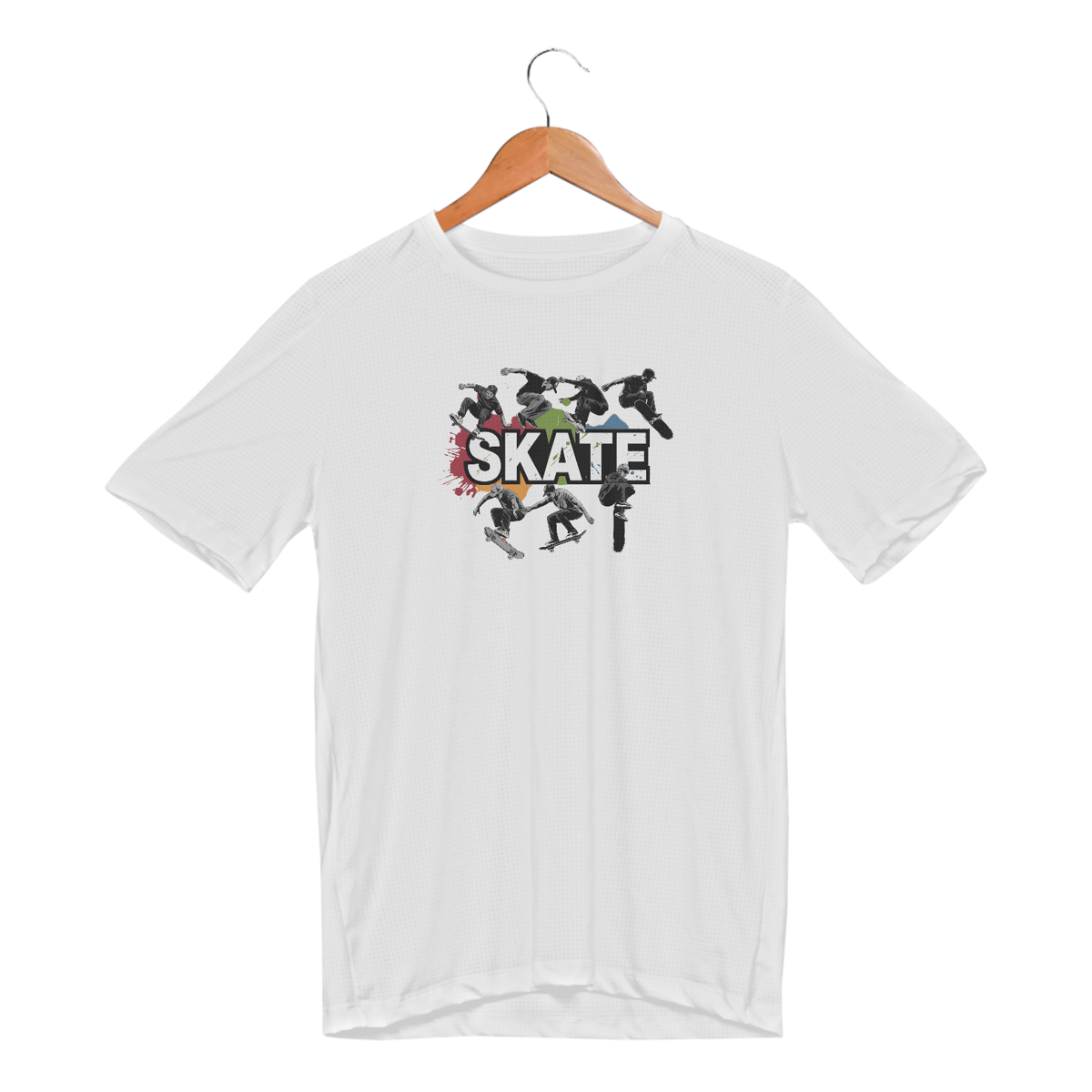 Uma estampa com o texto "Skate". Há vários skatistas em diferentes posições, alguns no ar com suas pranchas de lado. Há também respingos de cor ao redor do design.