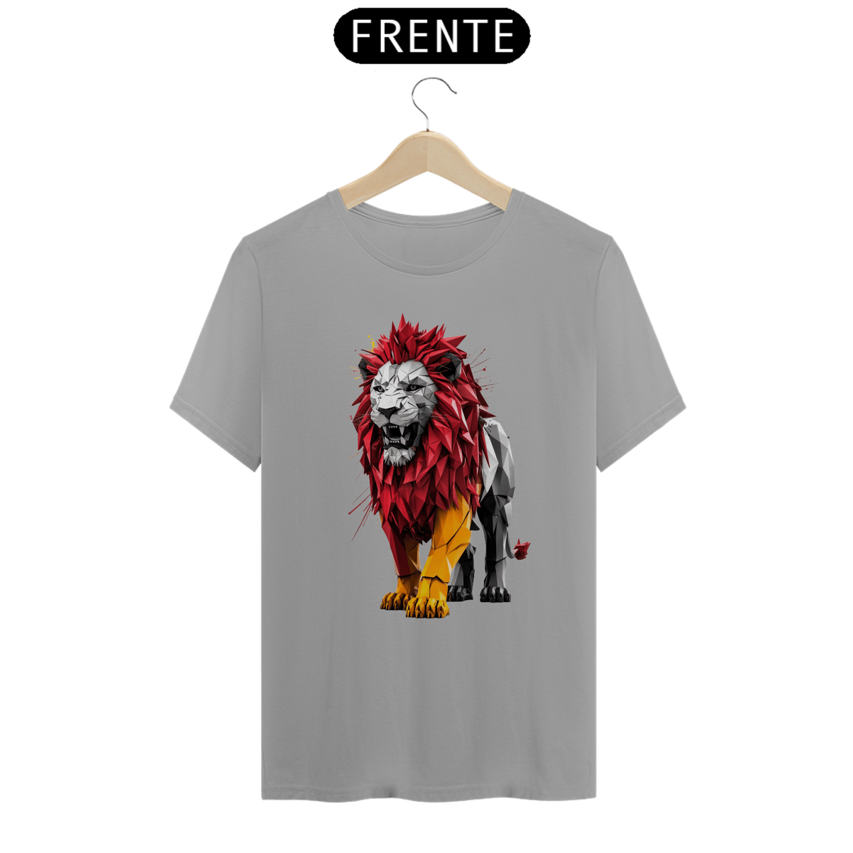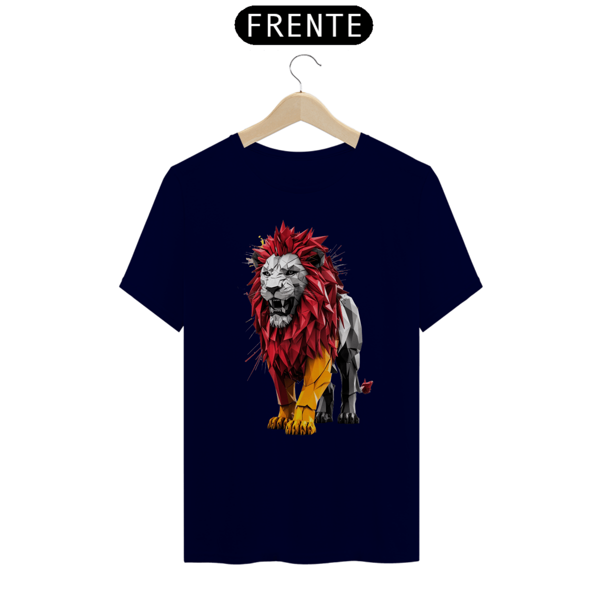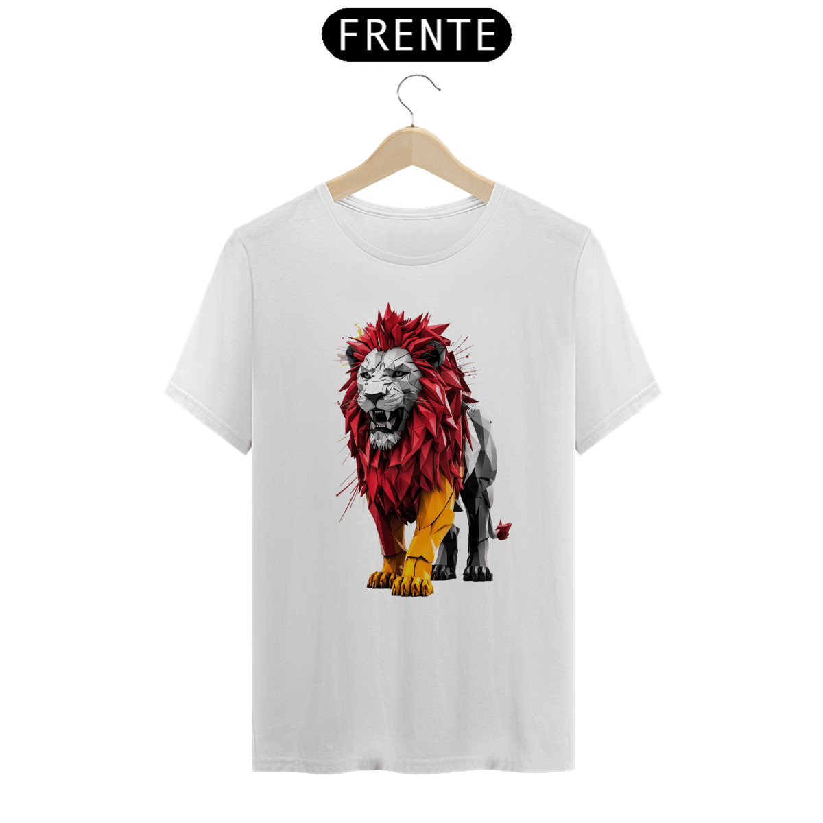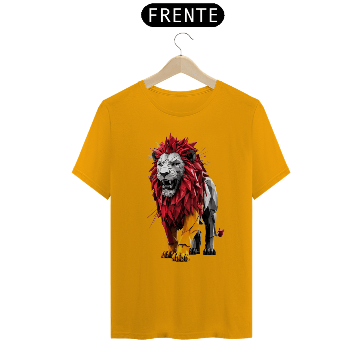 Uma estampa extraordinária e fascinante que mostra um leão poderoso e dinâmico meticulosamente trabalhado a partir de formas geométricas intrincadas e linhas ousadas. A combinação marcante das cores vermelha e amarela do leão irradia uma sensação de urgência e energia, capturando a atenção do observador.