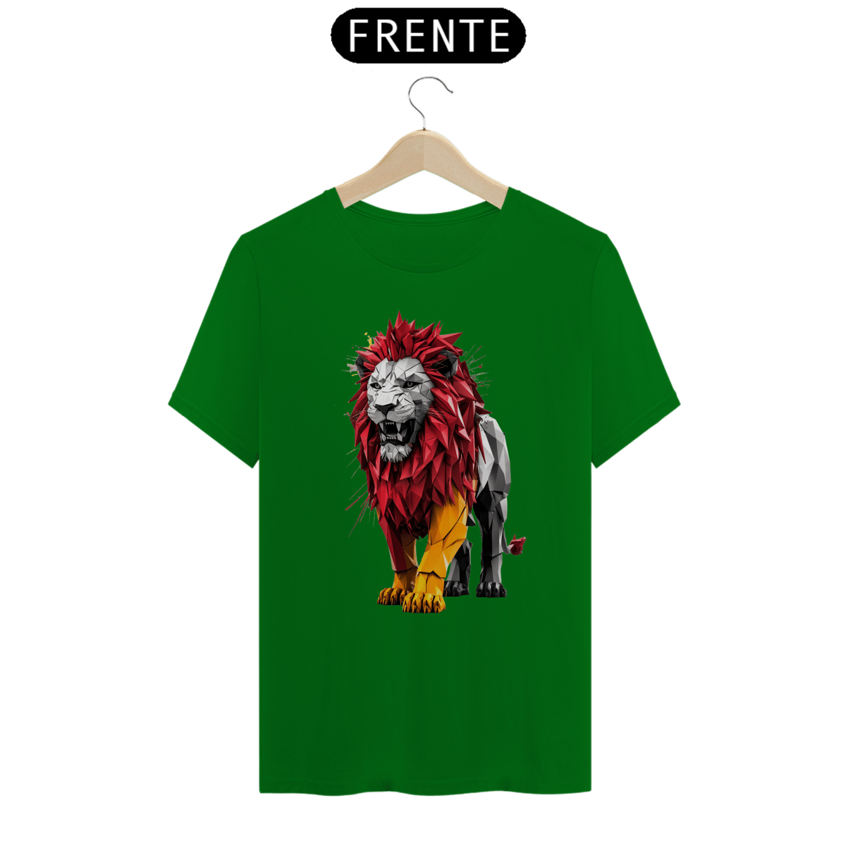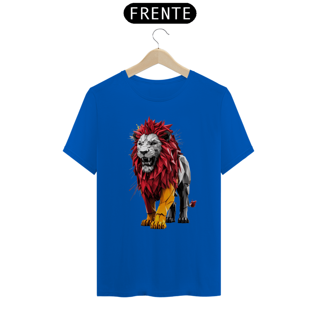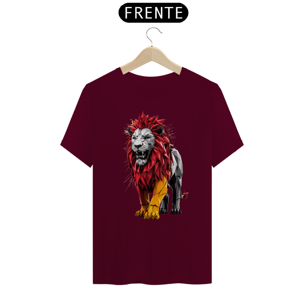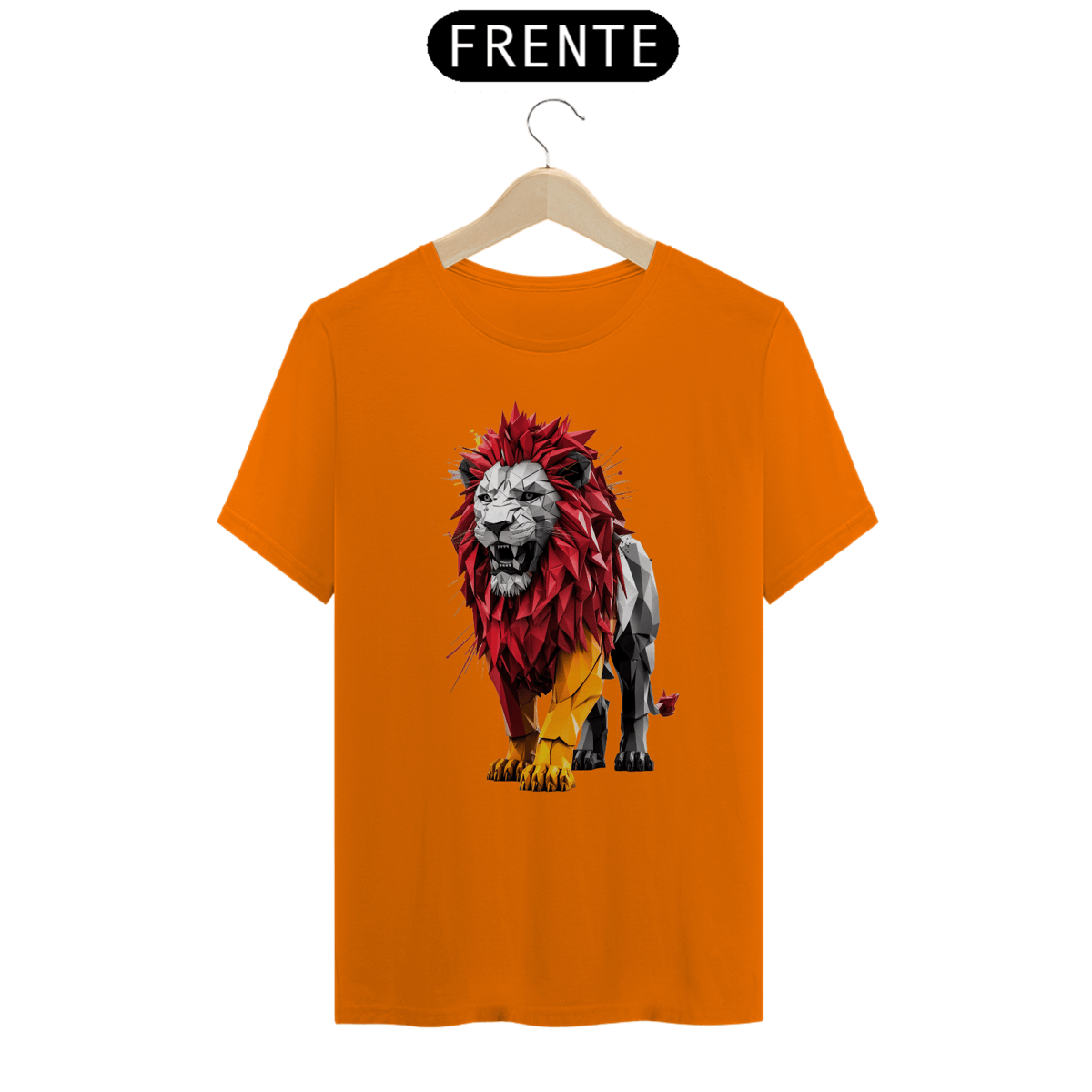 Uma estampa extraordinária e fascinante que mostra um leão poderoso e dinâmico meticulosamente trabalhado a partir de formas geométricas intrincadas e linhas ousadas. A combinação marcante das cores vermelha e amarela do leão irradia uma sensação de urgência e energia, capturando a atenção do observador.