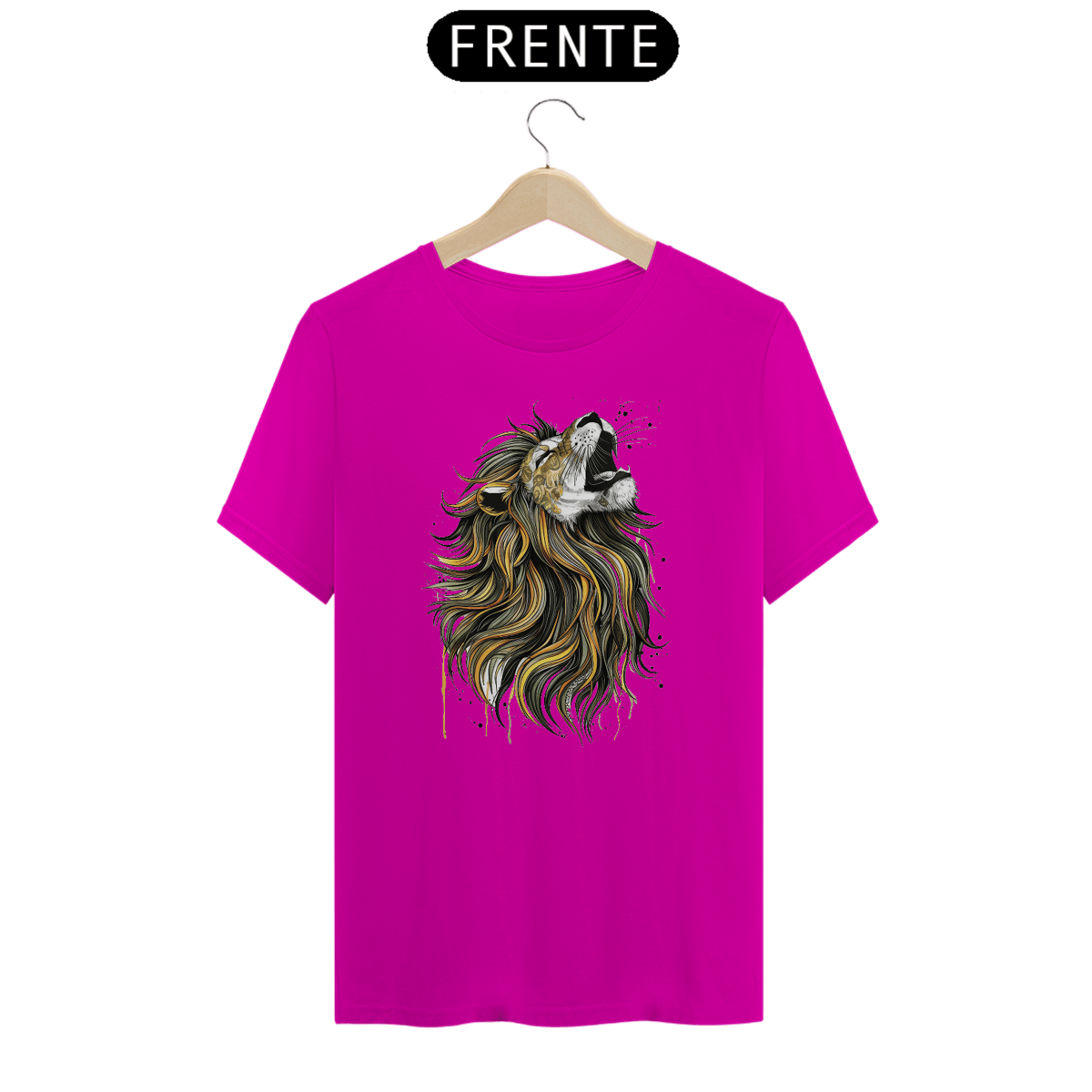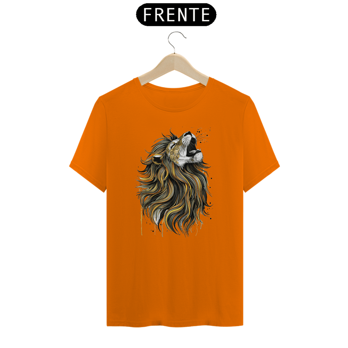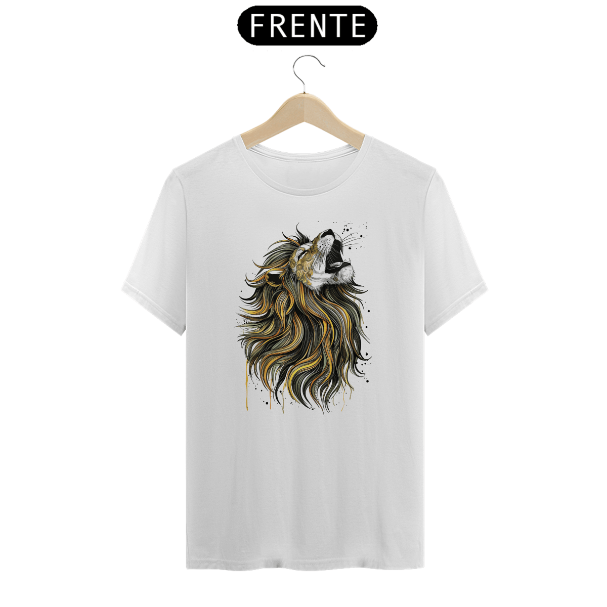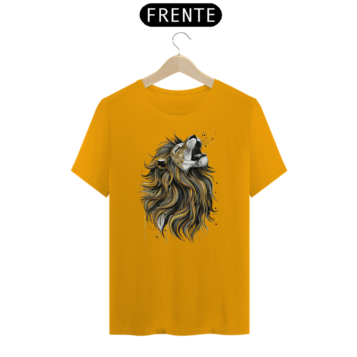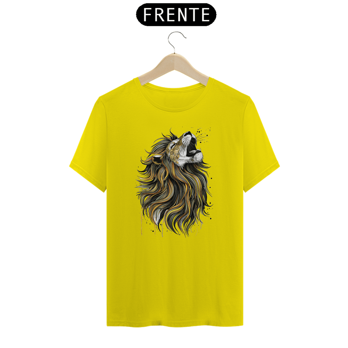 Uma estampa cativante e intrincada de um leão majestoso com uma longa e colorida juba que flui graciosamente. A juba do leão é adornada com padrões hipnóticos e cores vibrantes, incluindo amarelos, verdes sálvia e pretos. Os olhos do leão estão fechados, e sua boca aberta evoca uma sensação de uivo ou canto.
