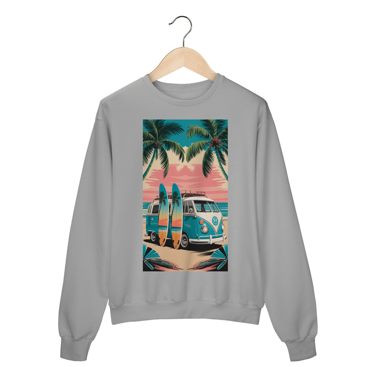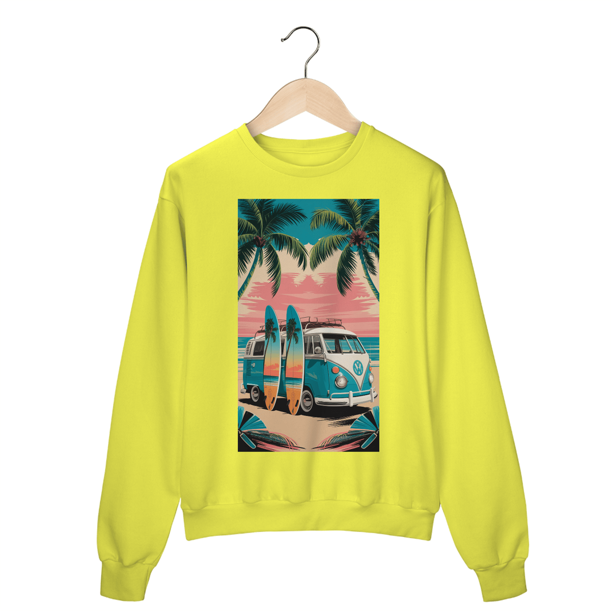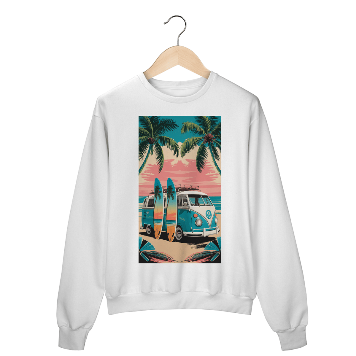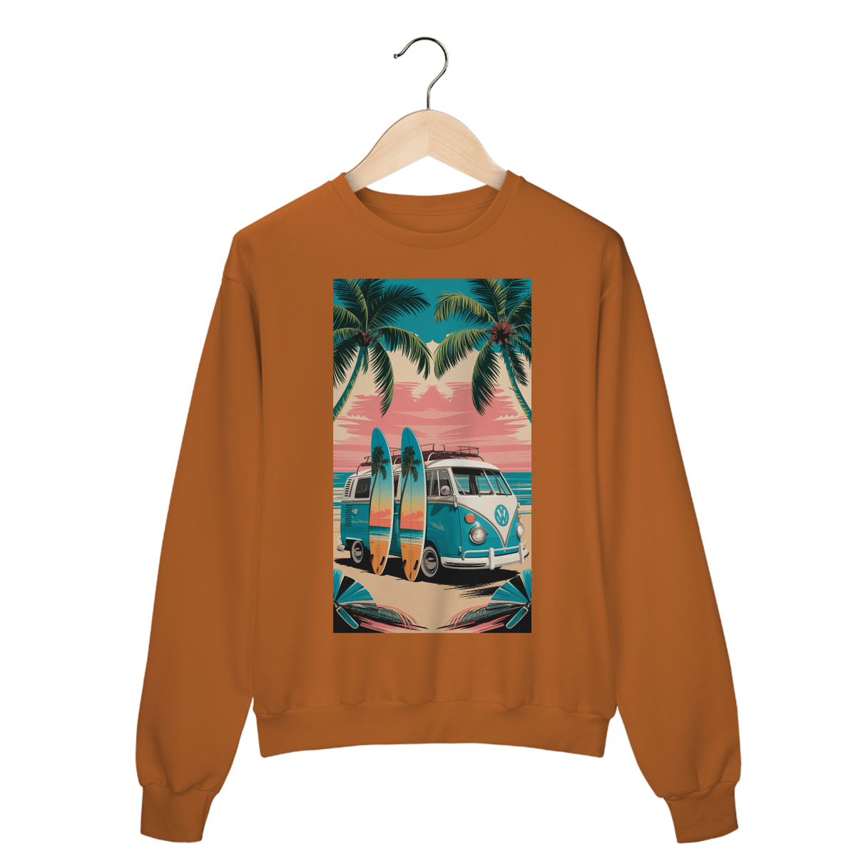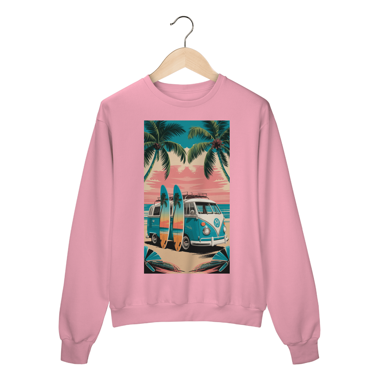 Uma estampa premiada de uma van de surf VW estacionada em uma praia. A van tem pranchas de surf pintadas à mão encostadas nela, cada uma com uma cena de dupla exposição de palmeiras verdejantes em uma praia tropical. O fundo contém um lindo oceano com céu rosa e uma praia cheia de palmeiras verdejantes
