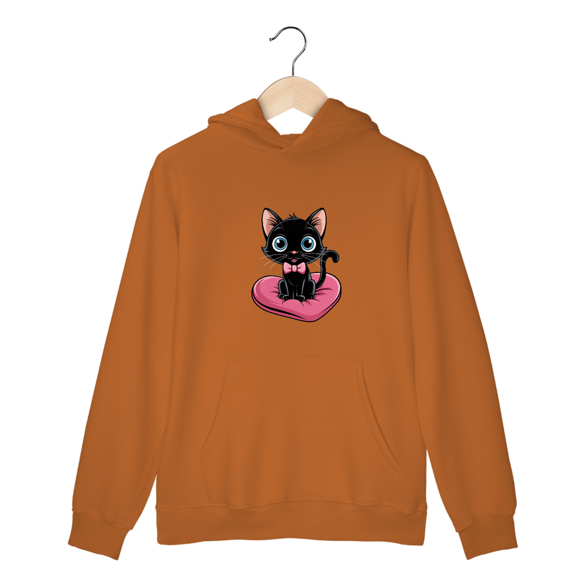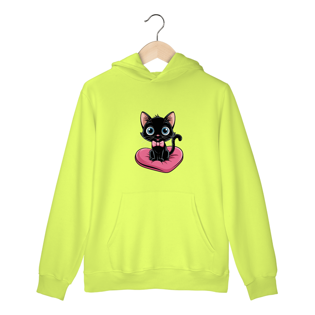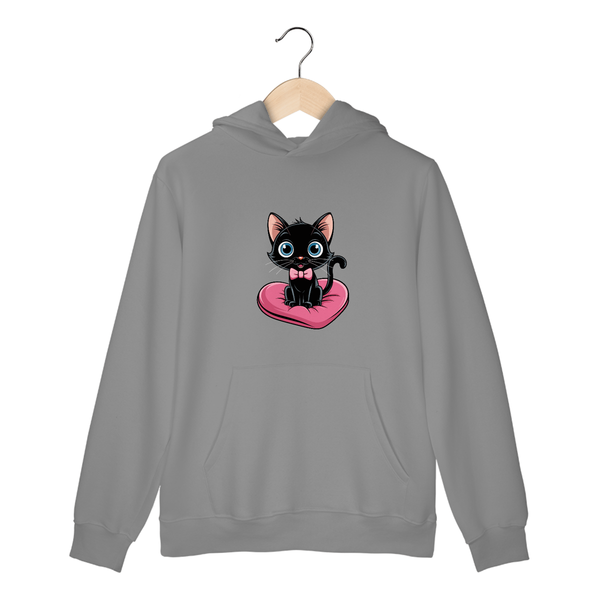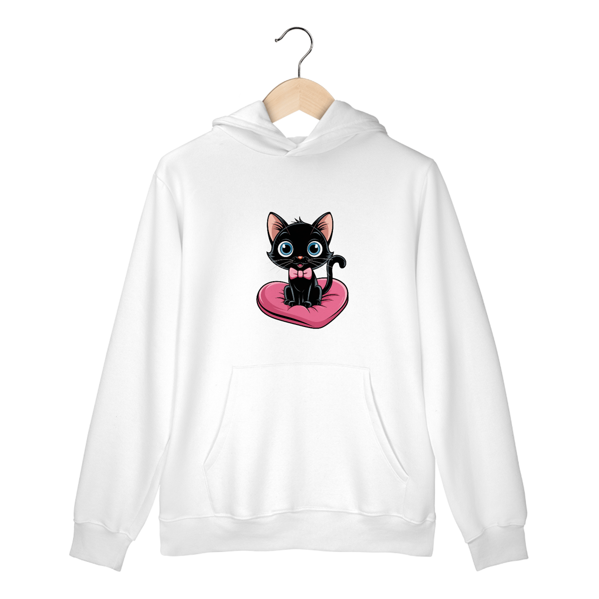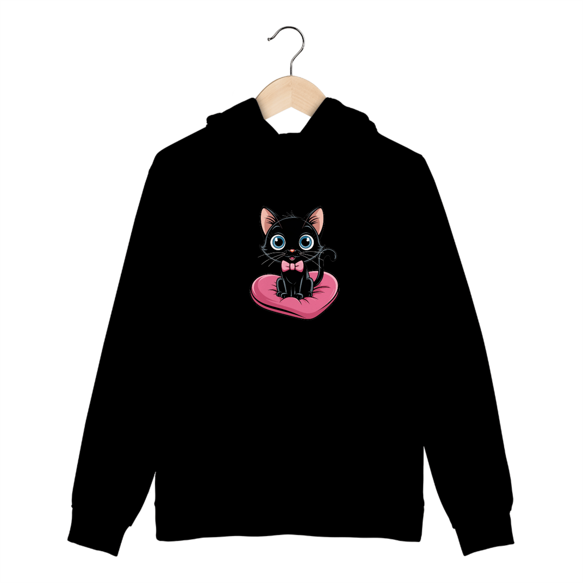 Um plano médio estilo desenho animado de um gato preto fofo com olhos azuis brilhantes. O gato está sentado em uma almofada rosa em forma de coração. O gato está usando uma gravata borboleta rosa.