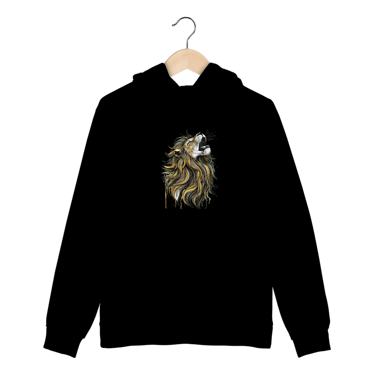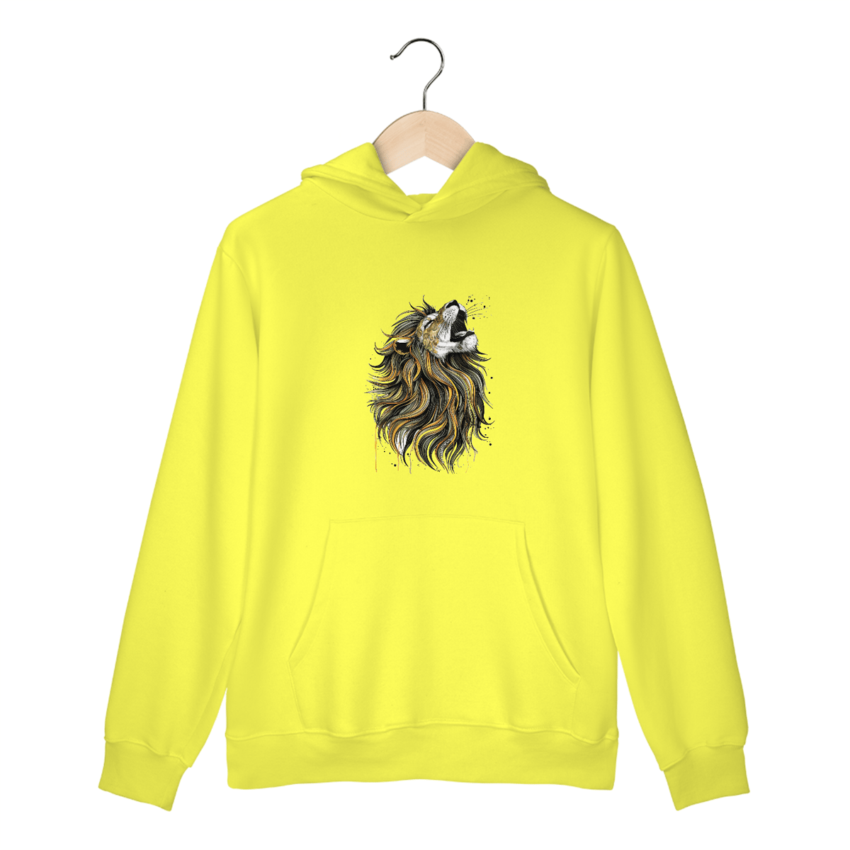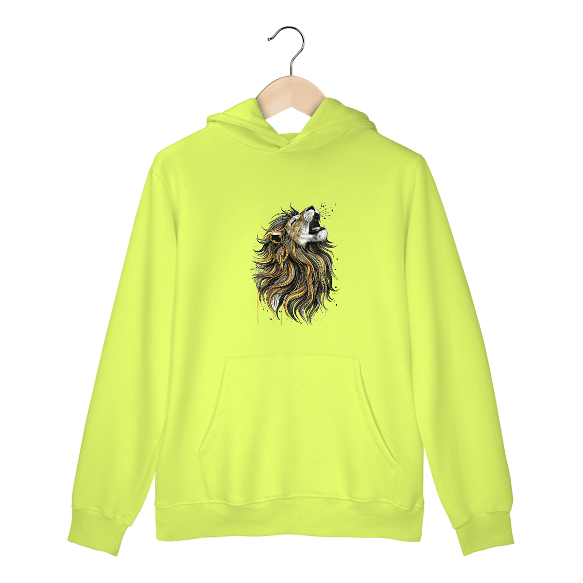 Uma estampa cativante e intrincada de um leão majestoso com uma longa e colorida juba que flui graciosamente. A juba do leão é adornada com padrões hipnóticos e cores vibrantes, incluindo amarelos, verdes sálvia e pretos. Os olhos do leão estão fechados, e sua boca aberta evoca uma sensação de uivo ou canto.