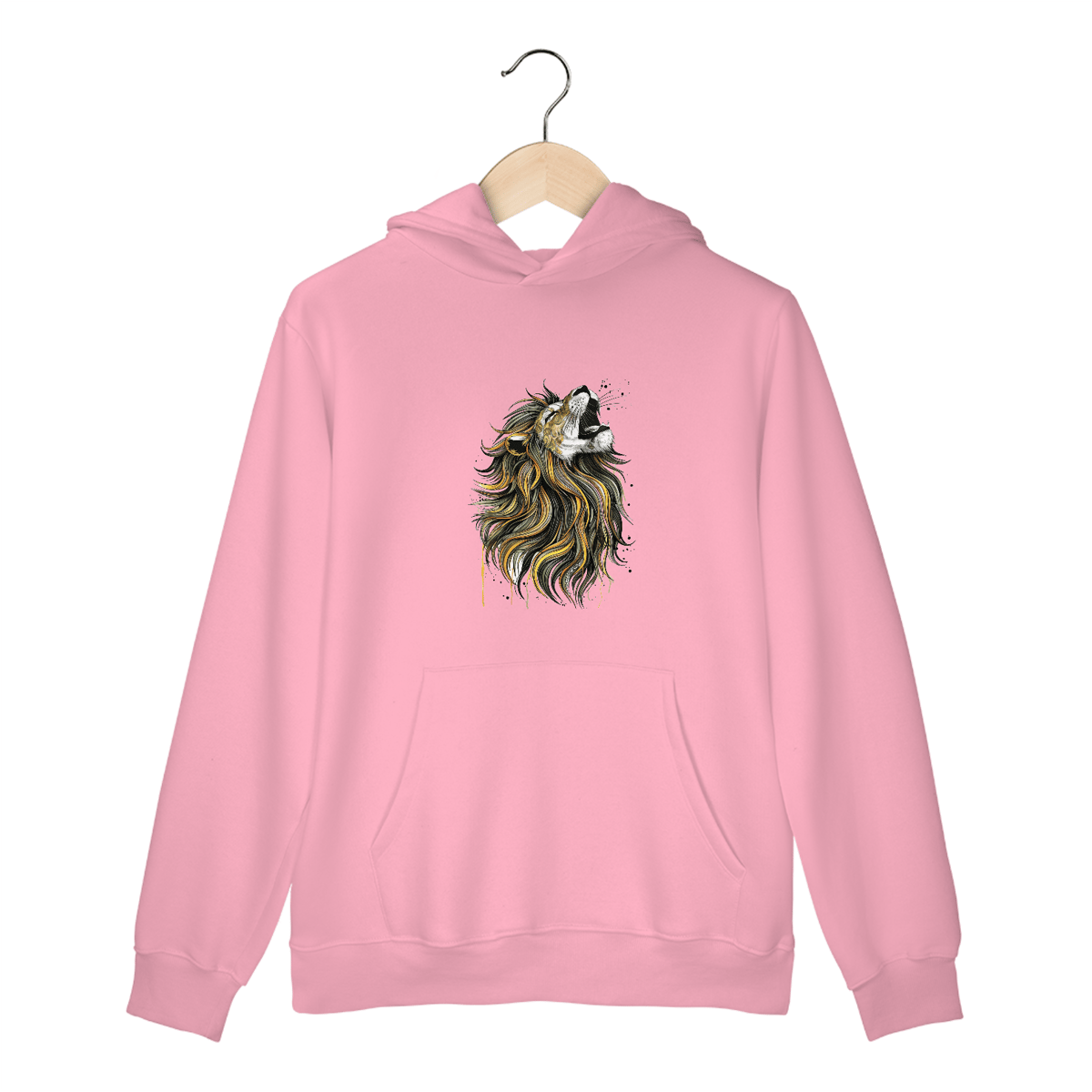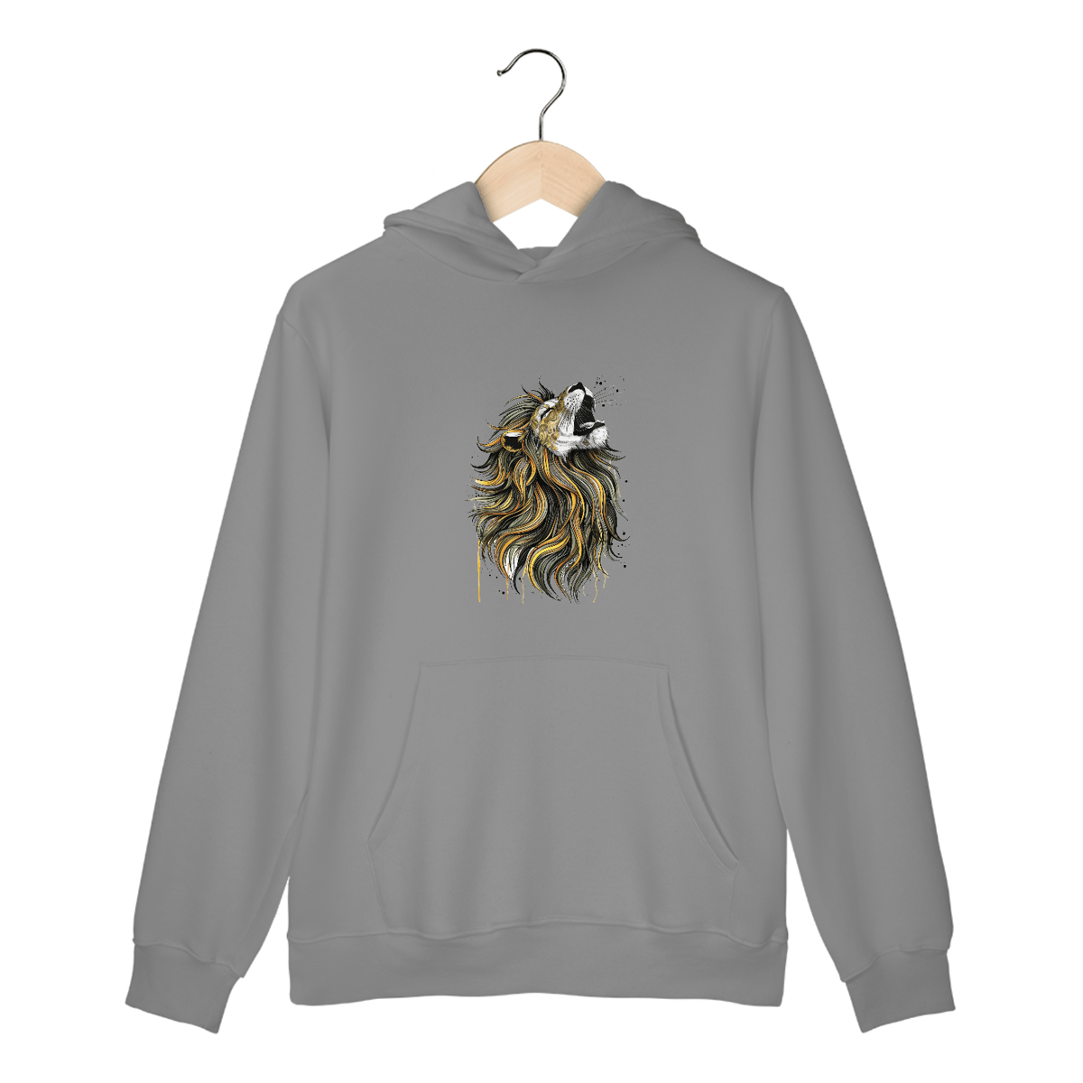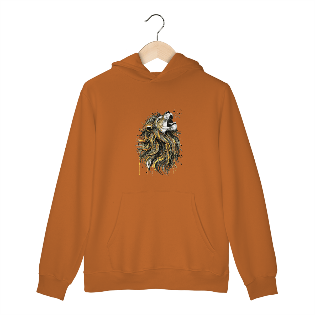 Uma estampa cativante e intrincada de um leão majestoso com uma longa e colorida juba que flui graciosamente. A juba do leão é adornada com padrões hipnóticos e cores vibrantes, incluindo amarelos, verdes sálvia e pretos. Os olhos do leão estão fechados, e sua boca aberta evoca uma sensação de uivo ou canto.