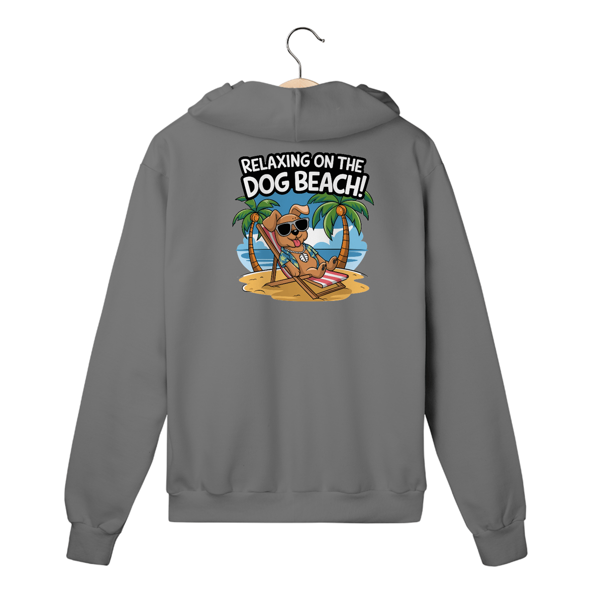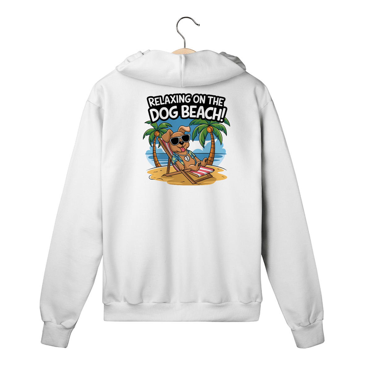 Uma estampa de um cachorro com óculos escuros descansando em uma cadeira de praia em uma praia arenosa. O cachorro está usando uma camisa havaiana e um colar com uma concha puka. O fundo contém palmeiras e um céu azul. O texto "Relaxando na Praia dos Cachorros!" está escrito em uma fonte divertida acima do cachorr