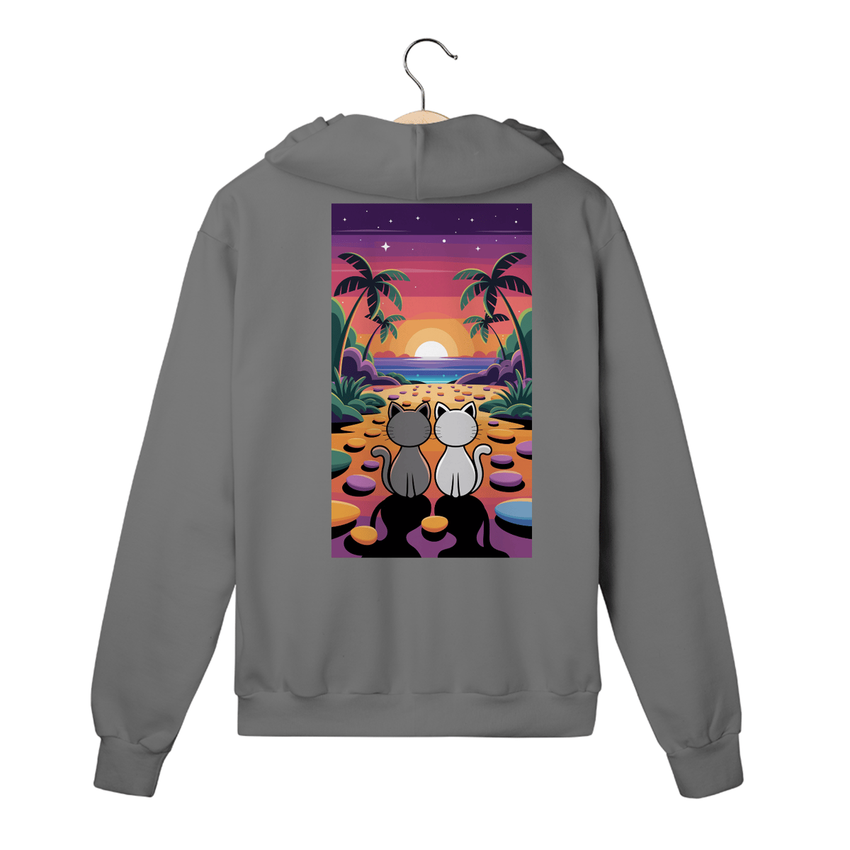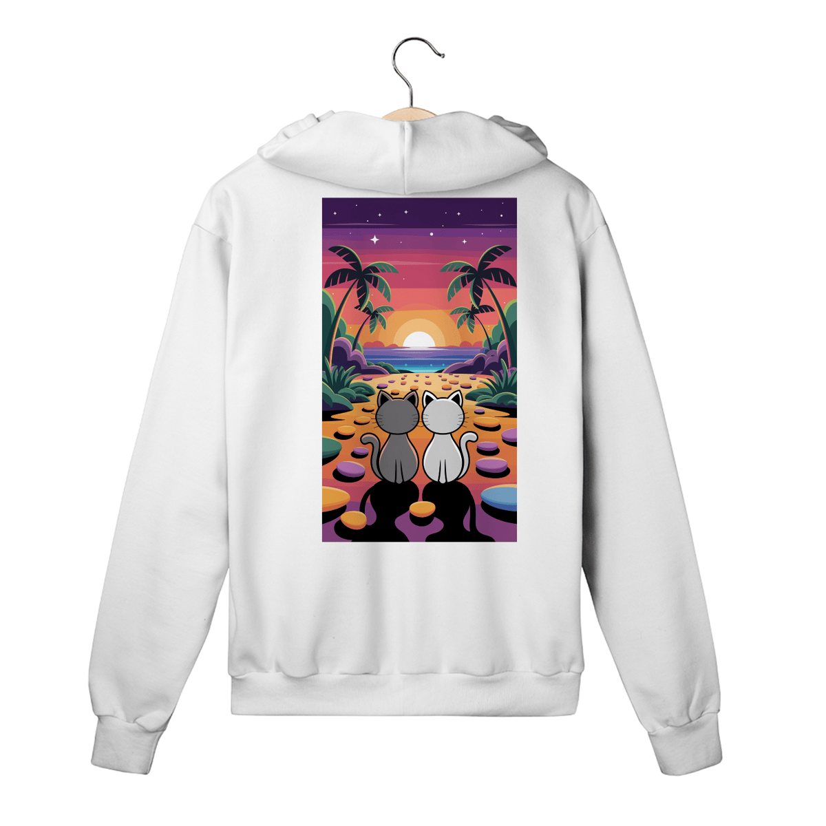 Uma estampa de uma paisagem serena com uma cena vibrante e colorida de pôr do sol em uma praia. O layout de dois gatos sentados lado a lado no primeiro plano. Um gato é cinza e o outro é branco, ambos com características simples e arredondadas e a praia é adornada com pedras lisas e multicoloridas dispostas em um padrão que leva à água. Palmeiras emolduram a cena em ambos os lados, com folhagem verde exuberante. O céu é um gradiente de cores quentes, passando de roxo profundo no topo para laranja brilhante perto do horizonte, onde o sol está se pondo sobre o oceano. Estrelas estão espalhadas pela parte superior do céu, adicionando um toque caprichoso à paisagem serena.