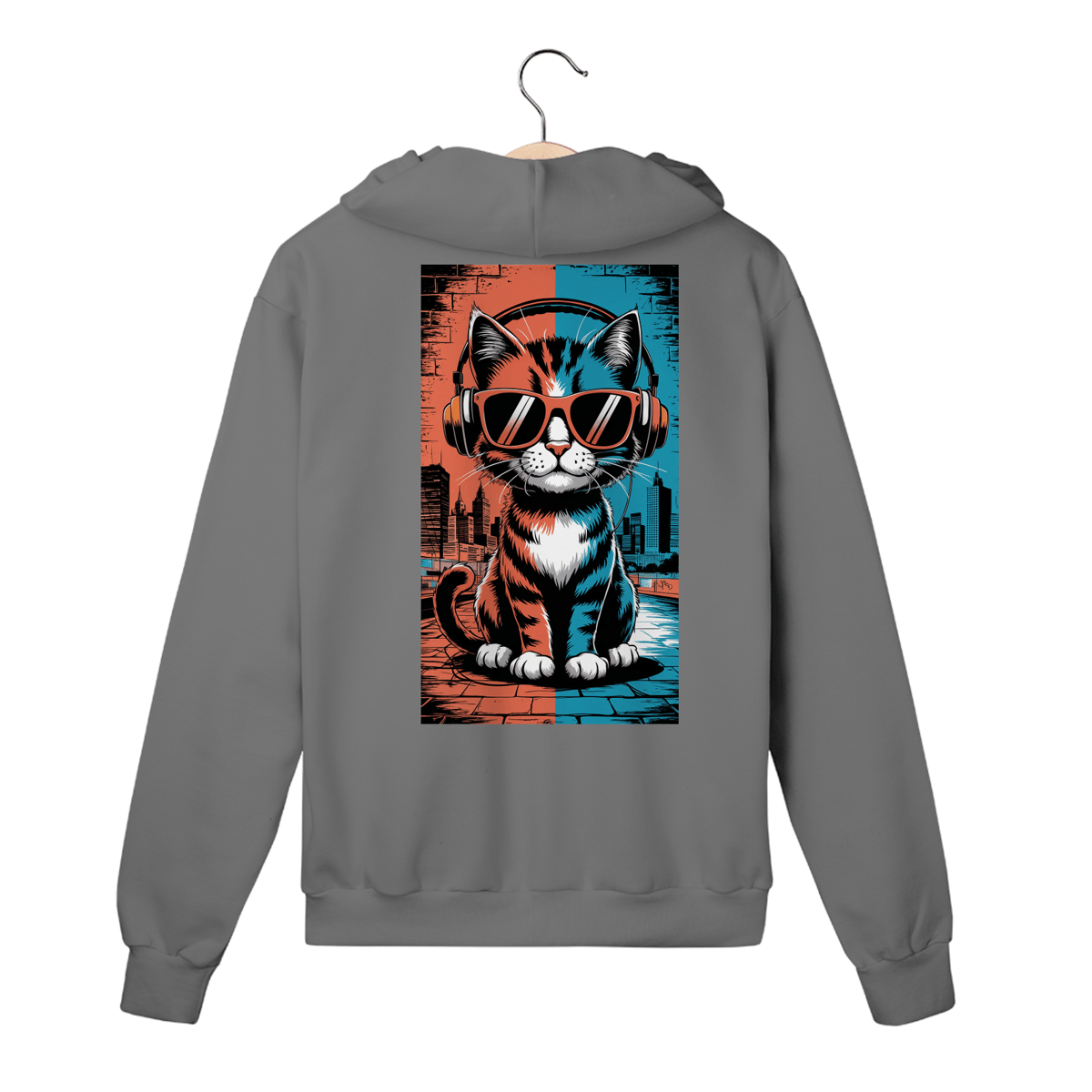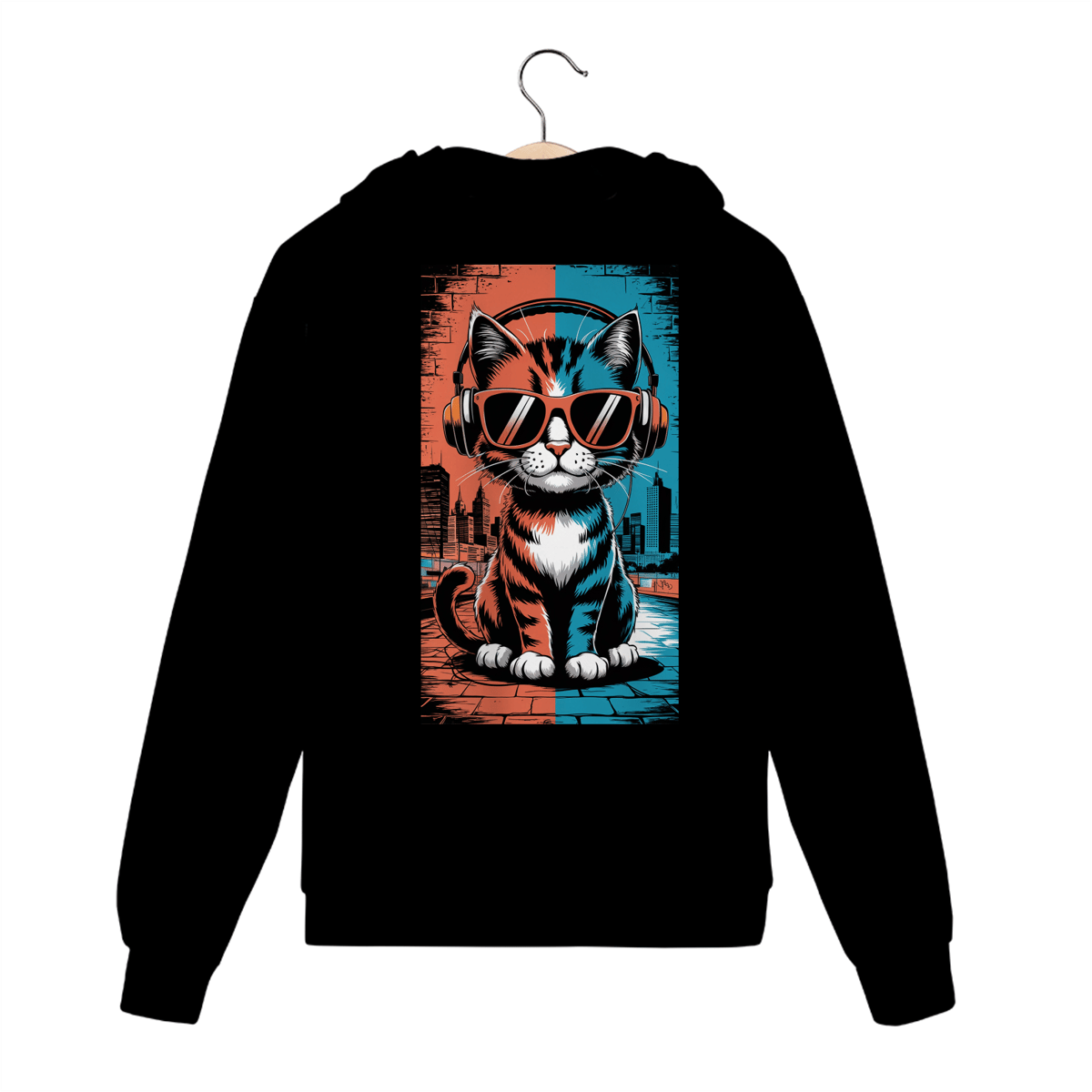 Estampa de arte pop de rua de um gato com óculos escuros e fones de ouvido. O gato está sentado em uma parede de tijolos.