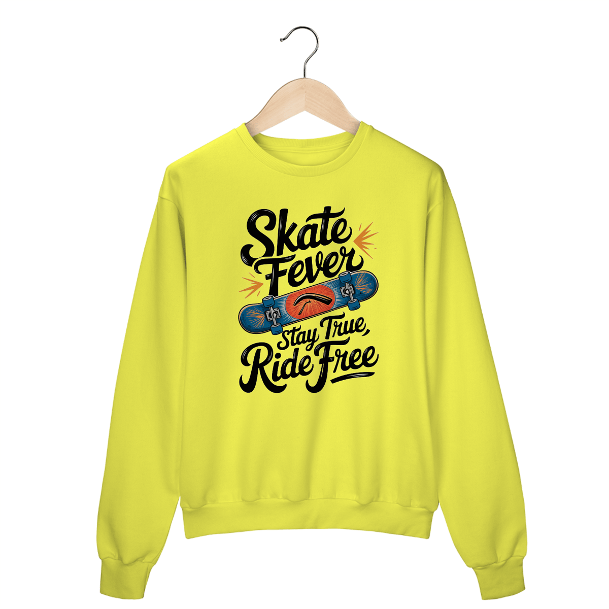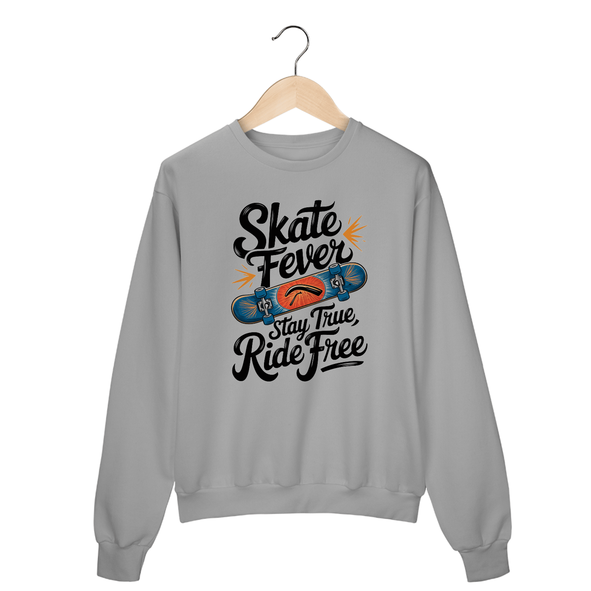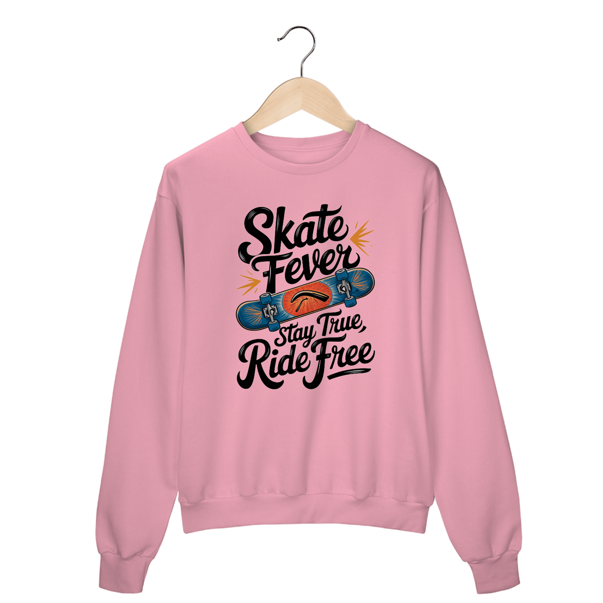 Uma estampa desenhada à mão de um skate com o texto "Skate Fever Stay True Ride Free". O skate tem um design vibrante com várias cores. O texto está em um estilo divertido e cursivo.