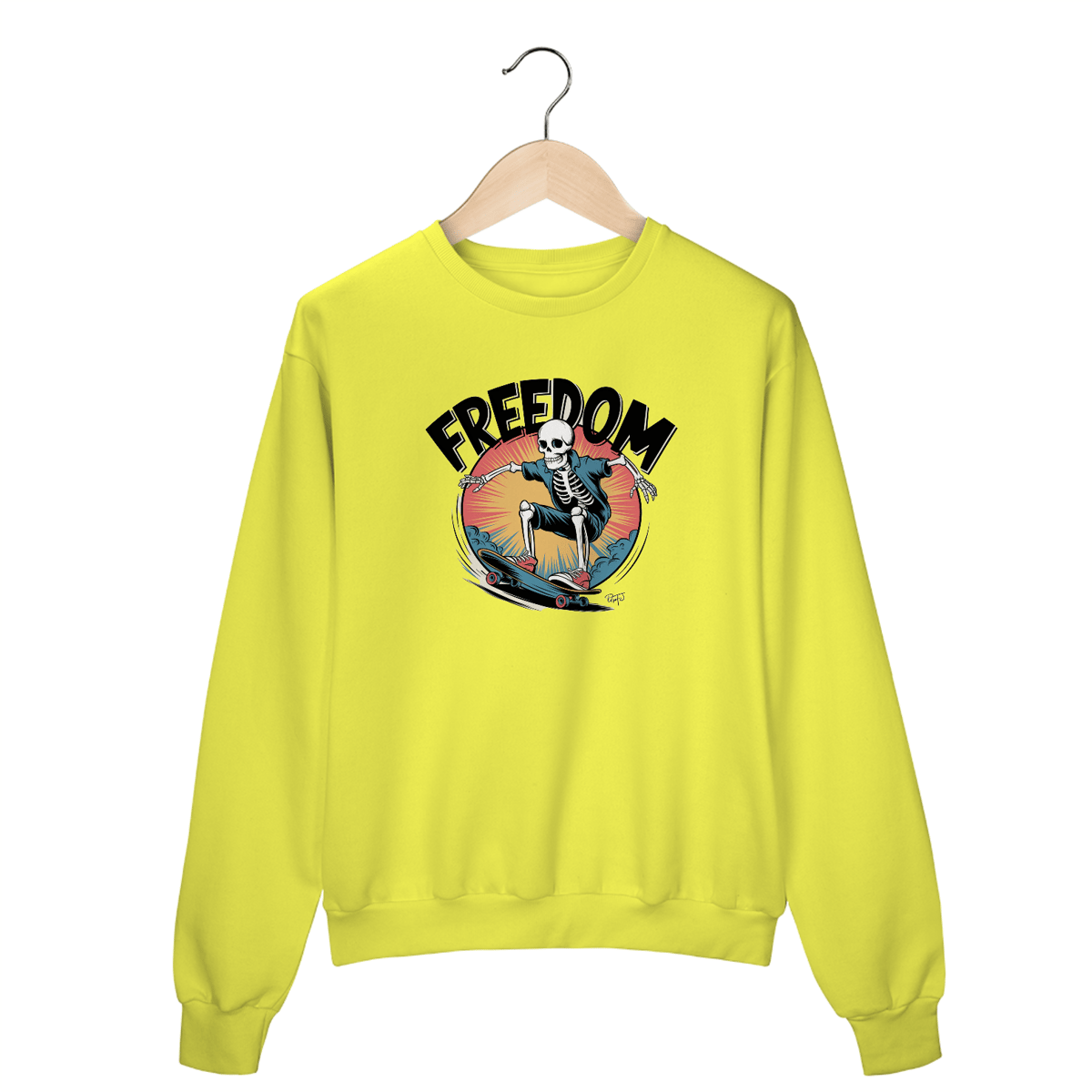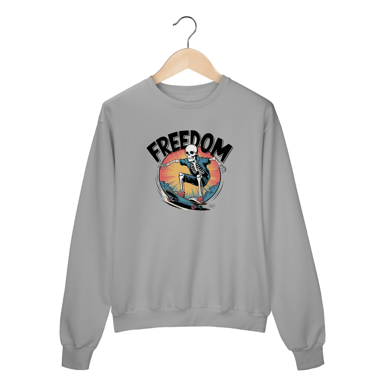Uma estampa ousada, dinâmica e desenhada à mão de um esqueleto andando de skate no estilo surrealismo. A estampa apresenta contornos pretos grossos, cores vibrantes e uma história em quadrinhos retrô. O texto "liberdade" aparece em fonte em negrito, sombreada e estilo vintage, colocada de forma proeminente dentro de uma composição circular. A arte reflete o espírito energético e rebelde da cultura do skate, com alto contraste e detalhes corajosos