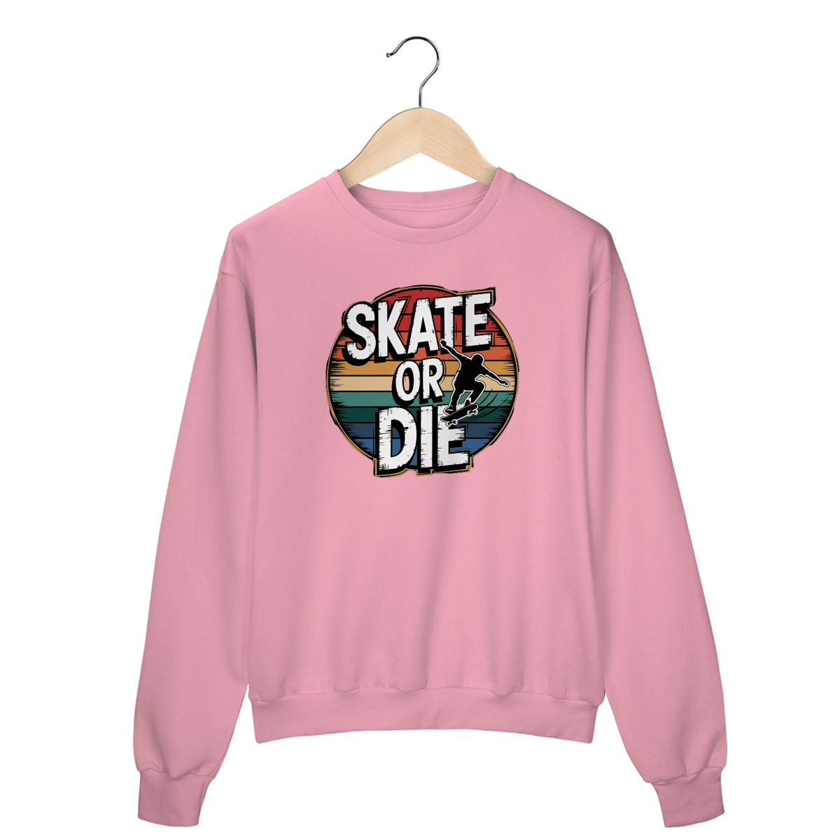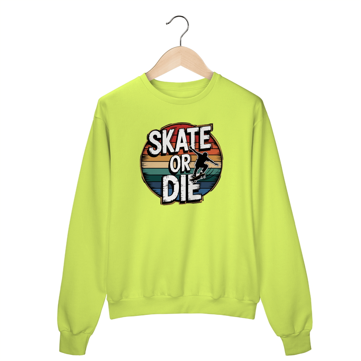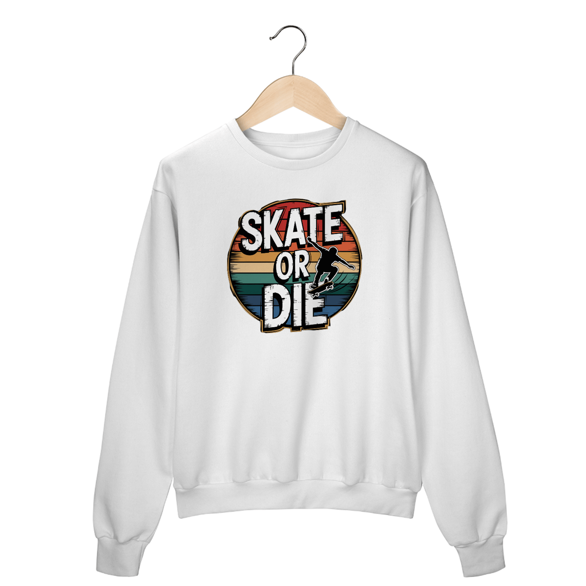 Uma estampa ousada e circular com um skatista no ar, executando um kickflip com estilo sem esforço. A silhueta é dinâmica, com rastros de movimento enfatizando velocidade e habilidade. Ao redor do skatista há um texto circular que diz "SKATE OR DIE" em letras brancas em negrito, dispostos em um estilo vintage e retrô com um visual levemente desgastado. Uma borda fina e dourada contorna o texto, com sombras adicionando profundidade. A composição circular é ainda mais realçada por listras horizontais em tons vibrantes de vermelho, laranja, amarelo, verde e azul, criando uma estética nostálgica e retrô contra um fundo preto.