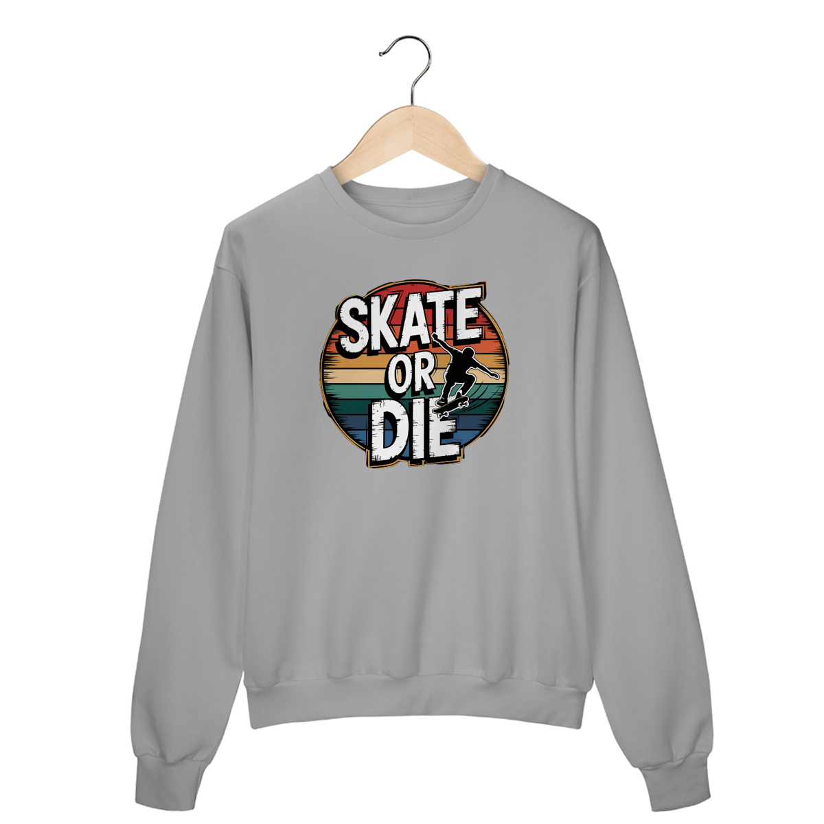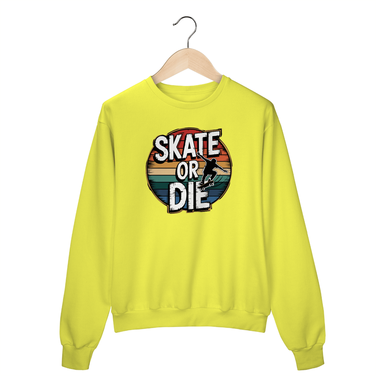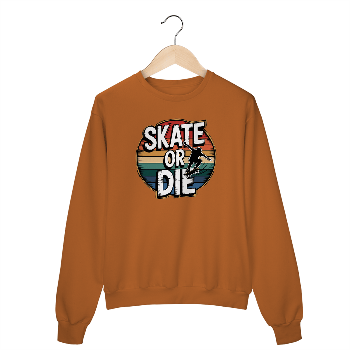 Uma estampa ousada e circular com um skatista no ar, executando um kickflip com estilo sem esforço. A silhueta é dinâmica, com rastros de movimento enfatizando velocidade e habilidade. Ao redor do skatista há um texto circular que diz "SKATE OR DIE" em letras brancas em negrito, dispostos em um estilo vintage e retrô com um visual levemente desgastado. Uma borda fina e dourada contorna o texto, com sombras adicionando profundidade. A composição circular é ainda mais realçada por listras horizontais em tons vibrantes de vermelho, laranja, amarelo, verde e azul, criando uma estética nostálgica e retrô contra um fundo preto.