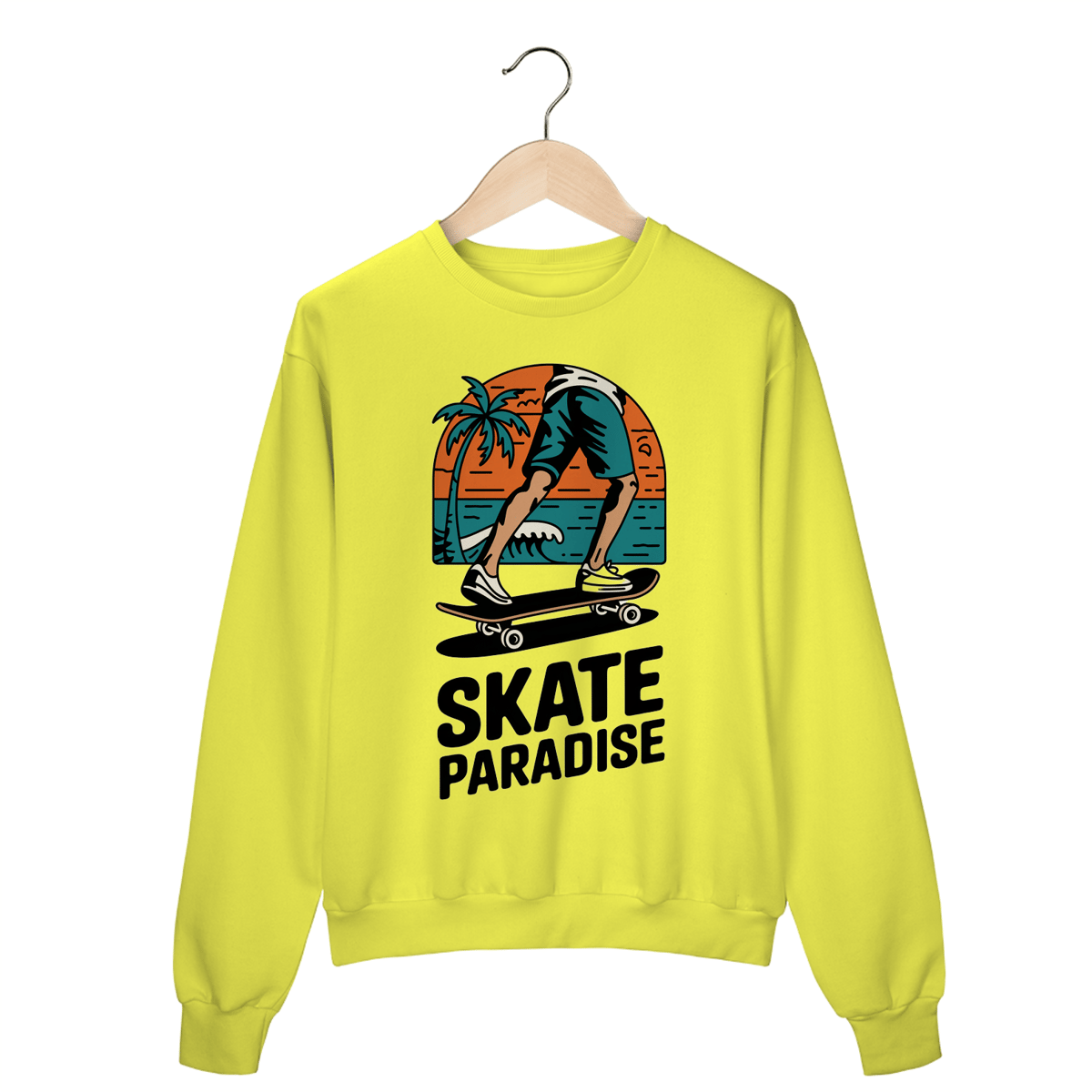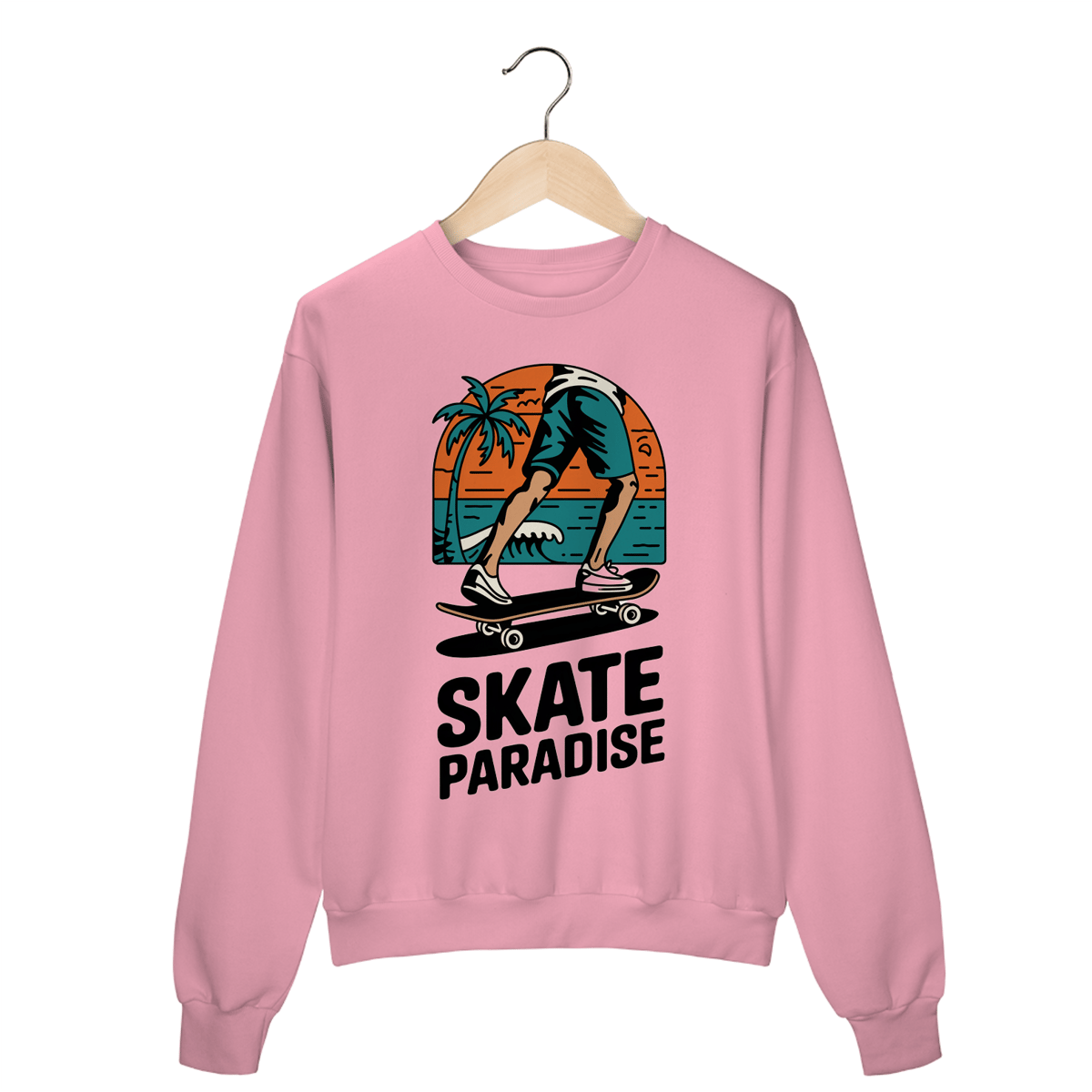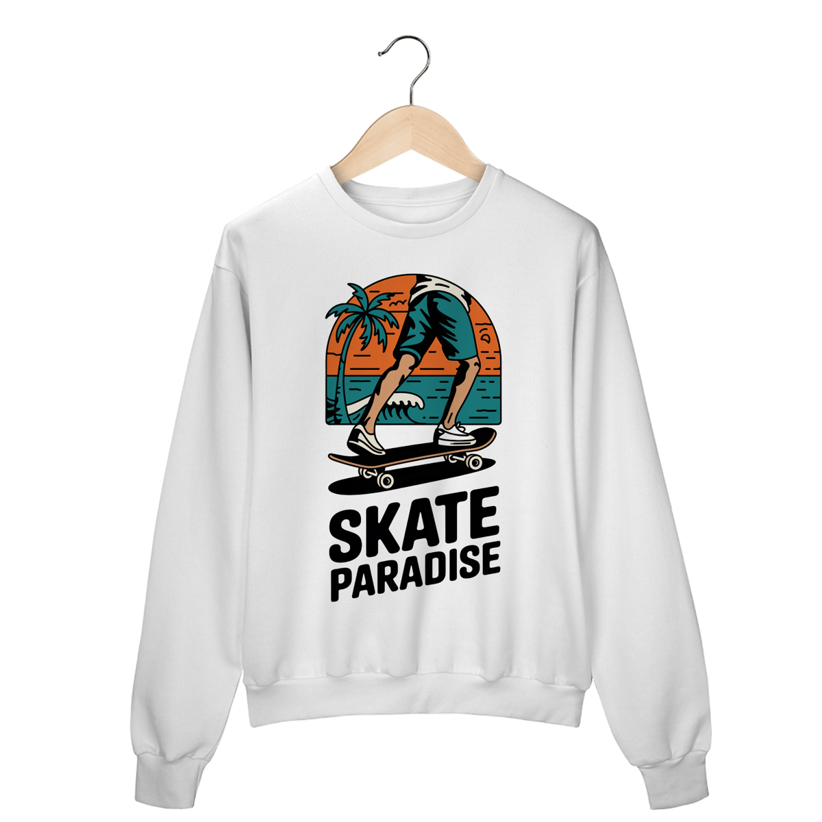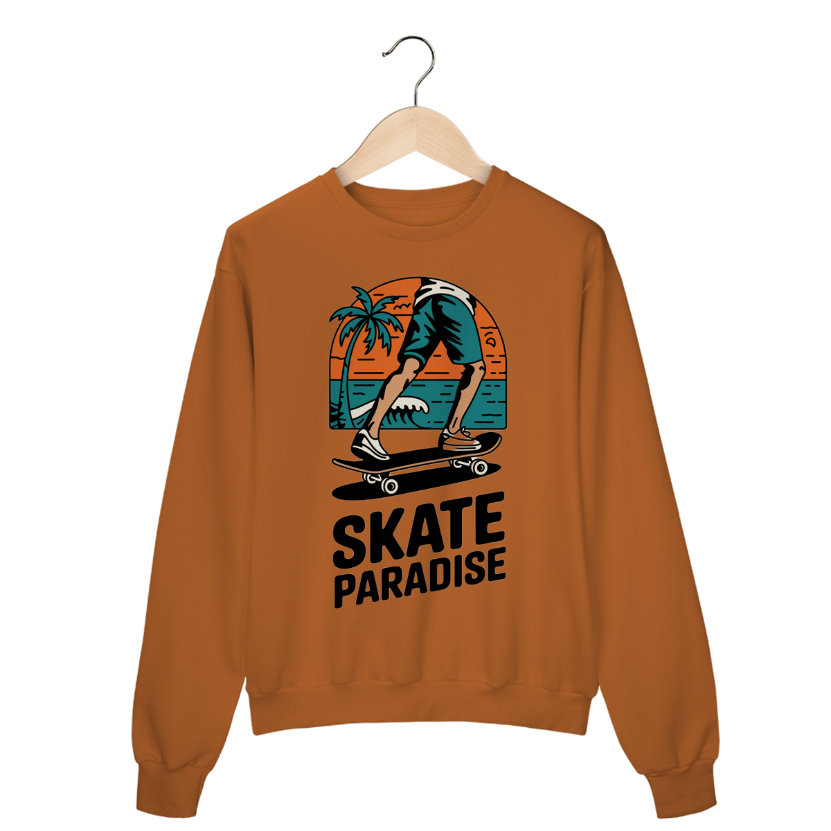 Uma estampa desenhada à mão de um logotipo estilo praia retrô para uma loja de skate. O logotipo apresenta uma arte de linha simples e limpa das pernas de um skatista empurrando um skate. Há uma palmeira no fundo e uma onda no oceano. O texto "Skate Paradise" está escrito em tons terrosos e ousados. O design geral tem um toque vintage e é moderno e atemporal.