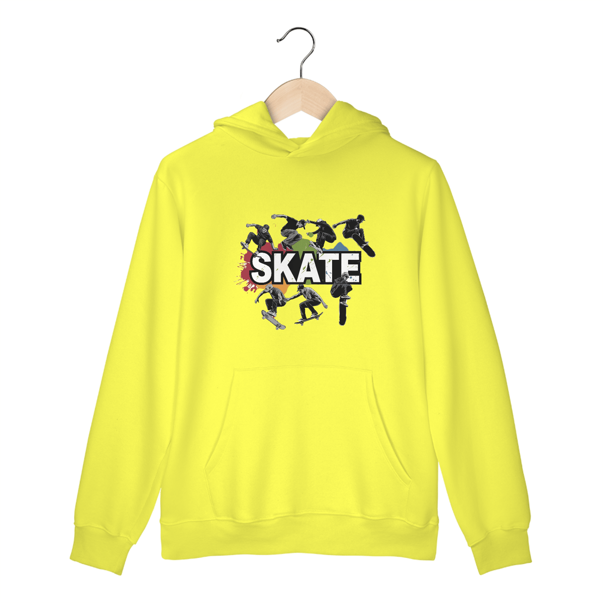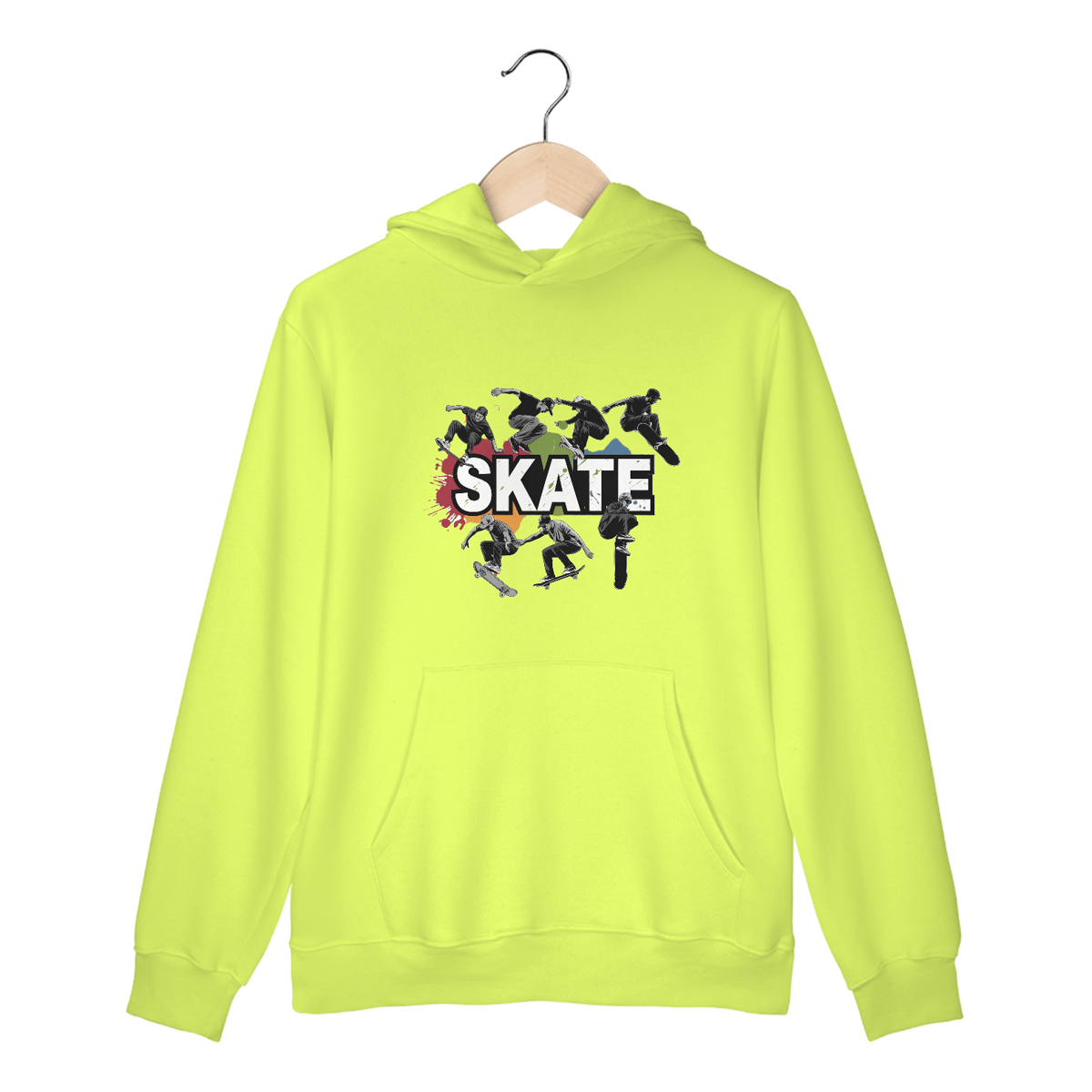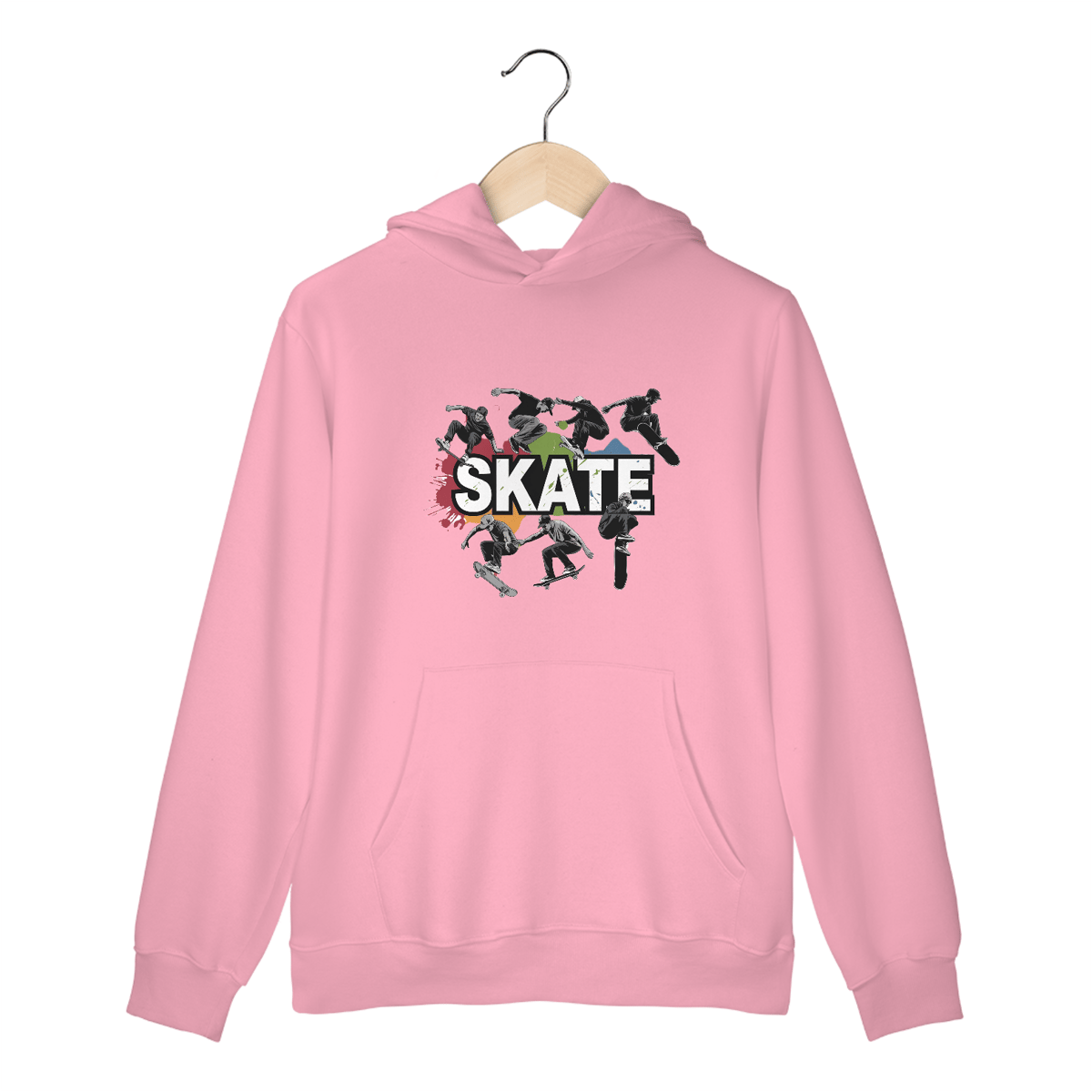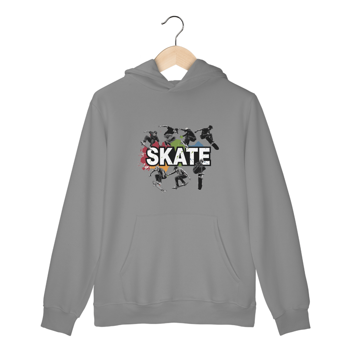 Uma estampa com o texto "Skate". Há vários skatistas em diferentes posições, alguns no ar com suas pranchas de lado. Há também respingos de cor ao redor do design.