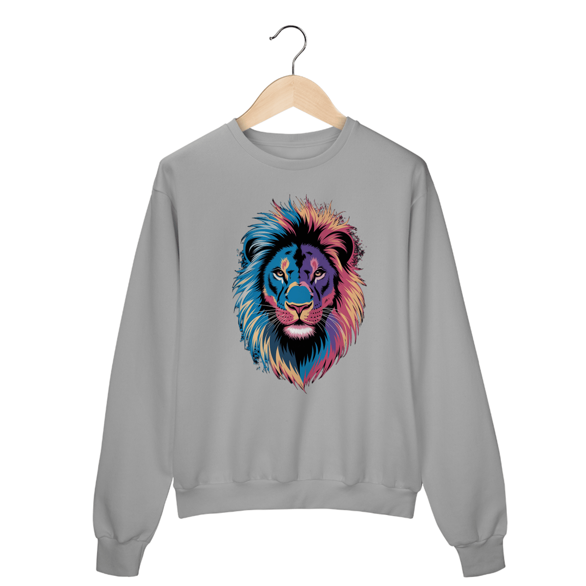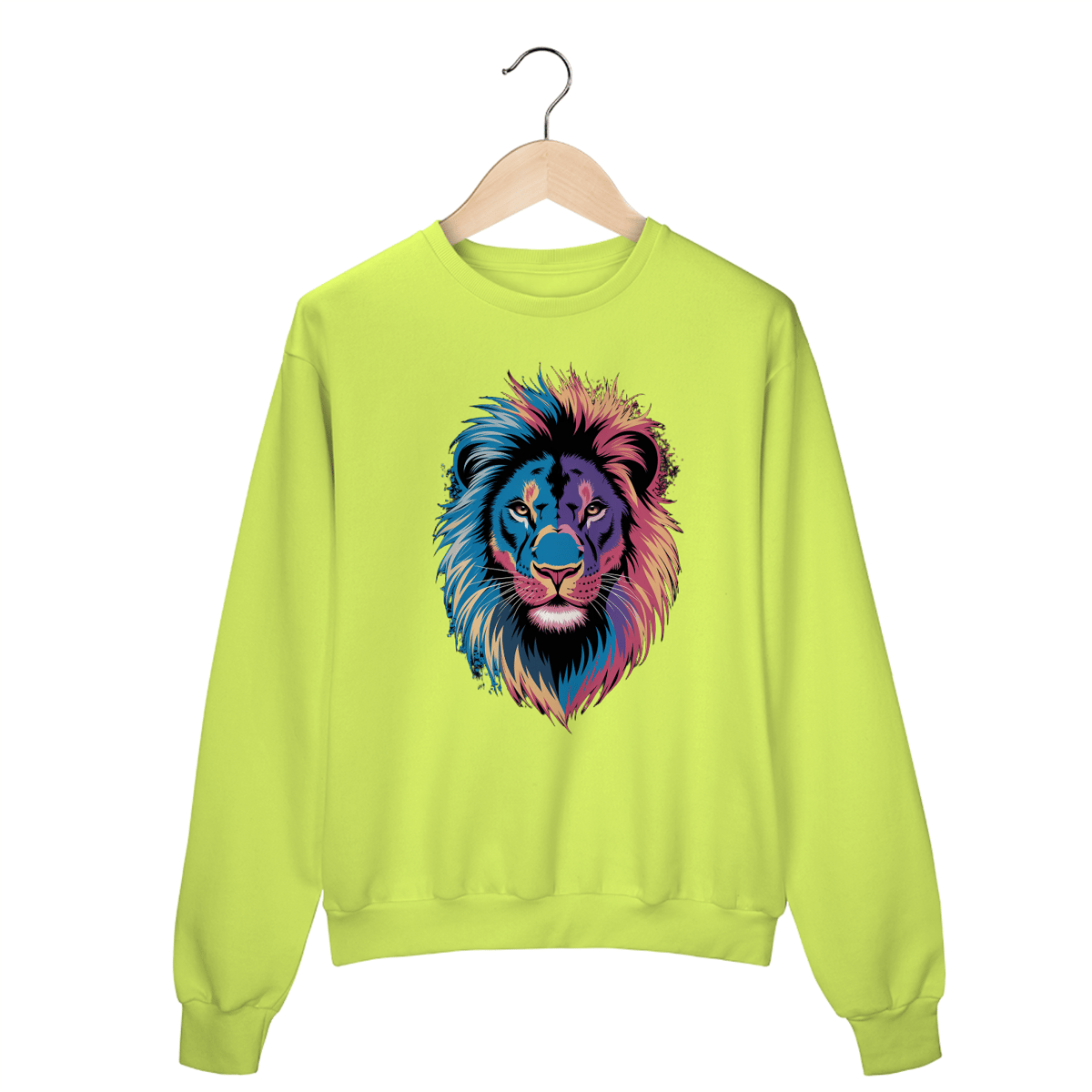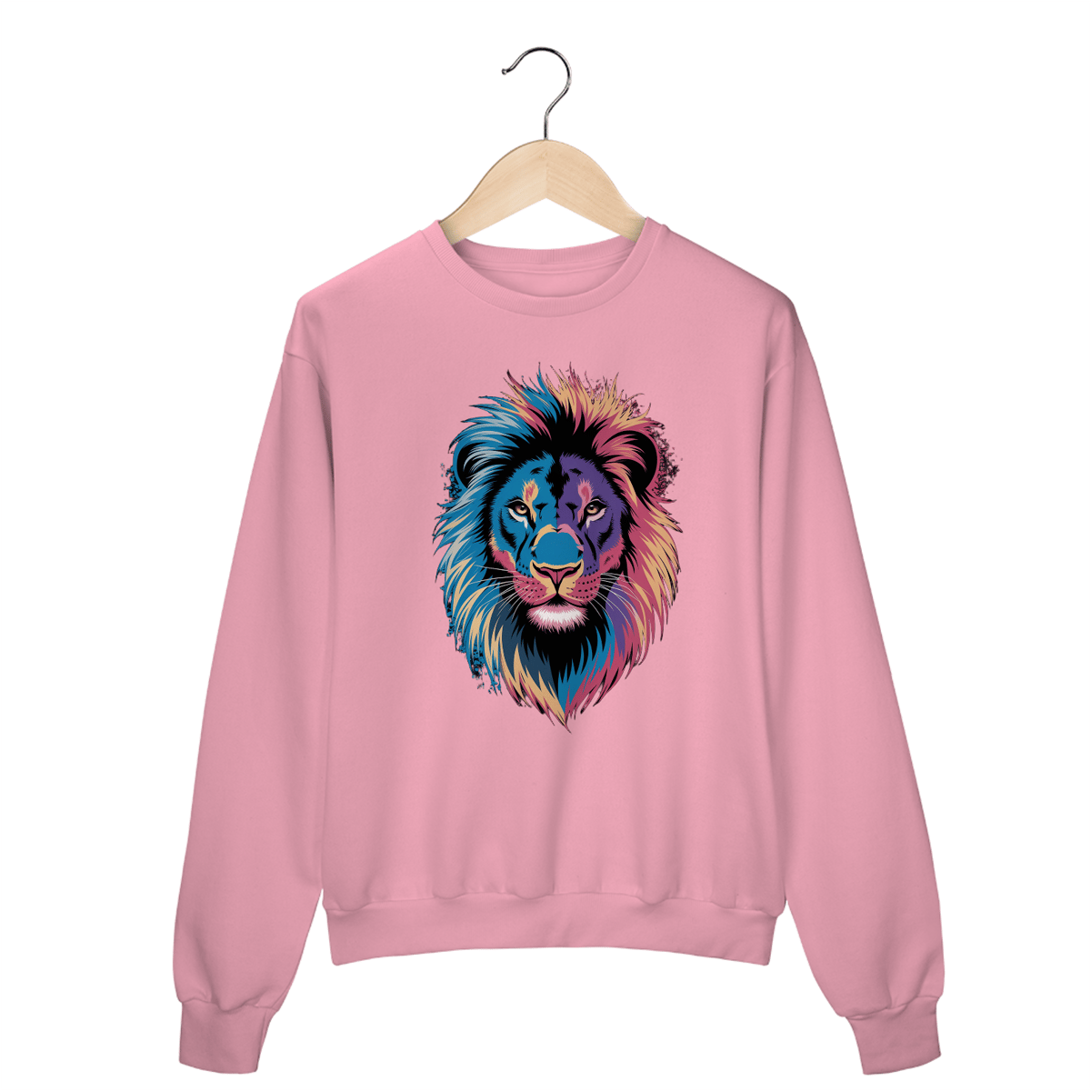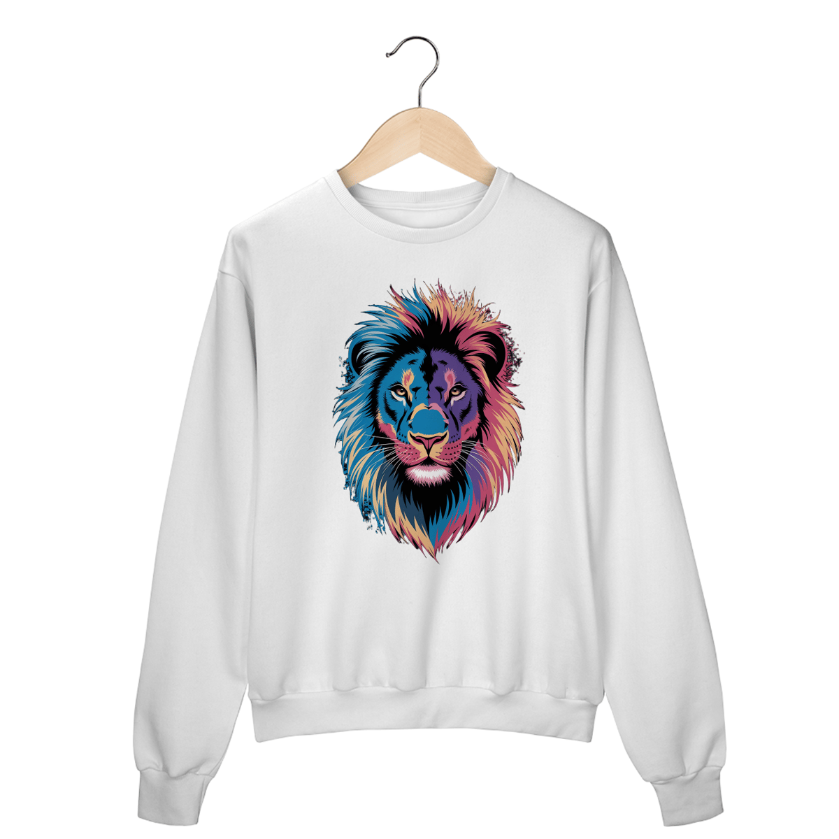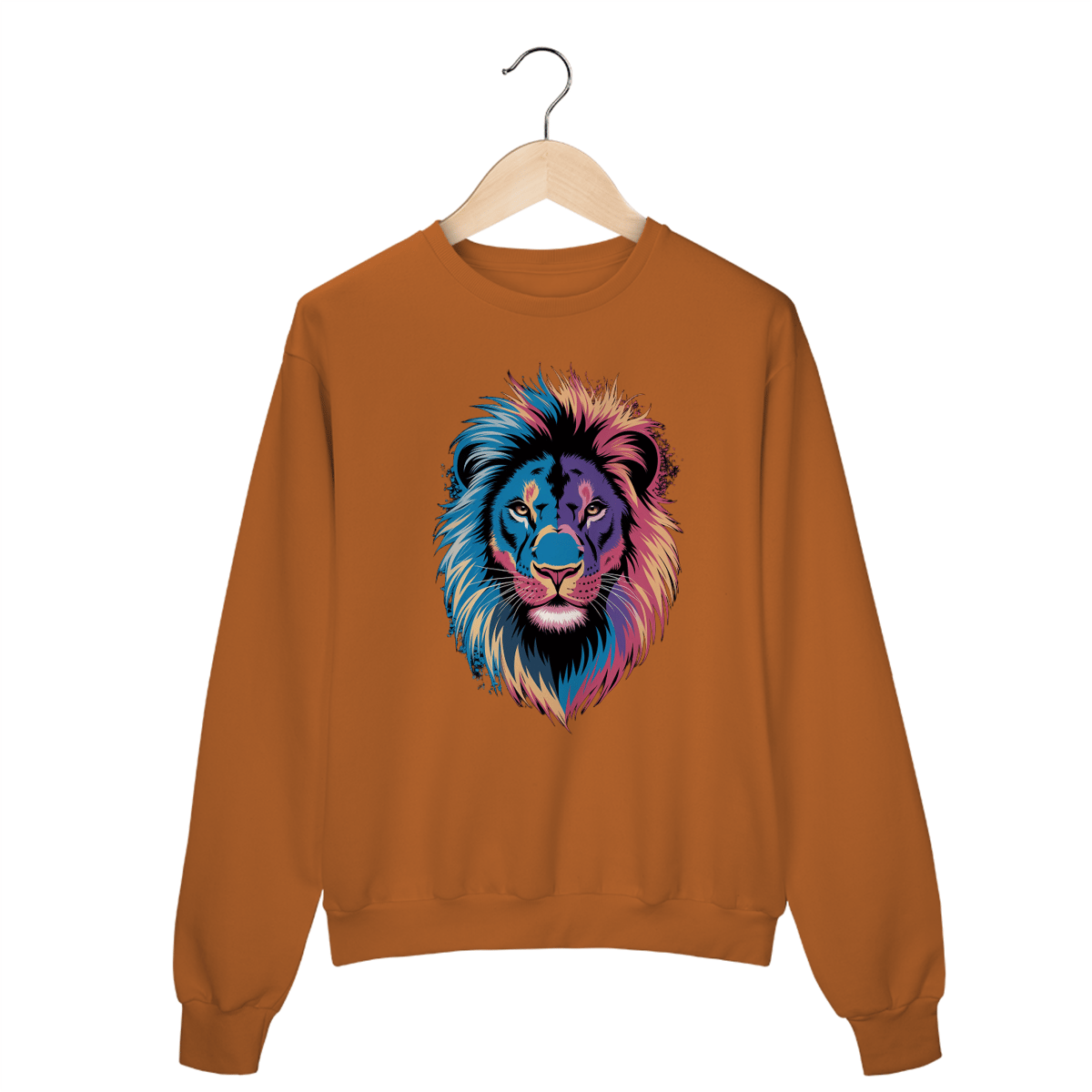 Uma estampa altamente detalhada e vívida de um gráfico leão com um fundo multicolorido. A estampa tem estética synthwave.