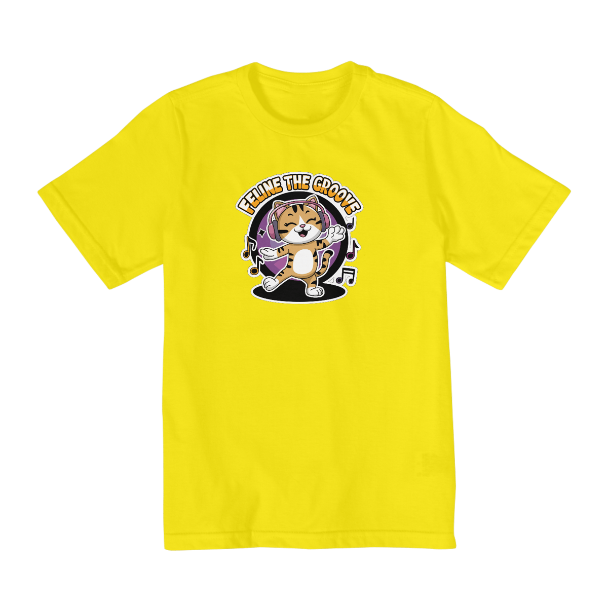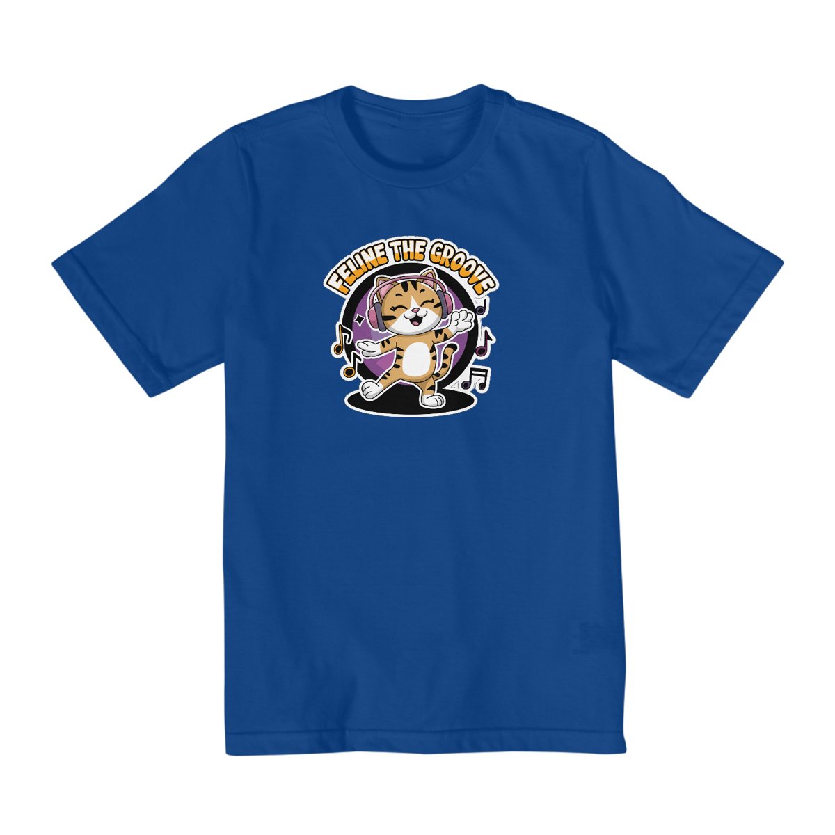 Uma estampa de desenho animado de um gato com fones de ouvido dançando. O gato está usando um par de fones de ouvido e está dançando com os olhos fechados. O fundo é uma nota musical. O texto acima do gato diz "Feline the Groove". O estilo é uma estampa de desenho animado.