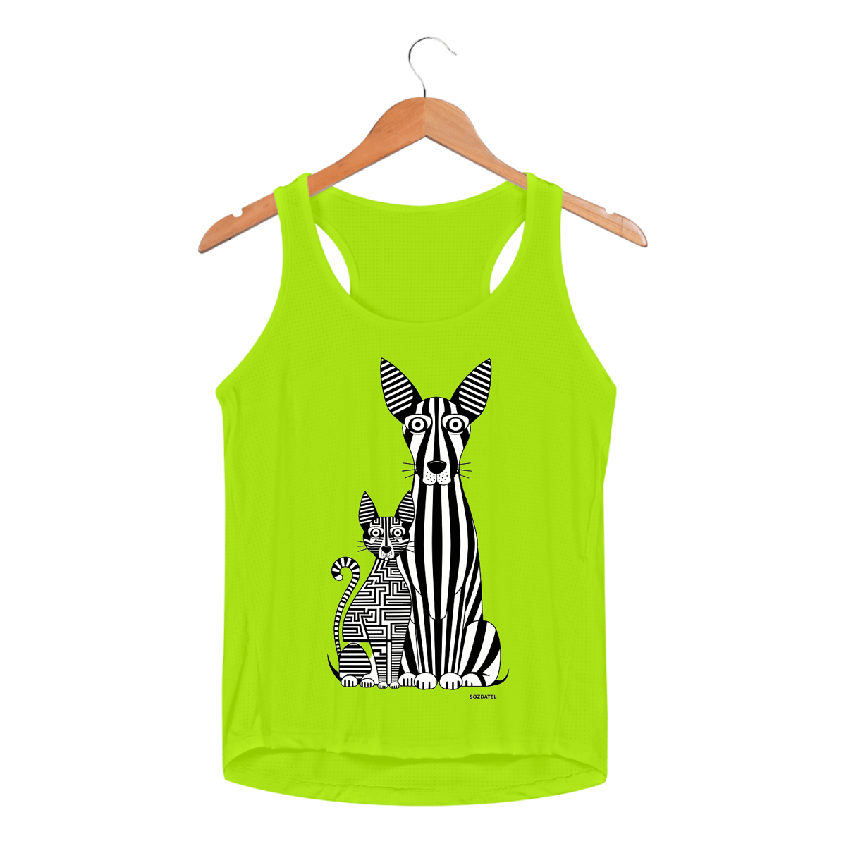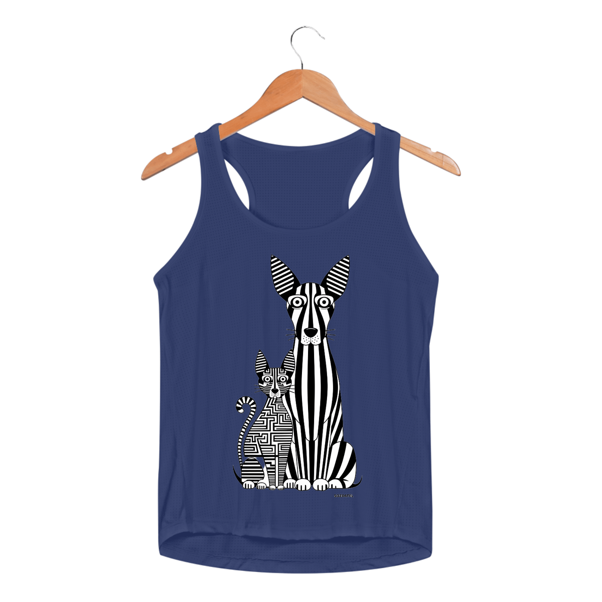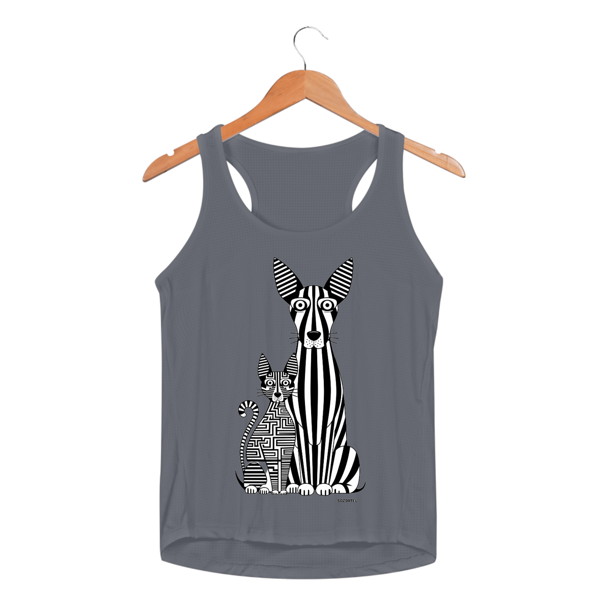 Uma estampa de  um cão e um gato alongados. O cão, com listras verticais que lembram um código de barras, tem olhos grandes e orelhas triangulares, enquanto o gato é formado por um labirinto complexo de linhas horizontais e verticais. Ambos os animais exibem seus olhos grandes e orelhas triangulares característicos, criando um design visualmente estimulante e único. O esquema de cores monocromático acrescenta simplicidade e sofisticação à arte.