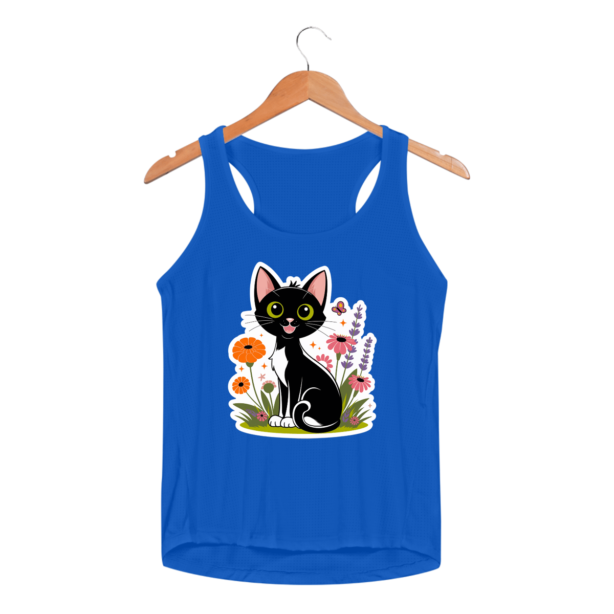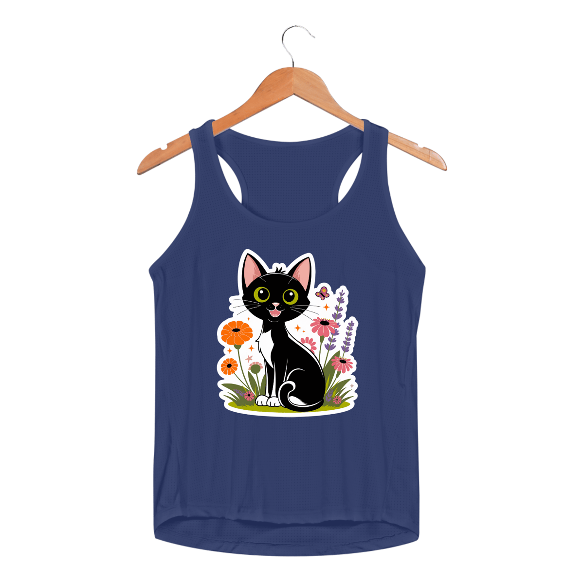 Estampa de um gato preto charmoso, estilo desenho animado, sentado entre um canteiro de flores vibrantes, com  olhos amarelos brilhantes e um sorriso brincalhão, com o rabo enrolado perfeitamente em volta das patas.  cercado com flores como calêndulas laranja, zínias rosas e lavanda roxa, junto com folhas verdes e grama e uma borboleta pairando para um toque caprichoso.