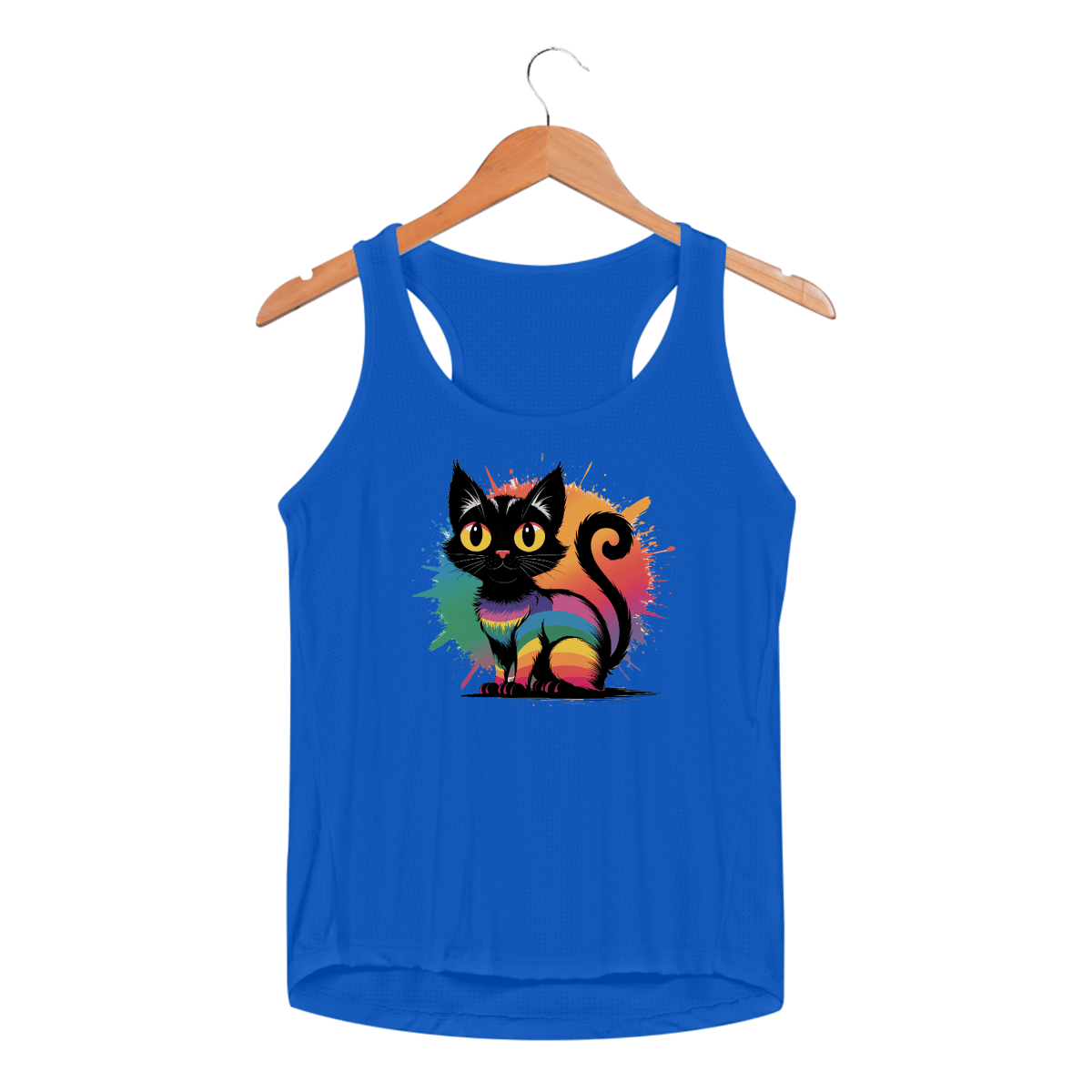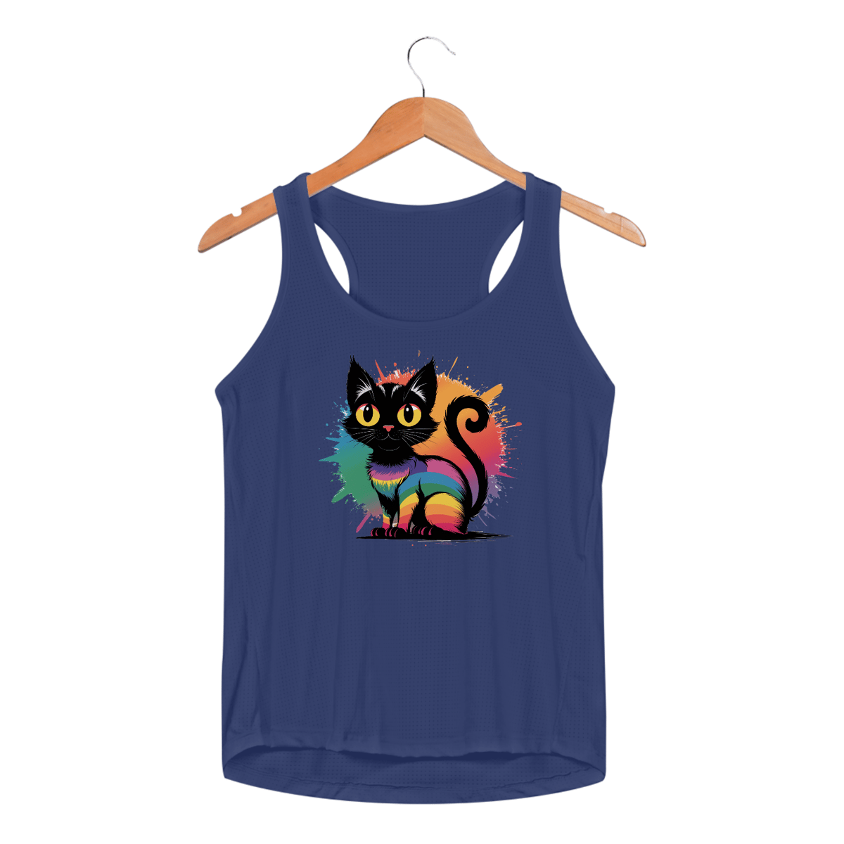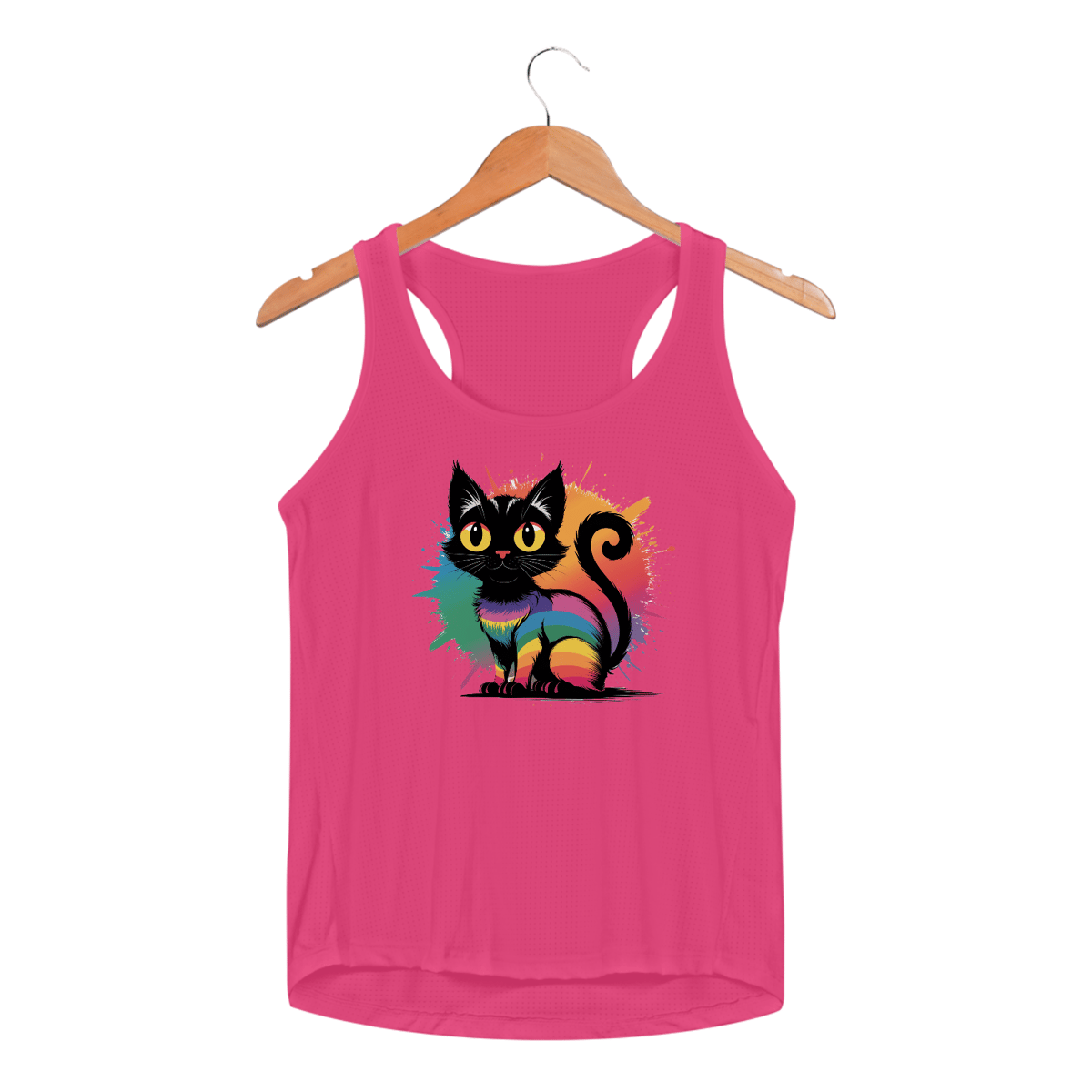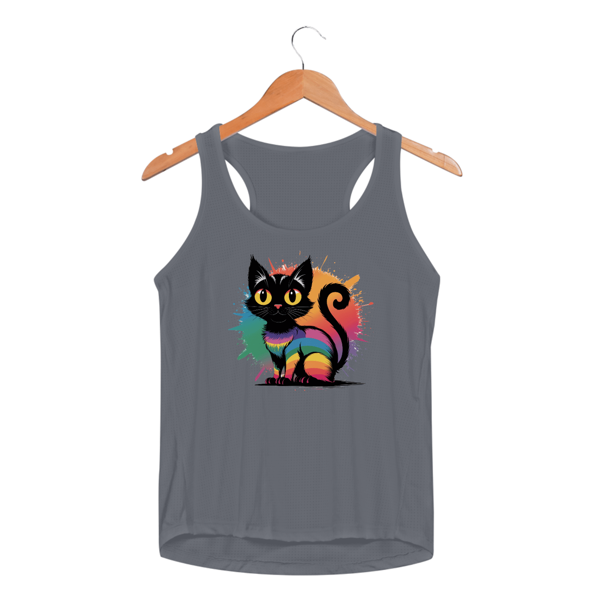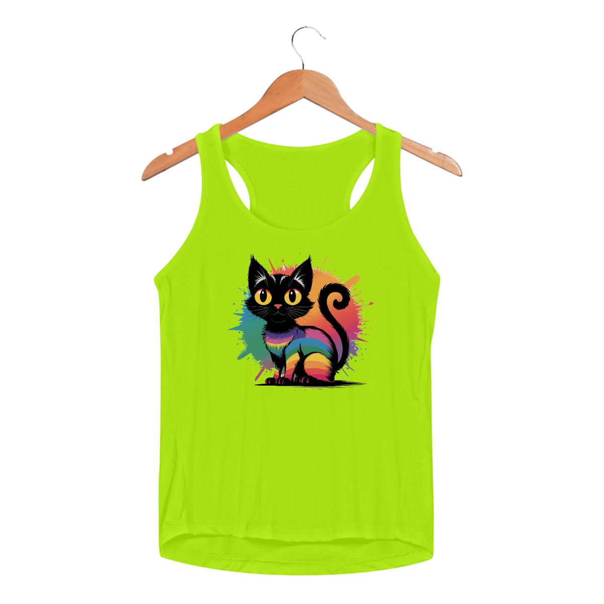 Uma regata UV com estampa psicodélica de uma silhueta de gato preto com pelo de arco-íris.