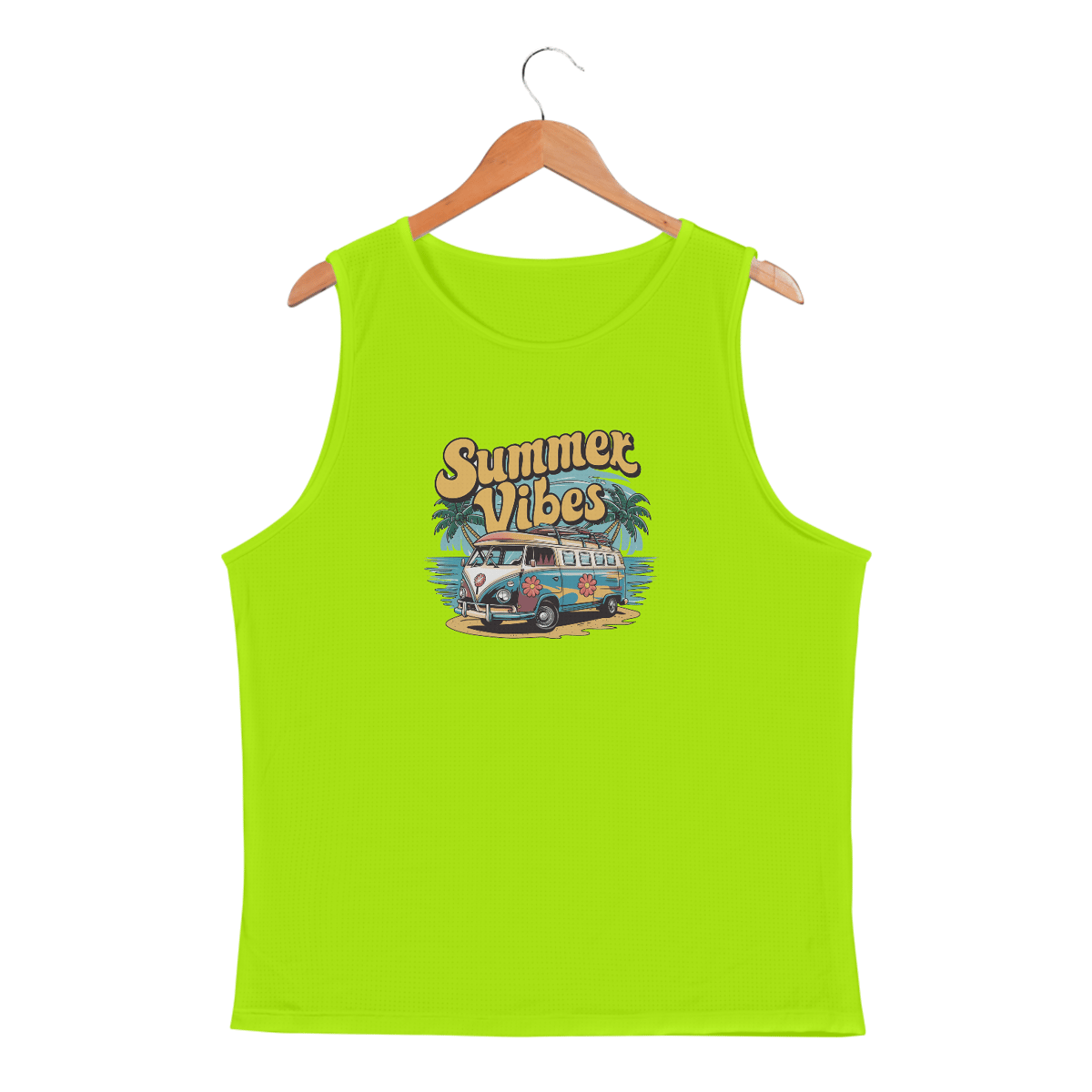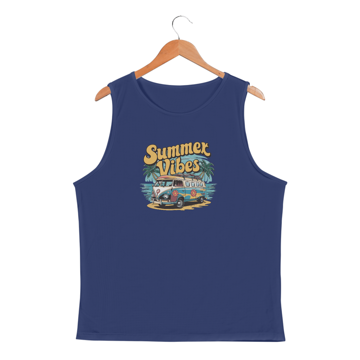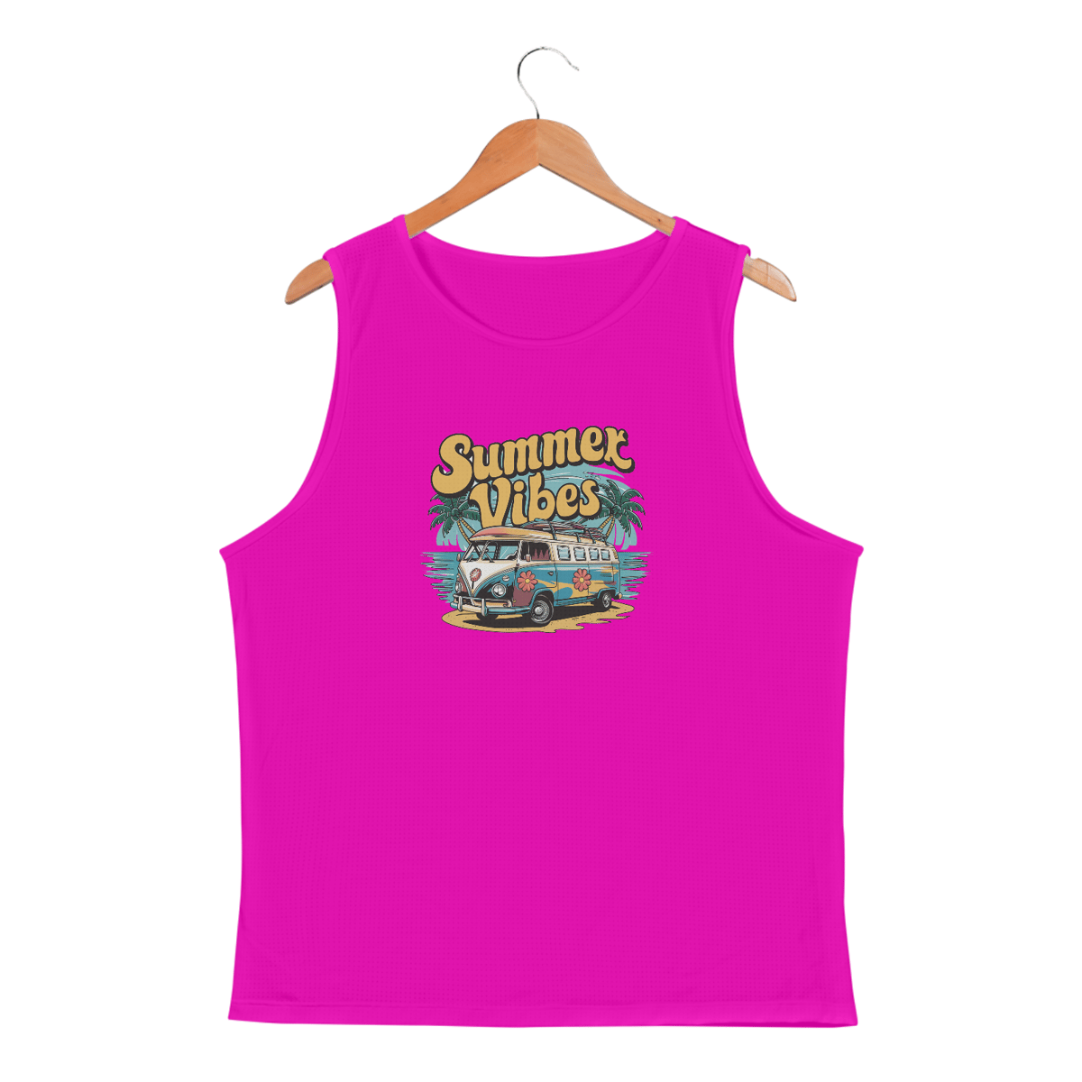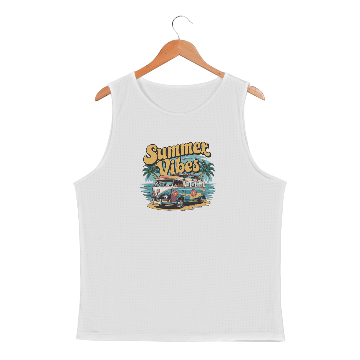 Uma estampa impressionante de uma van de surf estacionada em uma praia ensolarada, com as palavras "Summer Vibes" escritas em uma fonte retrô e descolada. A van tem uma paleta de cores vibrantes e é adornada com suportes para pranchas de surfe e um design florido. O meio termo apresenta palmeiras balançando na brisa e um oceano azul claro com ondas suaves. O design geral é perfeito para uma estampa de camiseta e exala uma atmosfera relaxada.