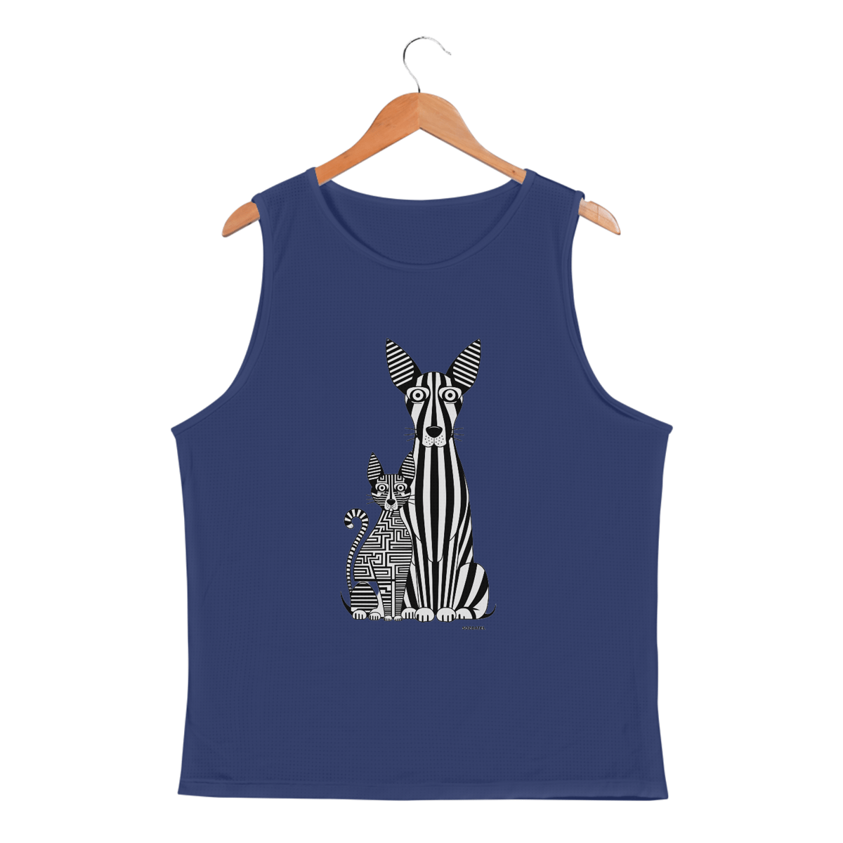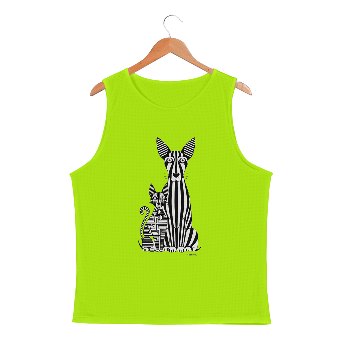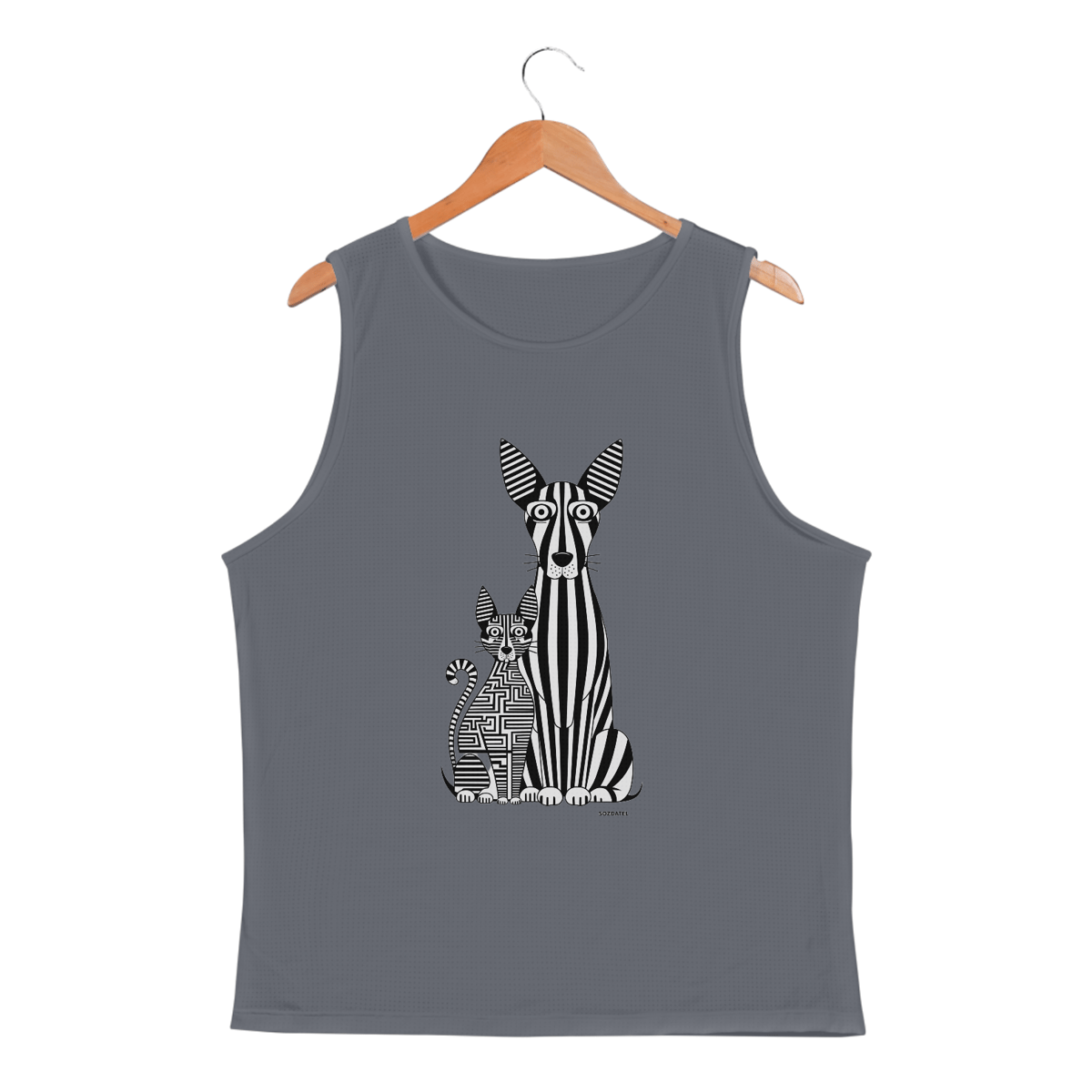 Uma estampa de  um cão e um gato alongados. O cão, com listras verticais que lembram um código de barras, tem olhos grandes e orelhas triangulares, enquanto o gato é formado por um labirinto complexo de linhas horizontais e verticais. Ambos os animais exibem seus olhos grandes e orelhas triangulares característicos, criando um design visualmente estimulante e único. O esquema de cores monocromático acrescenta simplicidade e sofisticação à arte.