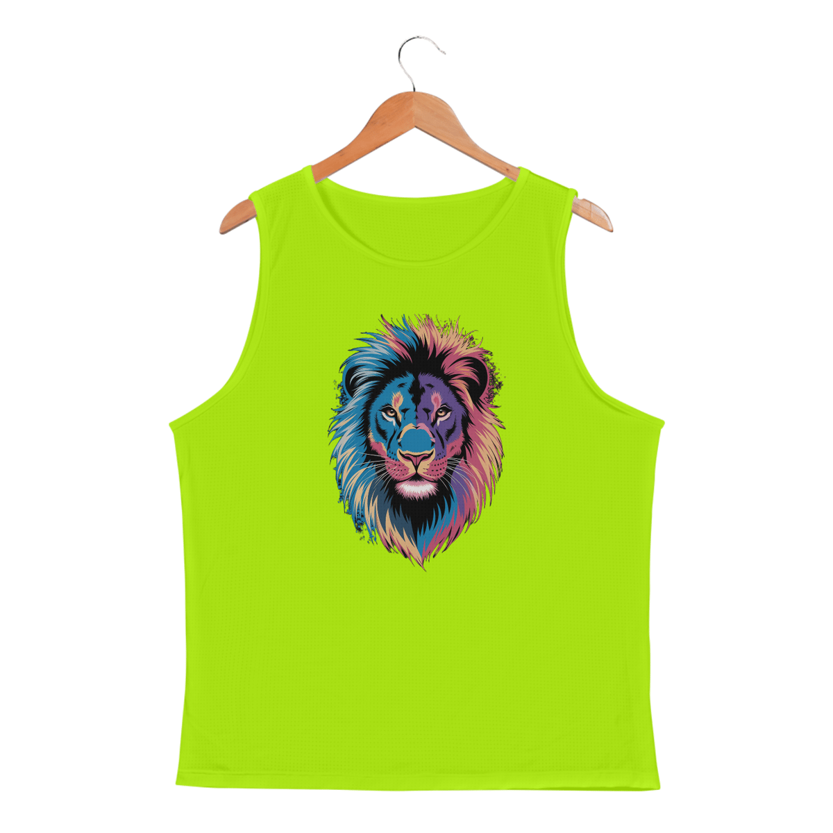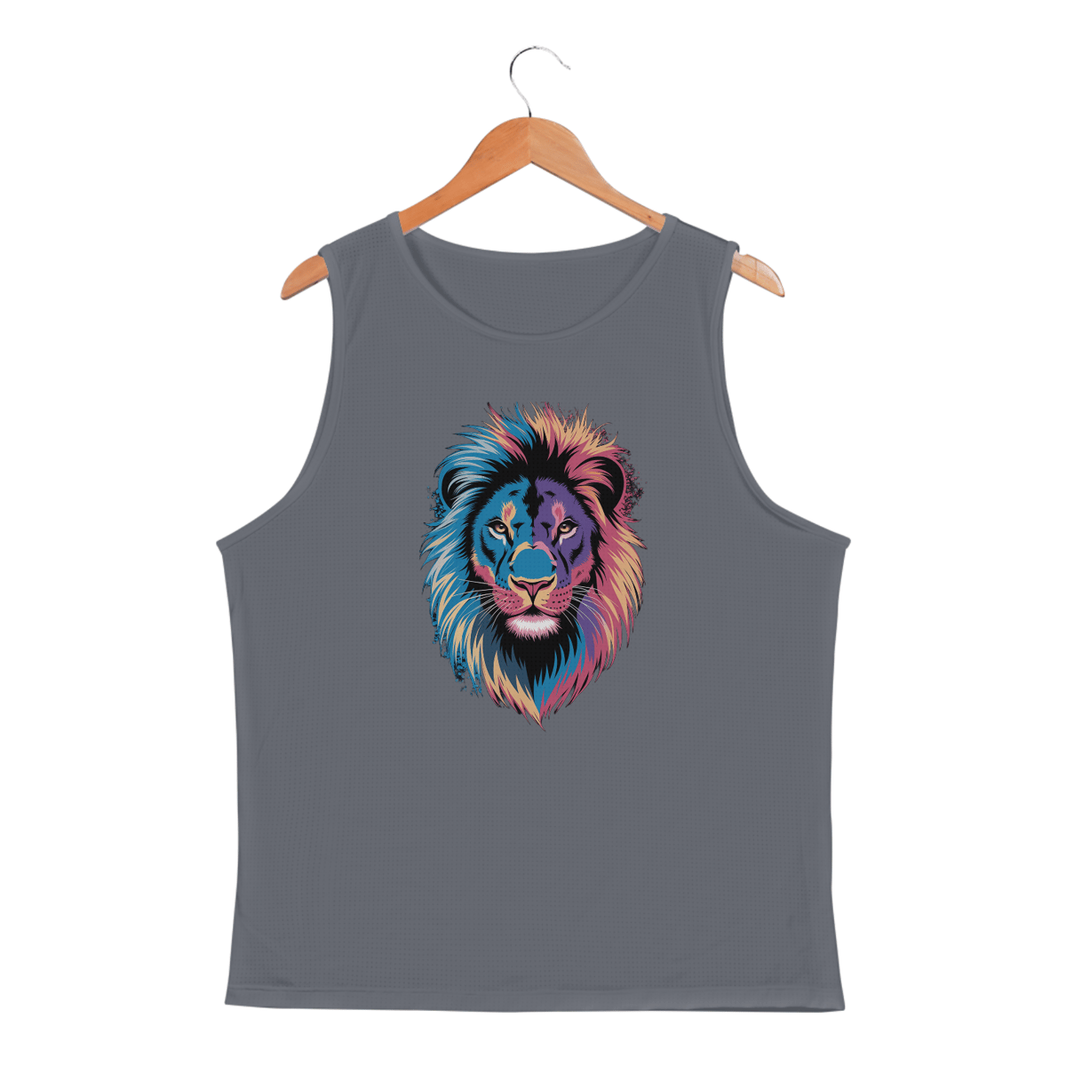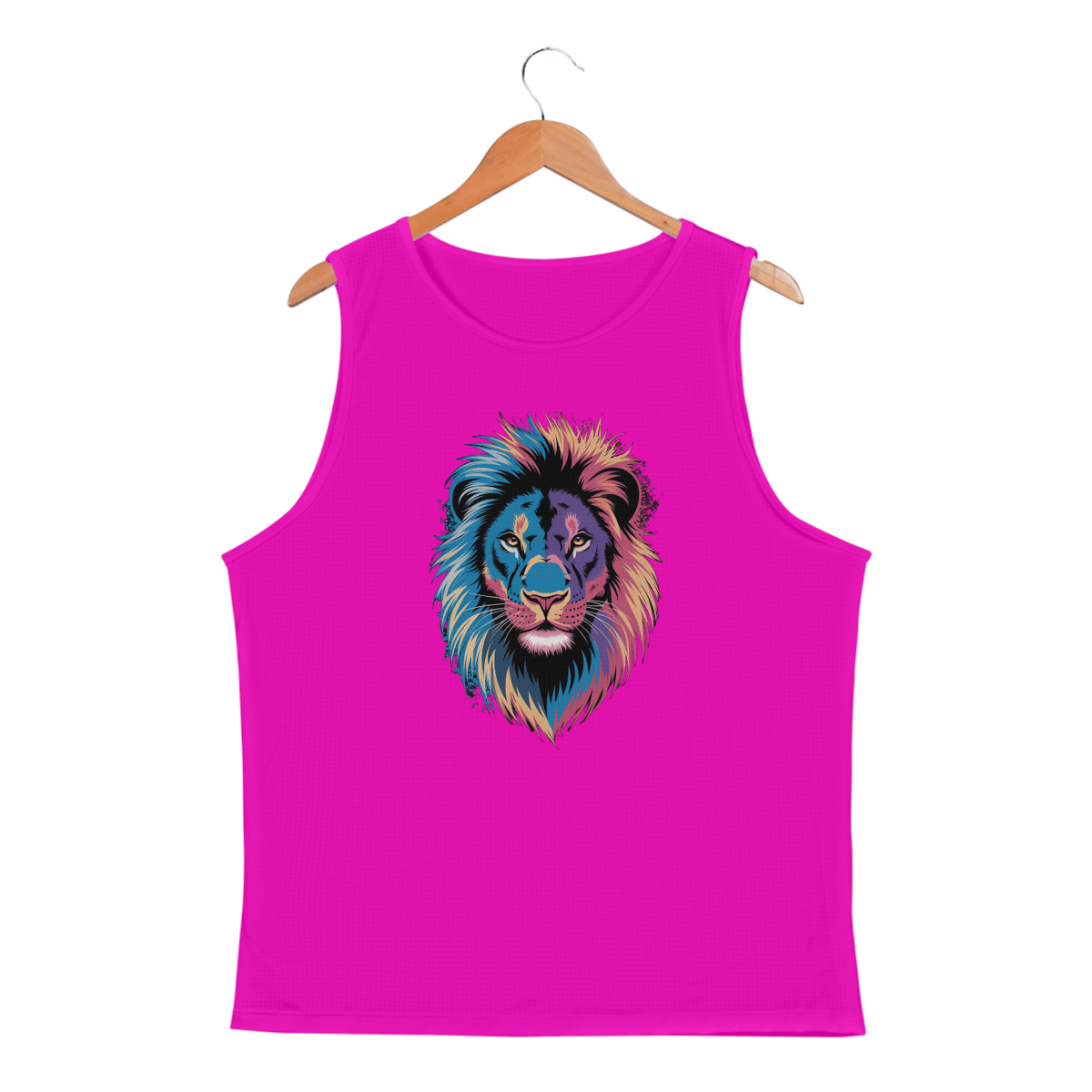 Uma estampa altamente detalhada e vívida de um gráfico leão com um fundo multicolorido. A estampa tem estética synthwave.