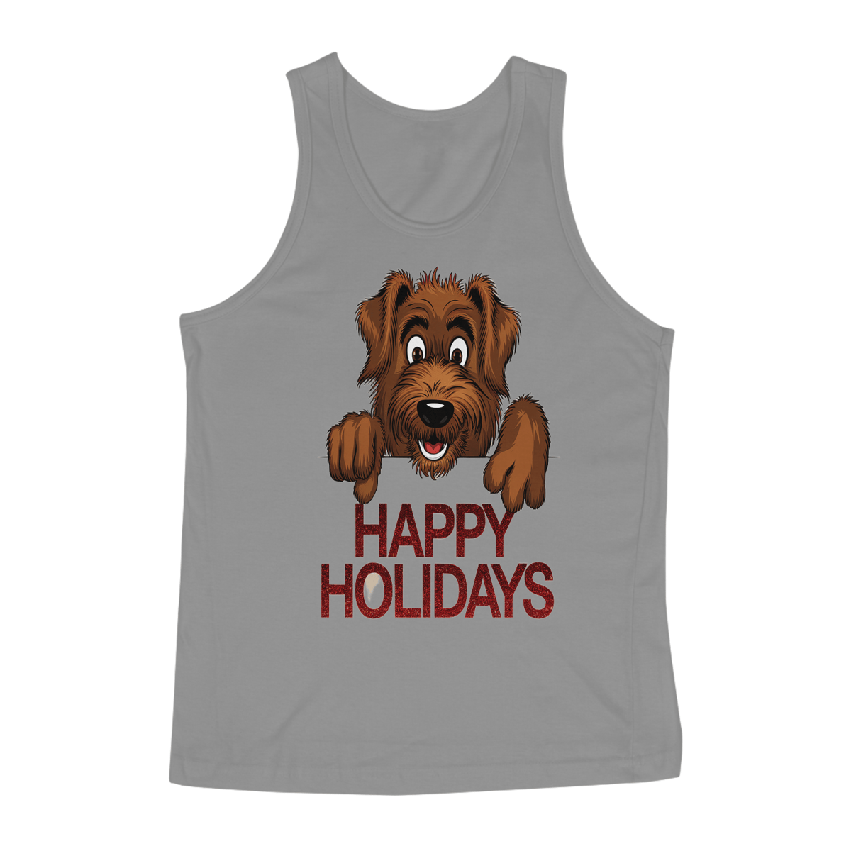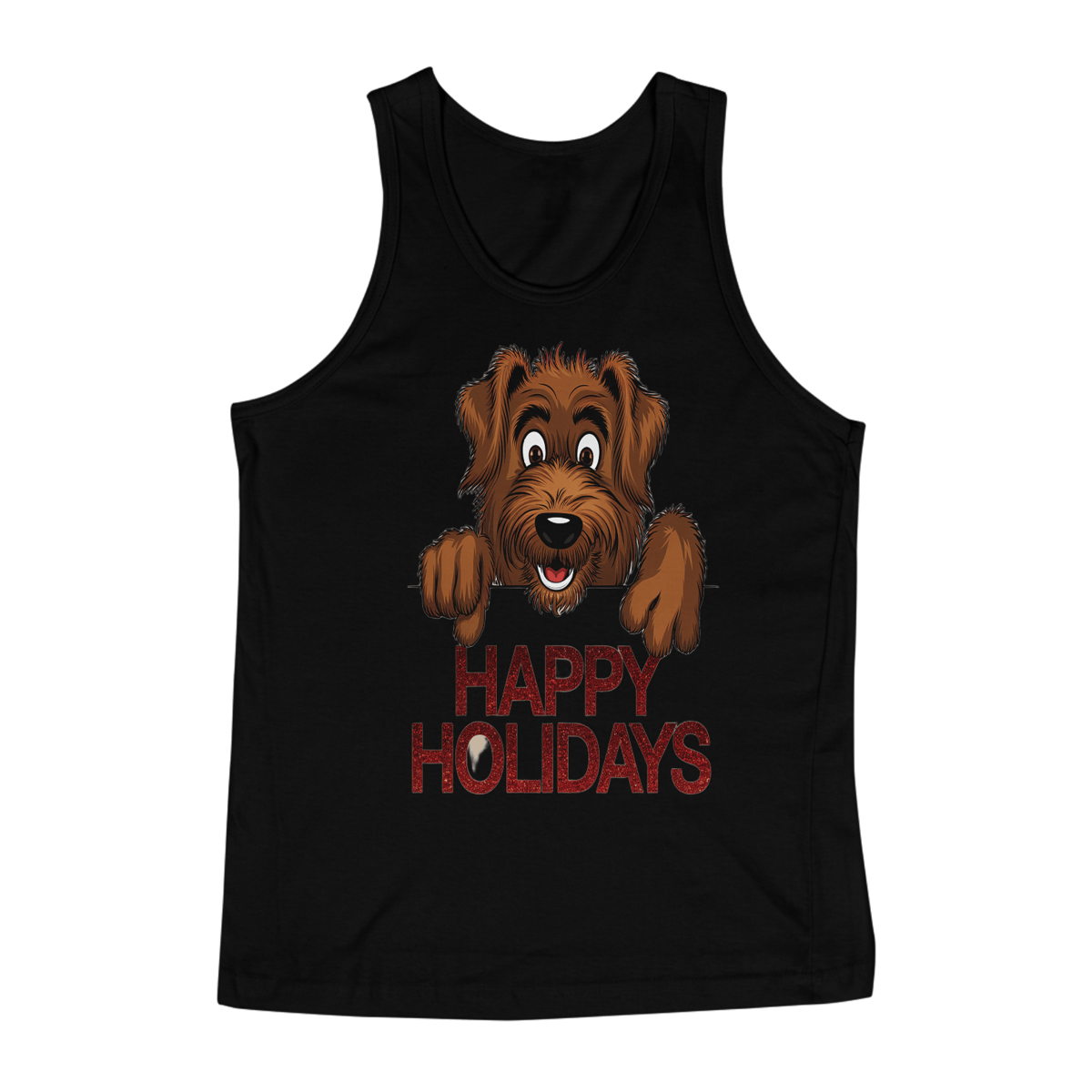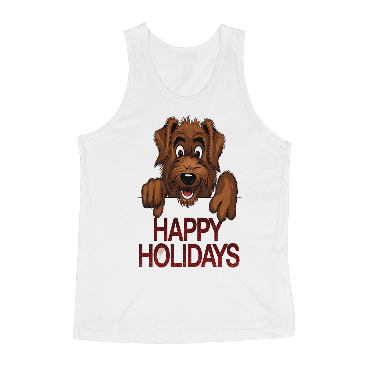 Regata com Estampa Camaleon de um cão marrom desleixado com um sorriso largo, apontando para baixo. Abaixo do cão, há um texto vermelho brilhante e em negrito que diz "Boas Festas".