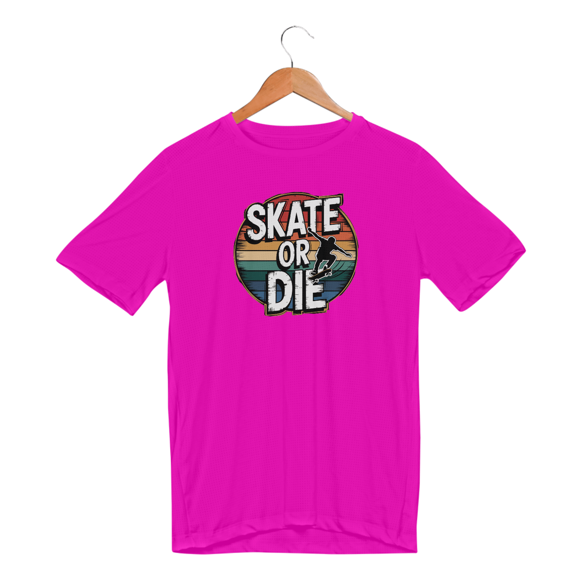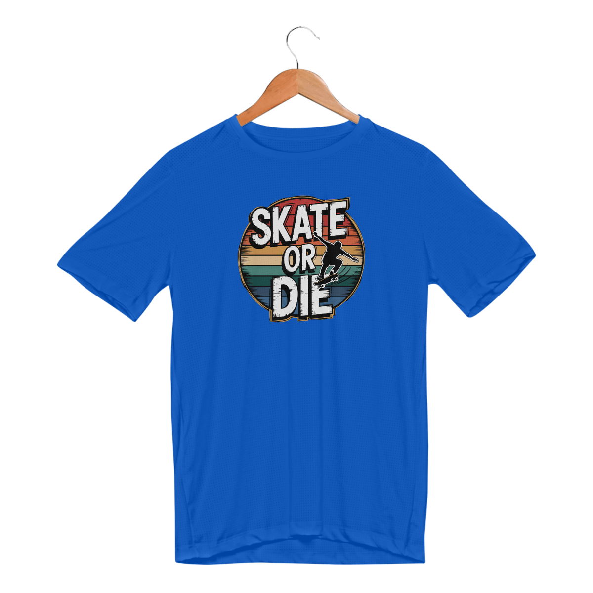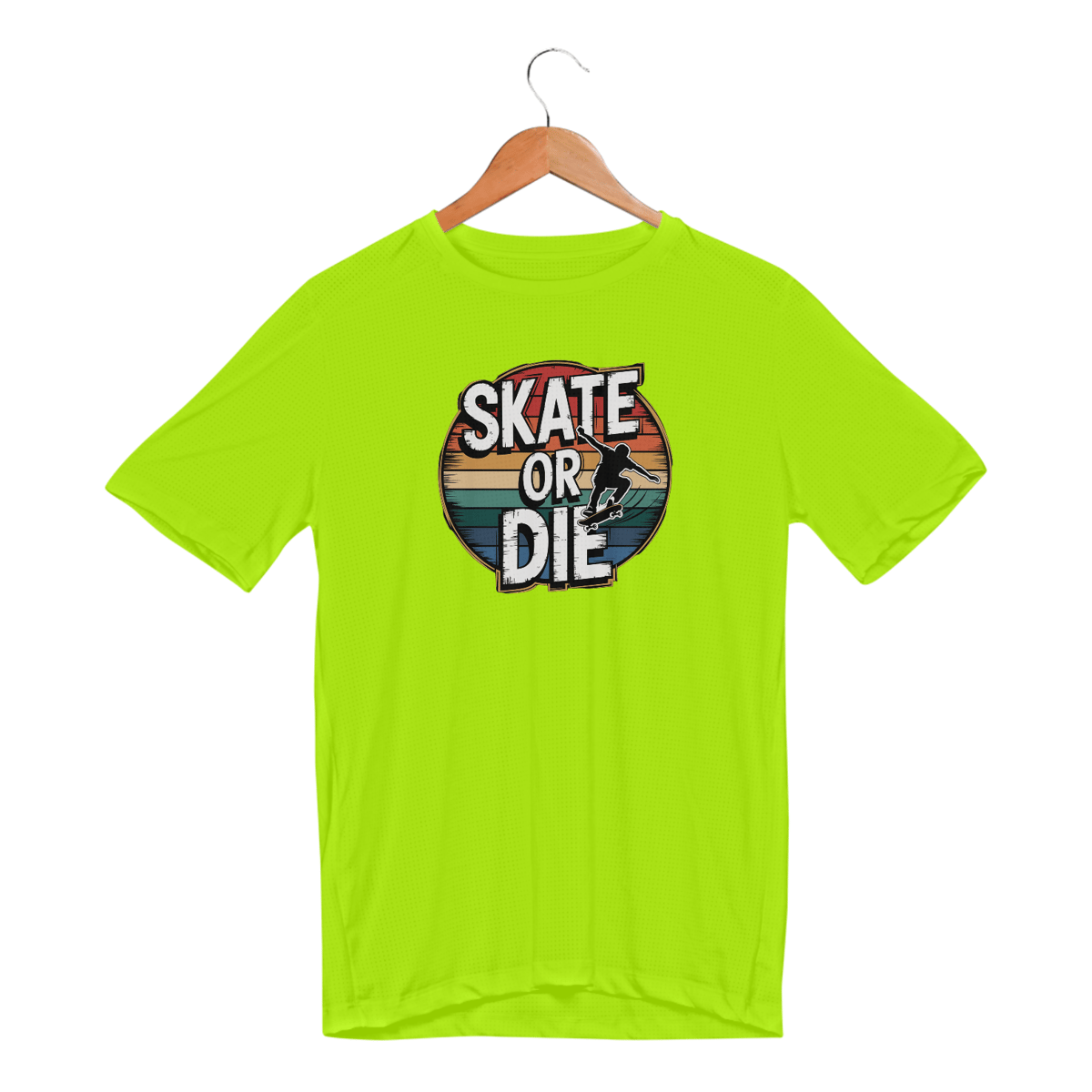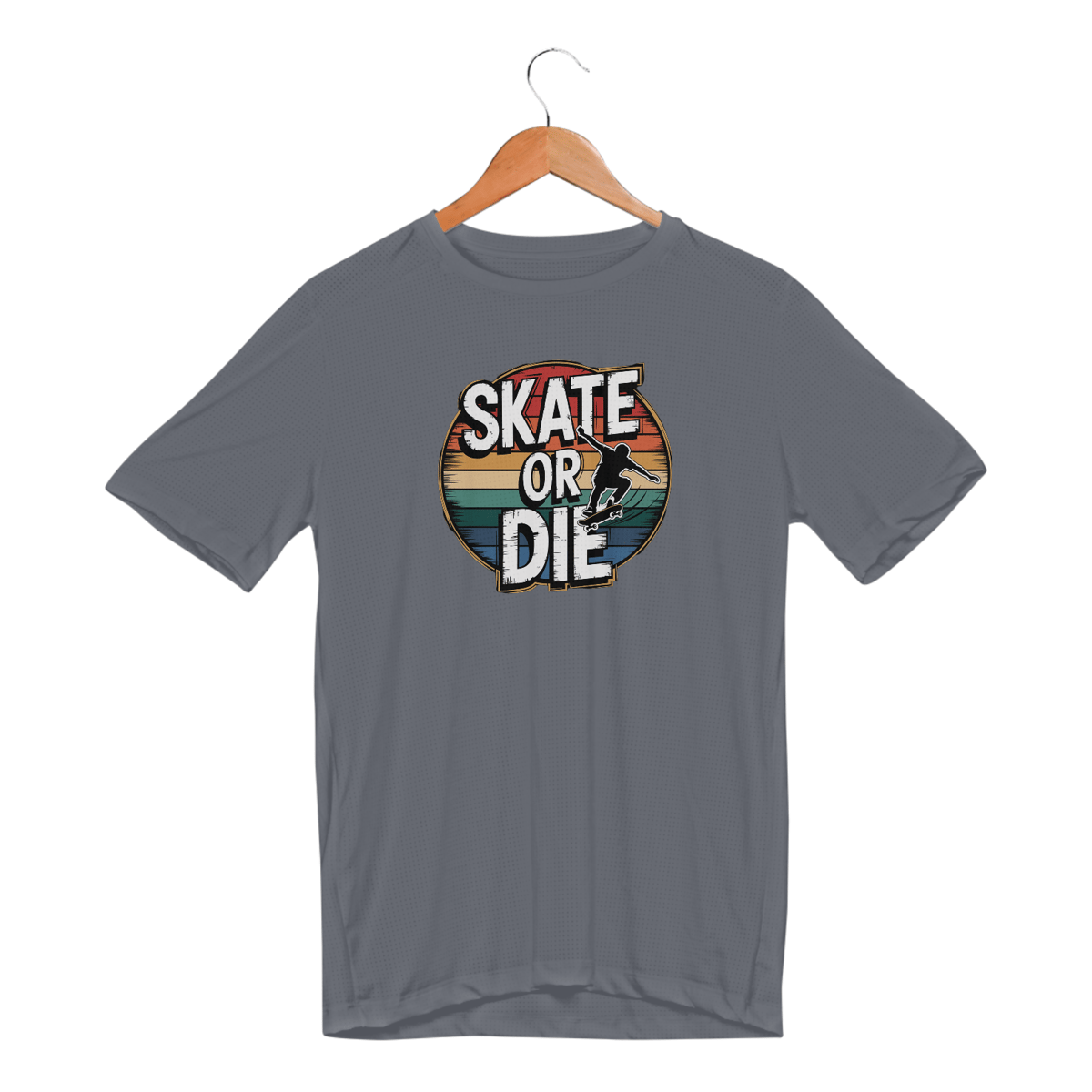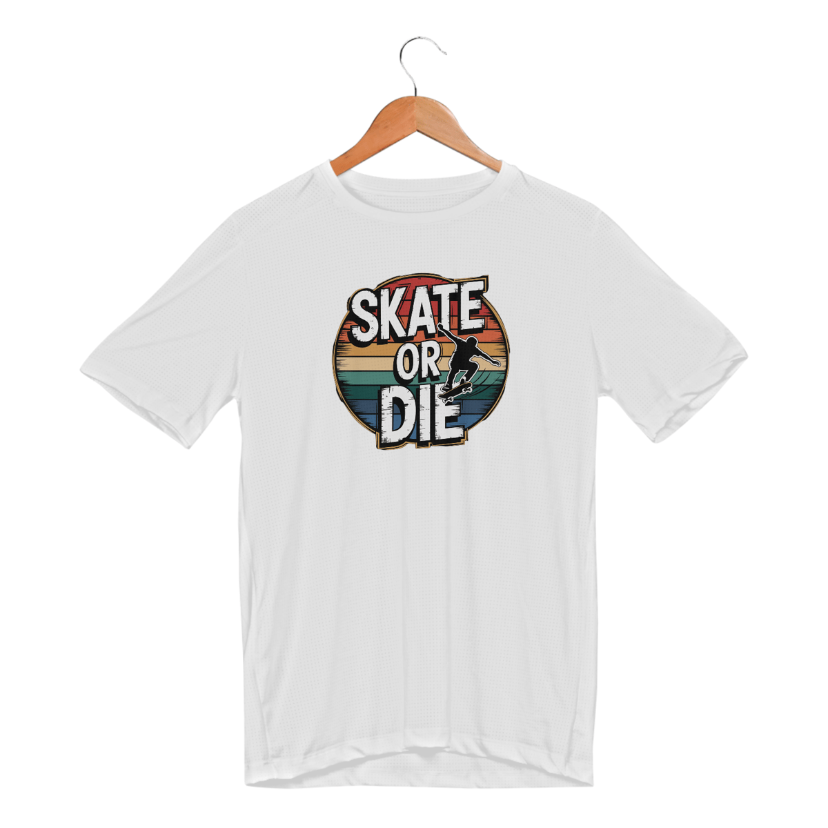Uma estampa ousada e circular com um skatista no ar, executando um kickflip com estilo sem esforço. A silhueta é dinâmica, com rastros de movimento enfatizando velocidade e habilidade. Ao redor do skatista há um texto circular que diz "SKATE OR DIE" em letras brancas em negrito, dispostos em um estilo vintage e retrô com um visual levemente desgastado. Uma borda fina e dourada contorna o texto, com sombras adicionando profundidade. A composição circular é ainda mais realçada por listras horizontais em tons vibrantes de vermelho, laranja, amarelo, verde e azul, criando uma estética nostálgica e retrô contra um fundo preto.