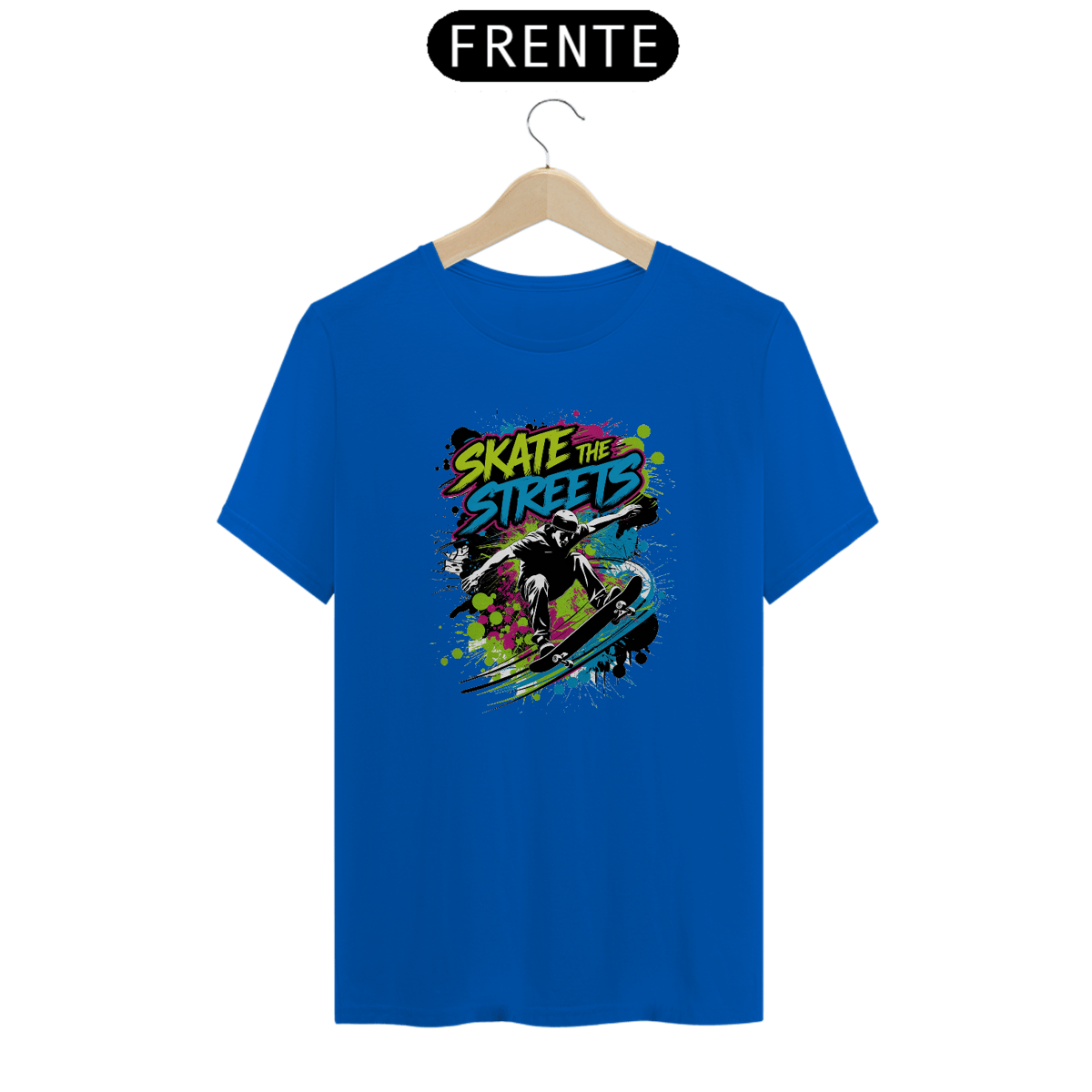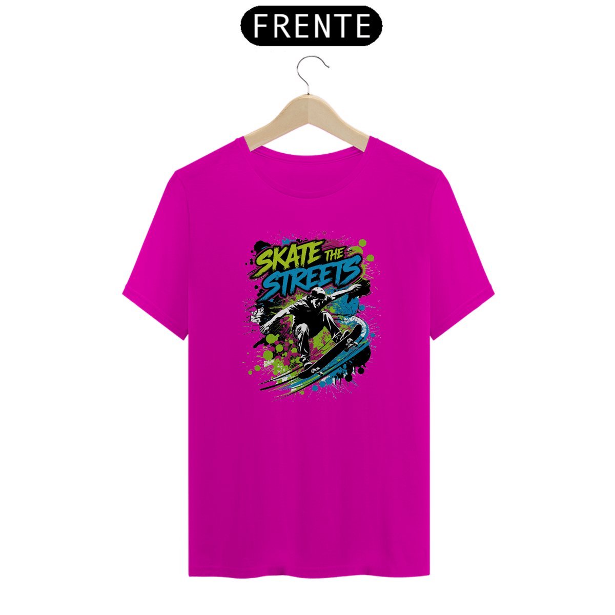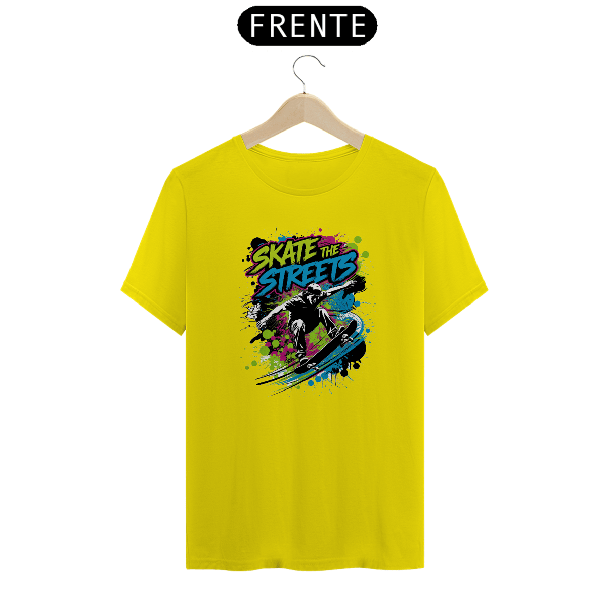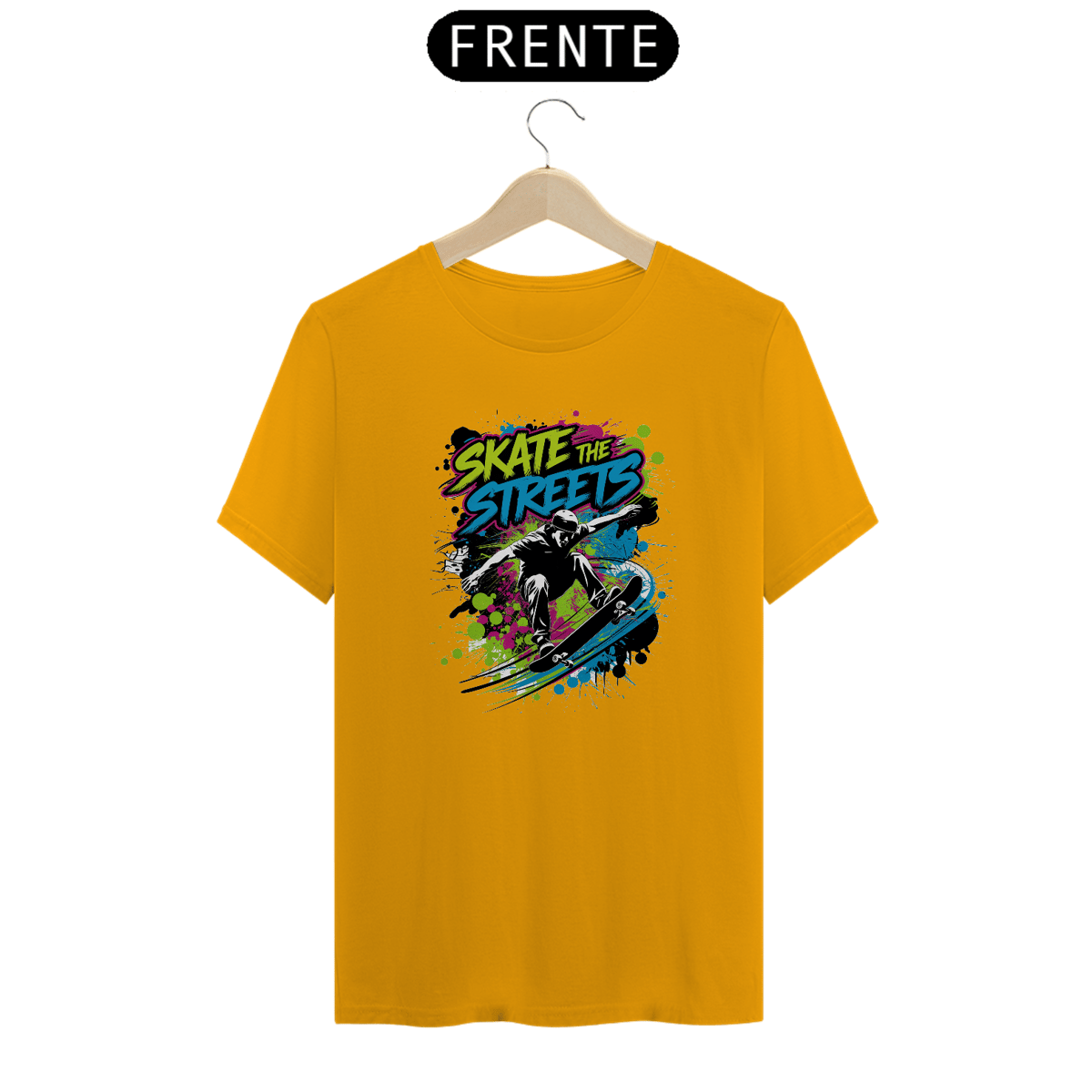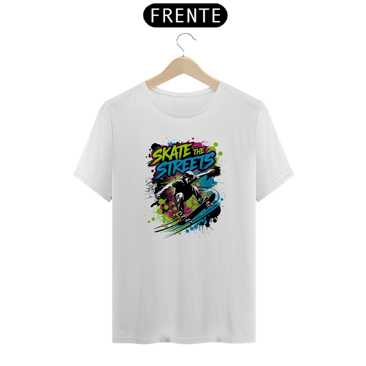 Uma estampa, de inspiração urbana, com um skatista realizando uma manobra. O skatista está no ar, com seu skate girando abaixo dele. O fundo é preenchido com respingos de tinta estilo grafite em cores neon brilhantes. Acima da figura, a tipografia em negrito diz "Skate the Streets". Os respingos de tinta adicionam movimento dinâmico. A estética geral é arte de rua.