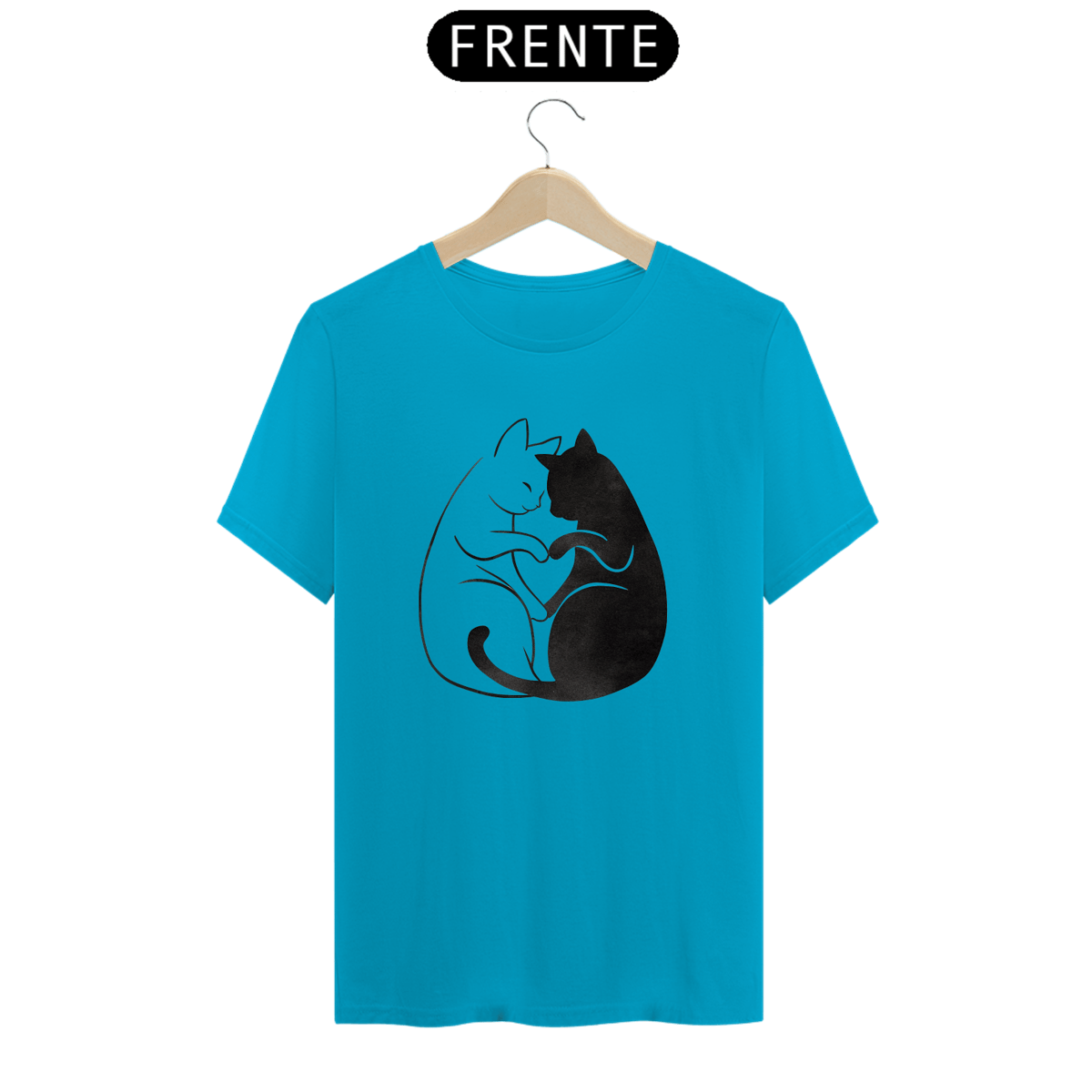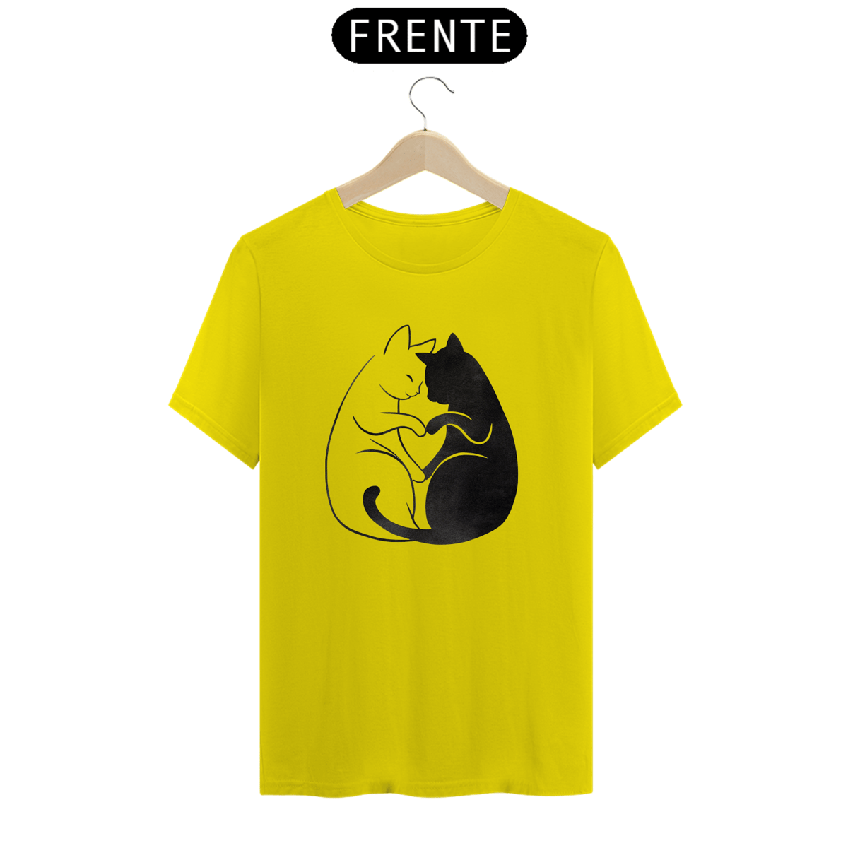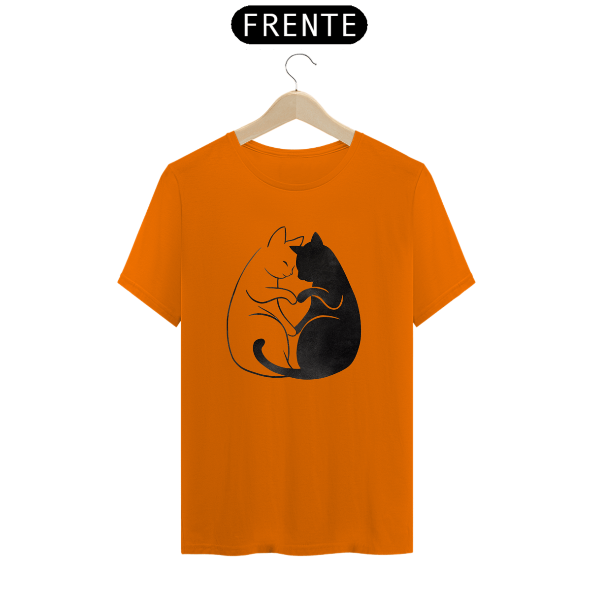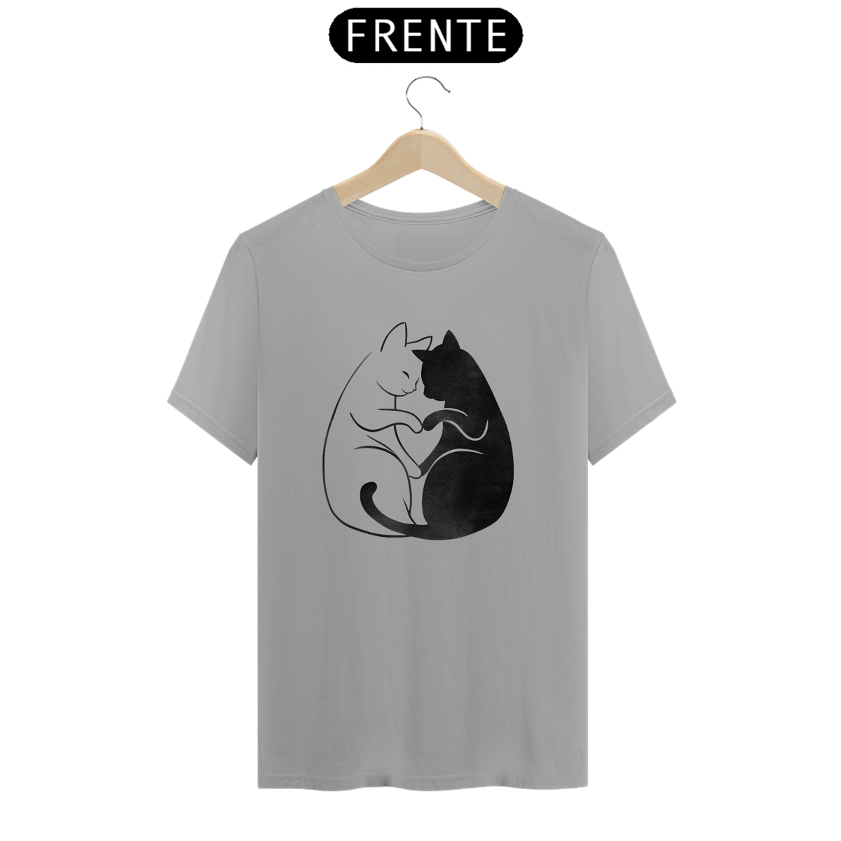 Uma estampa de um gato de acordo com a cor da camisa abraçando gentilmente um gato preto, formando um coração com seus corpos entrelaçados. Os dois gatos são retratados em um estilo simplista, mas expressivo, capturando sua conexão afetuosa.