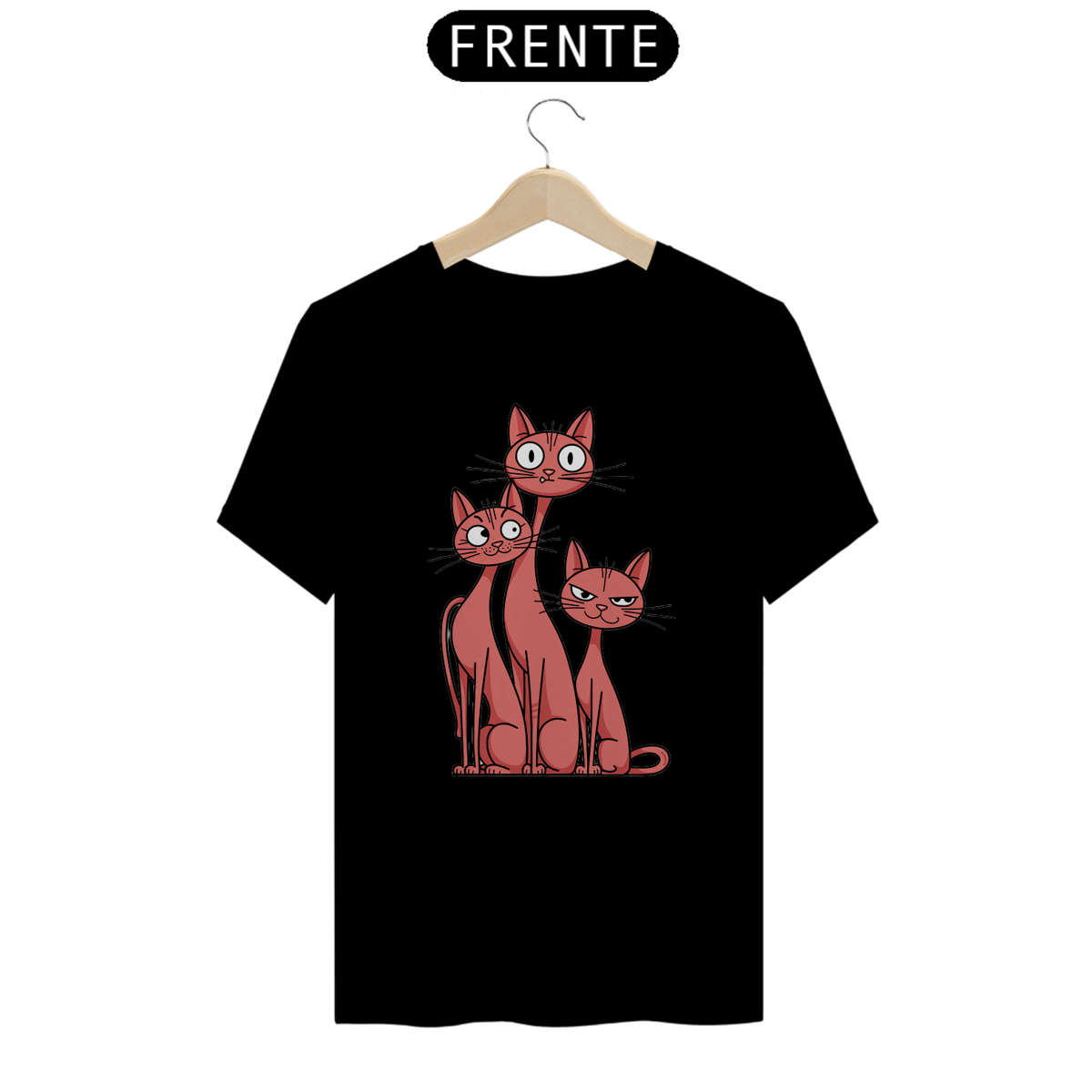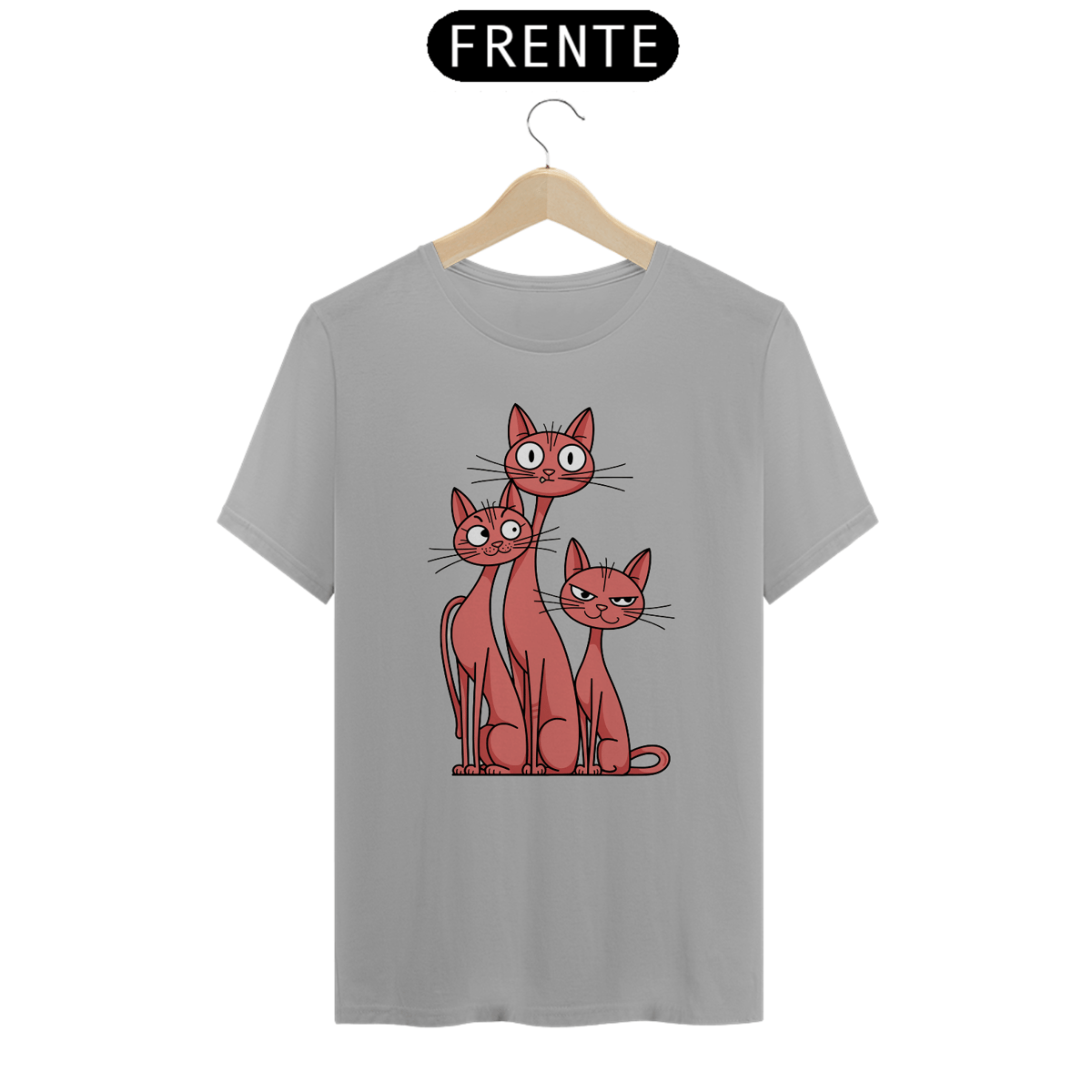 Uma estampa de camiseta divertida e simples de três gatos esbeltos com diferentes expressões e ângulos. O primeiro gato está surpreso e tem os olhos bem abertos. O segundo gato está alerta e tem as orelhas em pé. O terceiro gato está sorrindo e tem os olhos semicerrados. Todos os gatos são de uma cor vermelho-claro que é suave e romântica.
