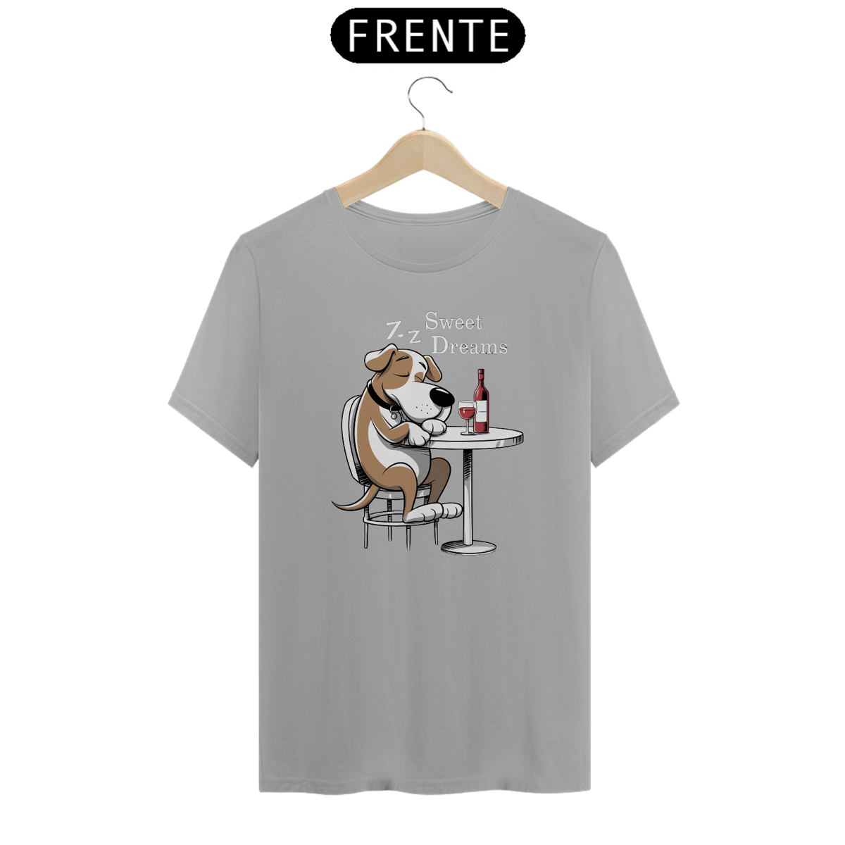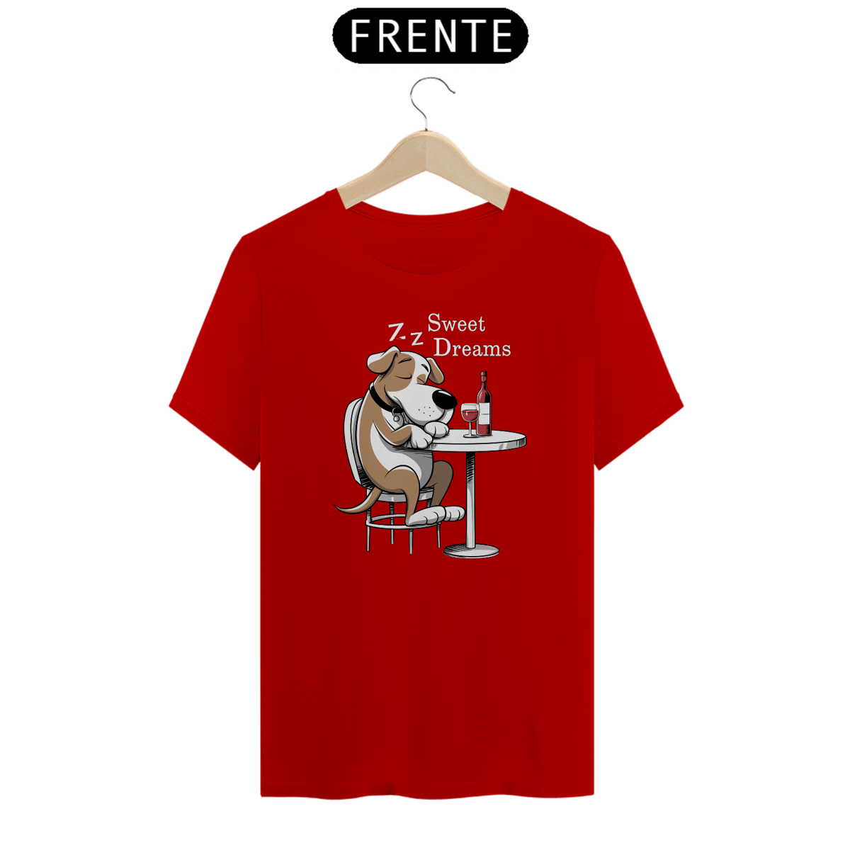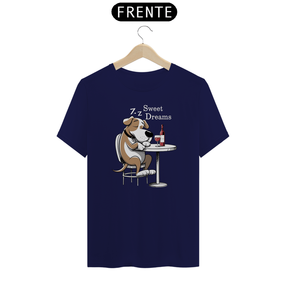 Estampa de um  cachorro de desenho animado está sentado em uma mesa redonda, dormindo com uma garrafa de vinho tinto. O cão está em uma postura relaxada. O fundo é escuro, enfatizando o cachorro e a mesa. As palavras "DOCES SONHOS" são exibidas acima da cabeça do cachorr