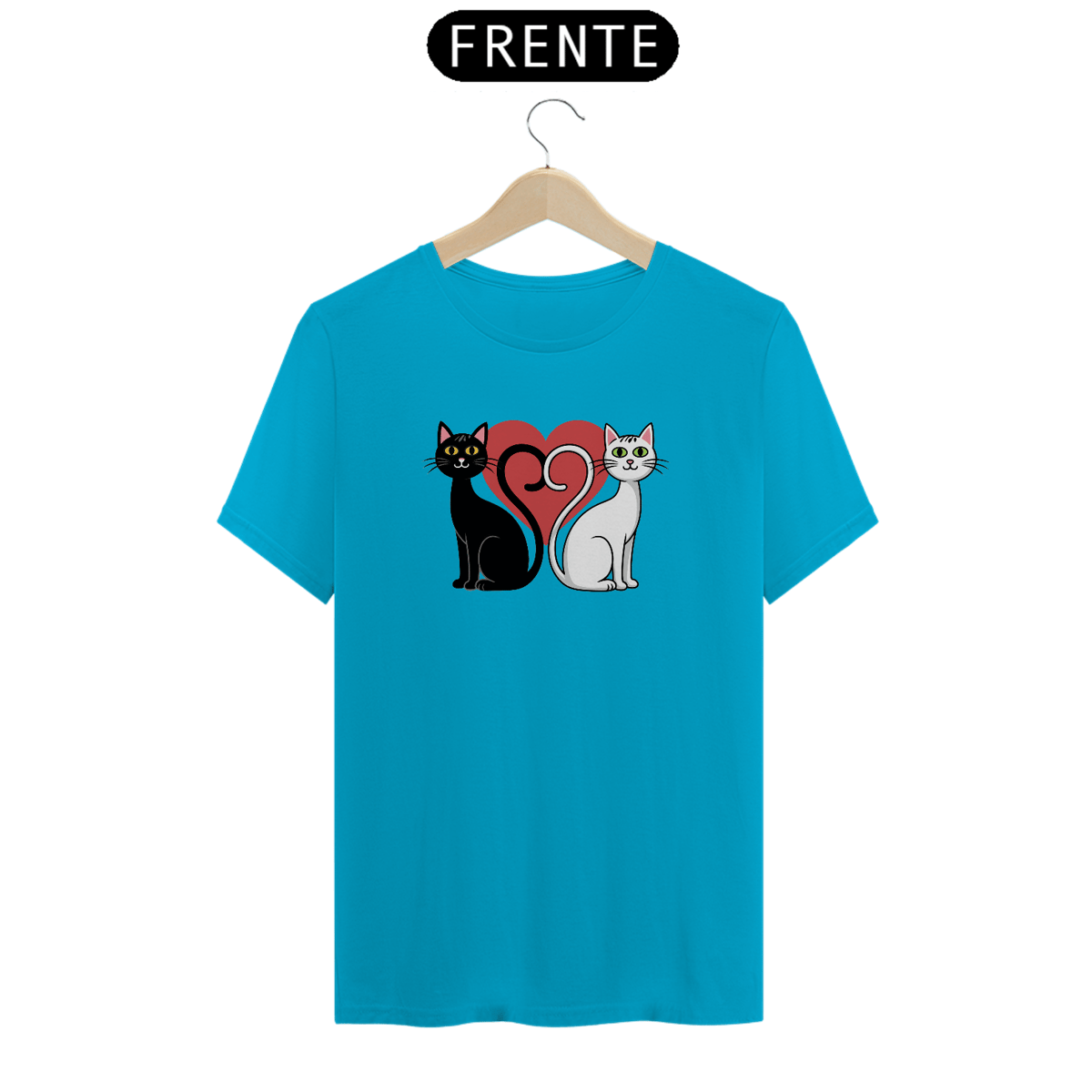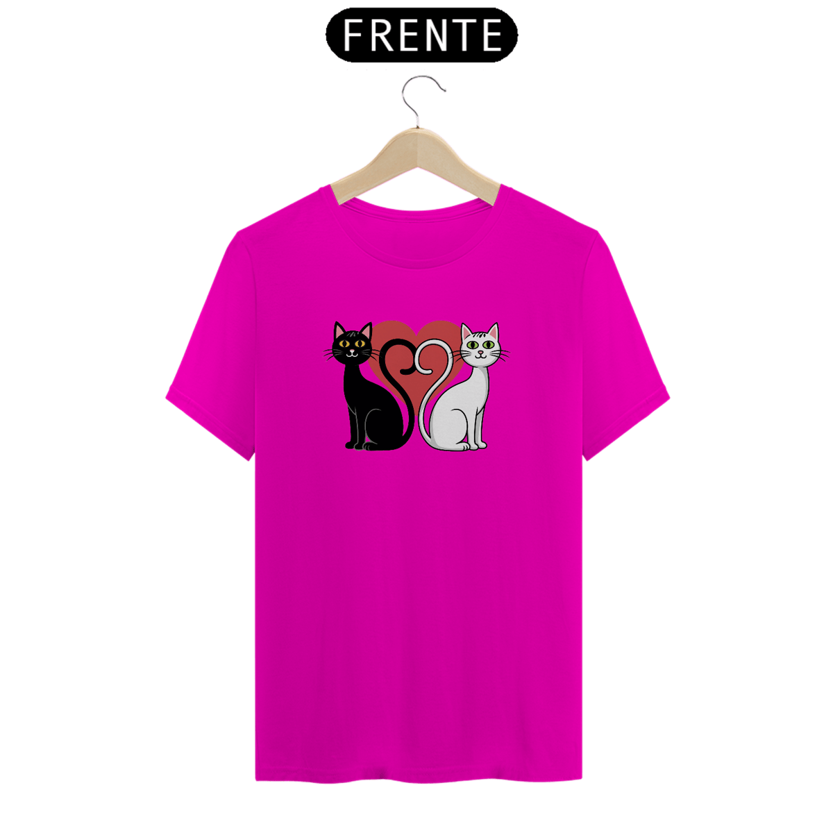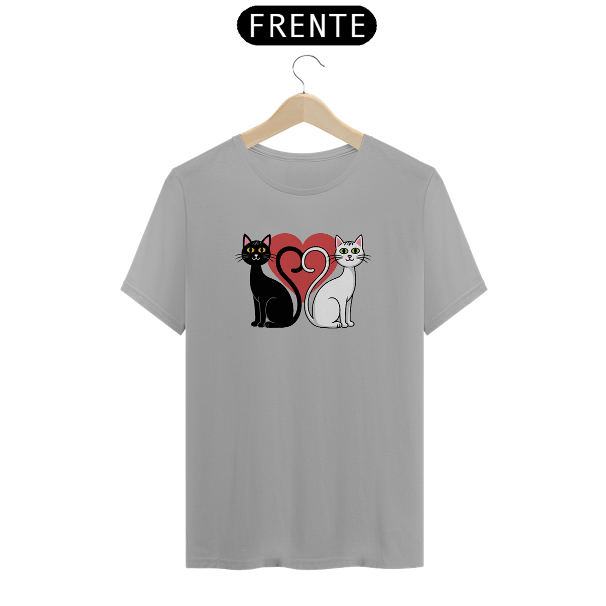 Uma estampa com uma silhueta de gato preto com um gato branco que fazem um coração com o rabo, Camisetas Camaleon Store